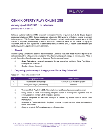 CENNIK OFERTY PLAY ONLINE 2GB obowiązuje od 01.07.2010 r. do odwołania (zmieniony dn. 01.07.2014 r.) Opłaty za wysłanie wiadomości SMS, opisanych w niniejszym Cenniku (w punkcie 2, 7, 8, 9), dotyczą długości pojedynczej wiadomości SMS. Długość pojedynczej wiadomości SMS wysłanej z Modemu, zgodnie z normami technologicznymi ETSI (European Telecommunications Standards Institute), została określona na nie więcej niż 160 znaków. W przypadku jednorazowego przesłania wiadomości zawierającej więcej niż 160 znaków lub więcej niż 1120 bitów, tekst lub dane są dzielone na odpowiednią liczbę wiadomości SMS, z których każda obciążana jest opłatą indywidualnie, zgodnie z niniejszym Cennikiem. 1. Słownik Wszelkie wyrazy lub wyrażenia pisane w treści niniejszego Cennika z dużej litery należy rozumieć zgodnie z ich definicjami zawartymi w Regulaminie świadczenia Usług Telekomunikacyjnych dostępu do Internetu przez P4 sp. z o.o. dla Abonentów, chyba że postanowienia niniejszego Cennika stanowią inaczej. a) Okres Zastrzeżony – czas obowiązywania Umowy zawartej na podstawie Oferty Play Online z umową na czas określony. b) Cennik – niniejszy dokument. 2. Ceny usług podstawowych dostępnych w Ofercie Play Online 2GB Tabela nr 1 Ceny usług podstawowych Lp. Usługa podstawowa Opłata w PLN 1. Wysłanie SMS-a krajowego 0,16 PLN (0,20 PLN z VAT) / SMS 2. Przesyłanie danych (APN Internet) Bezpłatne a) W ramach Oferty Play Online 2GB, Abonent płaci jedną stałą stawkę za poszczególne usługi: b) Opłaty podane w Tabeli 1 nie dotyczą przesyłania danych w roamingu oraz wysyłania SMS na numery opisane w punkcie 7, 8 i 9 niniejszego Cennika. c) Wszelkie odstępstwa od warunków zawartych w Cenniku są możliwe tylko w ramach Ofert Promocyjnych. d) Stosowane w Cenniku określenie „Bezpłatne” oznacza, że opłata za daną usługę jest zawarta w kwocie Abonamentu. e) Opłaty za wysyłanie SMS-a naliczane są poza Abonamentem. P4 SP. Z O.O. / UL. TAŚMOWA 7 / 02-677 WARSZAWA / KRS 0000217207 / XIII WYDZIAŁ GOSPODARCZY KRAJOWEGO REJESTRU SĄDOWEGO SĄD REJONOWY DLA MIASTA STOŁECZNEGO WARSZAWY / NIP 951-21-20-077 / REGON 015808609 / KAPITAŁ ZAKŁADOWY 48 456 500,00 PLN 1 3. Zasady rozliczania usług w Ofercie Play Online 2GB Tabela nr 2 Wysokość Abonamentu i opłata aktywacyjna w Ofercie Play Online 2GB Lp. Rodzaj opłaty Play Online 2 GB 1. Jednorazowa opłata aktywacyjna 48,36 PLN (59,48PLN z VAT) 2. Miesięczny abonament 28,69 PLN (35,29 PLN z VAT) a) W ramach niniejszej Oferty, Abonent może wykupić Abonament w wysokości 35,29 PLN, zgodnie z Tabelą nr 2 powyżej, oraz zawiera Umowę na czas określony - 18 miesięcy (Okres Zastrzeżony). W takim przypadku Abonent otrzymuje Kartę SIM/USIM z Numerem MSISDN (dowolny numer z numeracji krajowej), wraz z Modemem po specjalnej cenie określonej w aktualnym Cenniku Modemów w Ofercie Play Online. b) Za okres od daty aktywacji Numeru MSISDN do ostatniego dnia pierwszego niepełnego Okresu Rozliczeniowego, tj. w przypadku, gdy aktywacja nastąpiła w trakcie Okresu Rozliczeniowego, wartość Abonamentu naliczona jest proporcjonalnie do liczby dni niepełnego Okresu Rozliczeniowego. c) W przypadku rozwiązania Umowy z winy Abonenta przed upływem Okresu Zastrzeżonego (18 miesięcy), opłata specjalna/kara umowna należna Operatorowi, nieprzekraczająca równowartości ulgi przyznanej Abonentowi, będzie pomniejszana o proporcjonalną jej wartość za okres od dnia zawarcia Umowy do dnia jej rozwiązania. d) Po upływie Okresu Zastrzeżonego Umowa przekształca się w Umowę na czas nieokreślony, zaś dotychczasowa wartość Abonamentu pozostaje niezmieniona. e) Dla każdego Abonamentu określony jest indywidualnie Limit Kredytowy w kwocie co najmniej 200 PLN. f) Operator ma prawo do określenia limitu zakupu. Aktualne limity zakupu są dostępne na stronie www.playmobile.pl. Przez „Limit zakupu” należy rozumieć liczbę Umów, jakie Abonent może zawrzeć w każdym trzymiesięcznym okresie, z których pierwszy liczony jest od daty pierwszej aktywacji Numeru MSISDN. g) W przypadkach określonych w Regulaminie Operator może uzależnić podpisanie Umowy z Abonentem lub wykonywanie usług od wpłacenia Kaucji w kwocie nie wyższej niż 4000 PLN albo w kwocie nie wyższej niż dwukrotna wartość opłat należnych Operatorowi z tytułu Umowy w przypadku, gdy wartość należnych opłat będzie wyższa od kwoty 4000 PLN. h) Opłata aktywacyjna (patrz Tabela nr 2) w ramach niniejszej oferty doliczana jest do pierwszego Rachunku Telekomunikacyjnego i nie podlega zwrotowi. i) W Okresie Zastrzeżonym Abonent może zwiększyć wartość swojego Abonamentu. j) W Okresie Zastrzeżonym Abonent nie może zmniejszyć wartości swojego Abonamentu. P4 SP. Z O.O. / UL. TAŚMOWA 7 / 02-677 WARSZAWA / KRS 0000217207 / XIII WYDZIAŁ GOSPODARCZY KRAJOWEGO REJESTRU SĄDOWEGO SĄD REJONOWY DLA MIASTA STOŁECZNEGO WARSZAWY / NIP 951-21-20-077 / REGON 015808609 / KAPITAŁ ZAKŁADOWY 48 456 500,00 PLN 2 k) Zmiana Abonamentu obowiązuje od pierwszego dnia kolejnego, pełnego Okresu Rozliczeniowego następującego po Okresie Rozliczeniowym, w którym Abonent dokonał dyspozycji zmiany. Dyspozycja zmiany Abonamentu powinna być zgłoszona nie później niż czternaście dni roboczych przed końcem bieżącego Okresu Rozliczeniowego. l) W przypadku zgłoszenia zmiany później niż czternaście dni przed końcem bieżącego Okresu Rozliczeniowego, Operator zastrzega możliwość zmiany Abonamentu od pierwszego dnia drugiego pełnego Okresu Rozliczeniowego, po Okresie Rozliczeniowym, w którym Abonent dokonał dyspozycji zmiany. m) W wyniku zmiany Abonamentu Abonent traci wszystkie uprawnienia lub usługi uzyskane przez Abonenta na podstawie Ofert Promocyjnych, oraz wszystkie rabaty lub usługi przyznane w drodze indywidualnych ustaleń z P4. n) Dyspozycja zmiany Abonamentu może być złożona poprzez zalogowanie się na