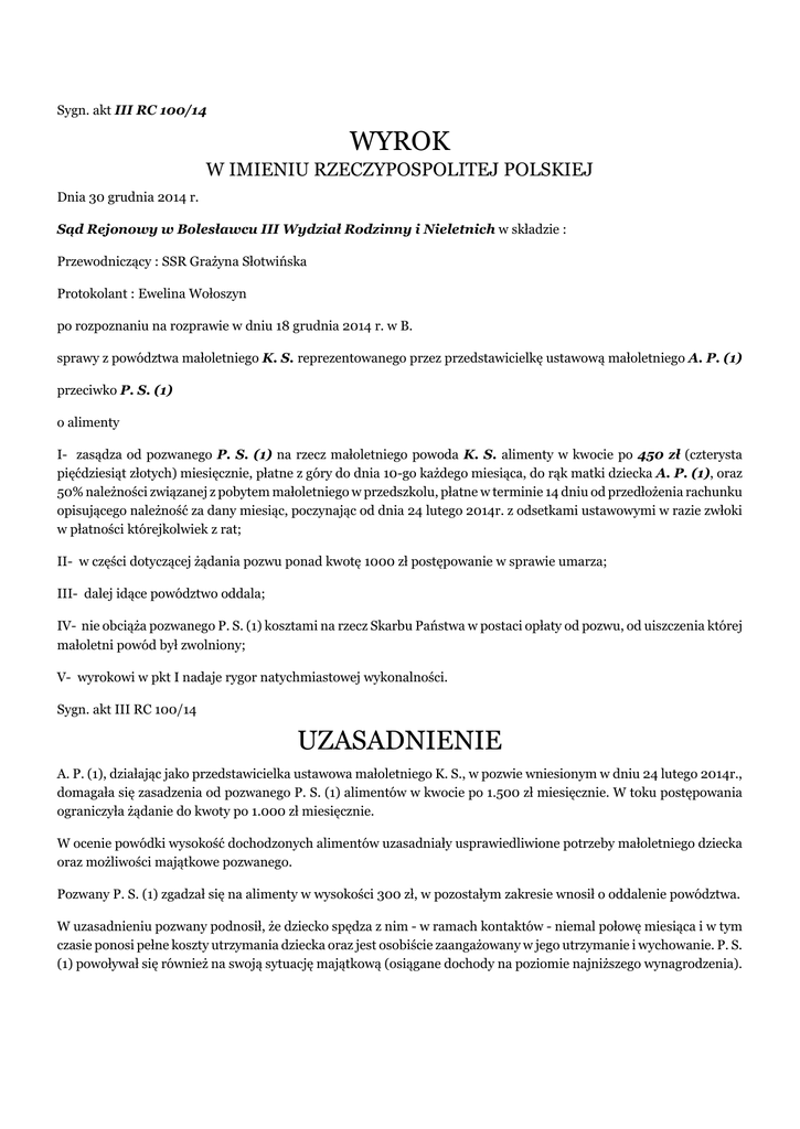 Sygn. akt III RC 100/14 WYROK W IMIENIU RZECZYPOSPOLITEJ POLSKIEJ Dnia 30 grudnia 2014 r. Sąd Rejonowy w Bolesławcu III Wydział Rodzinny i Nieletnich w składzie : Przewodniczący : SSR Grażyna Słotwińska Protokolant : Ewelina Wołoszyn po rozpoznaniu na rozprawie w dniu 18 grudnia 2014 r. w B. sprawy z powództwa małoletniego K. S. reprezentowanego przez przedstawicielkę ustawową małoletniego A. P. (1) przeciwko P. S. (1) o alimenty I- zasądza od pozwanego P. S. (1) na rzecz małoletniego powoda K. S. alimenty w kwocie po 450 zł (czterysta pięćdziesiąt złotych) miesięcznie, płatne z góry do dnia 10-go każdego miesiąca, do rąk matki dziecka A. P. (1), oraz 50% należności związanej z pobytem małoletniego w przedszkolu, płatne w terminie 14 dniu od przedłożenia rachunku opisującego należność za dany miesiąc, poczynając od dnia 24 lutego 2014r. z odsetkami ustawowymi w razie zwłoki w płatności którejkolwiek z rat; II- w części dotyczącej żądania pozwu ponad kwotę 1000 zł postępowanie w sprawie umarza; III- dalej idące powództwo oddala; IV- nie obciąża pozwanego P. S. (1) kosztami na rzecz Skarbu Państwa w postaci opłaty od pozwu, od uiszczenia której małoletni powód był zwolniony; V- wyrokowi w pkt I nadaje rygor natychmiastowej wykonalności. Sygn. akt III RC 100/14 UZASADNIENIE A. P. (1), działając jako przedstawicielka ustawowa małoletniego K. S., w pozwie wniesionym w dniu 24 lutego 2014r., domagała się zasadzenia od pozwanego P. S. (1) alimentów w kwocie po 1.500 zł miesięcznie. W toku postępowania ograniczyła żądanie do kwoty po 1.000 zł miesięcznie. W ocenie powódki wysokość dochodzonych alimentów uzasadniały usprawiedliwione potrzeby małoletniego dziecka oraz możliwości majątkowe pozwanego. Pozwany P. S. (1) zgadzał się na alimenty w wysokości 300 zł, w pozostałym zakresie wnosił o oddalenie powództwa. W uzasadnieniu pozwany podnosił, że dziecko spędza z nim - w ramach kontaktów - niemal połowę miesiąca i w tym czasie ponosi pełne koszty utrzymania dziecka oraz jest osobiście zaangażowany w jego utrzymanie i wychowanie. P. S. (1) powoływał się również na swoją sytuację majątkową (osiągane dochody na poziomie najniższego wynagrodzenia). Zgodnie z wnioskiem zawartym w pozwie, Sąd udzielił w sprawie zabezpieczenia - ostatecznie, uwzględniając w części zażalenie wniesione przez pozwanego - zobowiązał pozwanego do płacenia na syna, przez czas trwania postępowania po 400 zł miesięcznie i ponoszenia ½ opłaty miesięcznej za przedszkole. Po przeprowadzeniu w sprawie postępowania dowodowego Sąd ustalił w sprawie co następuje: Małoletni K. S. urodził się (...) Mieszka wraz z matką w B.. Zgodnie z ugodą zawartą prze tut. Sądem w sprawie I. N. 103/14, pozwany ma prawo do kontaktów z synem w drugi, trzeci i czwarty weekend w miesiącu, od piątku wieczór do wtorku rano. Z matką dziecko ma spędzać jeden weekend w miesiącu. Pod bezpośrednią pieczą matki - poza weekendem, o którym wyżej - dziecko jest w dni powszednie, od wtorku od powrotu z przedszkola do piątkowego popołudnia. Strony uzgodniły, ze koszty zorganizowania opieki nad dzieckiem na czas pracy zawodowej A. P. (1) będą ponosiły po połowie. Ustalenia te są dotrzymywane. Do marca bieżącego roku małoletni miał opiekunkę, której miesięczne wynagrodzenie wynosiło 800 zł. Od kwietnia uczęszcza do przedszkola, co wiąże się z opłata 360 zł miesięcznie. W pierwszym miesiącu dodatkowo trzeba było zapłacić 242 zł wpisowego wraz z ubezpieczeniem. W skali miesiąca matkę obciąża koszt wyżywienia dziecka (ponadto, co dziecko zjada w przedszkolu), zakup odzieży, środków higieny, zabawek. Jeżeli chodzi o skalę wydatków na zaspokojenie powyższych potrzeb dziecka A. P. (1) nie jest konsekwentna np. raz liczy, że średnie miesięczne koszty zakupu odzieży i obuwia dla dziecka to 100 zł, innym razem, że jest to 600 zł. Dziecko ma wykupioną polisę, której miesięczna składka wynosi 140 zł. A. P. (1) mieszka wraz z dzieckiem w wynajętym mieszkaniu. Koszty z tym związane to 1.200 zł czynszu i 200-300 zł miesięcznie za pozostałe opłaty (światło, gaz, Internet, kablówkę). Spłaca kredyt zaciągnięty na wyposażenie mieszkania i remont samochodu w ratach po 998 zł miesięcznie. Posiada samochód (V. (...) rocznik 2003), który służy głównie zawożeniu dziecka do przedszkola, i koszty utrzymania którego, w 70 %, liczy jako koszt utrzymania dziecka. Wg. wyliczeń A. P. (1), na dziecko miesięcznie przypada ok. 160 zł za paliwo i 240 zł kosztów stałych (ubezpieczenie OC, AC, przeglądy). Matka małoletniego jest zatrudniona w firmie (...) Spółka z o.o. w B. jako specjalista do spraw logistyki i zarabia netto 4.500 zł miesięcznie. Dowód: akt urodzenia małoletniego k. 6, przedwstępna umowa najmu k.7, umowa o pracę A. P. k.8-9, umowa pożyczki k. 10-11, informacja dotycząca ubezpieczenia na wypadek śmierci k. 12, faktury za gaz i energię elektryczną k. 13-14, zaświadczenie o zarobkach A. P. k. 46, zeznania A. P. (1) k. 51 i 181-182, potwierdzenie operacji bankowych dokonywanych na rachunku bankowym A. P. w (...) Banku SA k. 189-261. Pozwany P. S. (1) z zawodu jest t. d.. Pracuje w tym charakterze w (...) w Ś., od 4 lat, za najniższym wynagrodzeniem tj. 1.680 zł miesięcznie brutto, netto ok. 1.340 zł. Był okres, że pozwany miał własną działalność i jak ocenia miał z tego dochód „na czysto” w granicach 2.500 zł miesięcznie. Z działalności zrezygnował po śmierci lekarza, z którym współpracował i który zapewniał mu lokal na działalność. Wynagrodzenie za pracę P. S. (1) nie jest przelewane na jego konto w banku. Na konto w (...) Banku trafiają tylko wpłaty dokonywane przez pozwanego, niezbędne do obsługi stałych zobowiązań. Pozwany spłaca kredyt zaciągnięty na zakup mieszkania w miesięcznych ratach po 7