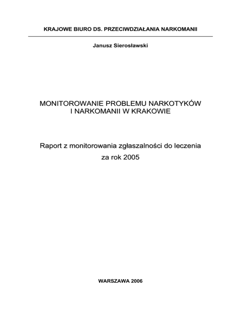 KRAJOWE BIURO DS. PRZECIWDZIAŁANIA NARKOMANII Janusz Sierosławski MONITOROWANIE PROBLEMU NARKOTYKÓW I NARKOMANII W KRAKOWIE Raport z monitorowania zgłaszalności do leczenia za rok 2005 WARSZAWA 2006 SPIS TREŚCI: Strona WPROWADZENIE ..................................................................................... 3 METODA I MATERIAŁ BADAWCZY .................................................... 4 WYNIKI ...................................................................................................... 5 Rozmiary zgłaszalności do leczenia .................................................... 6 Charakterystyka społeczno-demograficzna ......................................... 7 Wzory używania narkotyków .............................................................. 9 Zachowania ryzykowne ....................................................................... 10 Zakażenia HIV ..................................................................................... 12 Charakterystyka zgłoszenia ................................................................. 13 PODSUMOWANIE WYNIKÓW ............................................................... 14 WNIOSKI .................................................................................................... 15 PRZYPISY ................................................................................................... 16 TABELE ...................................................................................................... 18 2 WPROWADZENIE Projekt badawczy „Multi-City Study” zainicjowany został we współpracy z Grupą Pompidou. Grupa Pompidou działa przy Radzie Europy i zajmuje się koordynacją współpracy krajów członkowskich w zapobieganiu narkomanii. W jej ramach dzałał Zespół Ekspertów ds. Epidemiologii Narkomanii, który odpowiedzialny był za monitorowanie sytuacji epidemiologicznej. Jednym z przedsięwzięć tego zespołu jest właśnie projekt „Multi-City Study”, zainicjowany w końcu lat osiemdziesiątych i rozszerzony na kraje Europu Środkowej i Wschodniej w 1994 r. Zasadniczym celem tego projektu było stałe monitorowanie sceny lekowej w poszczególnych miastach, wystandaryzowanymi metodami, co zapewnić miało porównania międzynarodowe. Możliwość porównywania trendów w różnych krajach stwarza podstawy do lepszej koordynacji działań w skali międzynarodowej i przyczynia się do lepszego rozumienia prawidłowości rządzących rozwojem zjawiska. Pogłębione badania epidemiologiczne na poziomie miasta są znacznie tańsze i mniej kosztowne od badań na poziomie kraju. Obraz dynamiki sceny lekowej monitorowanego miasta może być, z pewnymi ograniczeniami, traktowany jako przybliżenie obrazu rozwoju sytuacji na poziomie kraju. Stanowi też uzupełnienie i pogłębienie obrazu wyłaniającego się z analiz statystyk ogólnokrajowych. Stałe monitorowanie sytuacji epidemiologicznej dostarcza przede wszystkim przesłanek do planowania działań profilaktycznych na poziomie lokalnym. Stanowić też może dogodny instrument pozyskiwania danych stanowiących podstawę oceny ich skuteczności. Korzyści z podjęcia programu dotyczą zatem nie tylko skali międzynarodowej, czy ogólnokrajowej ale przede wszystkim poziomu miasta. Dobre rozeznanie epidemiologiczne wydaje się niezbędne do wyboru priorytetów i optymalnej alokacji szczupłych środków na profilaktykę i lecznictwo. Dzięki niemu uniknąć można błędnych decyzji pociągających niejednokrotnie za sobą marnowanie funduszy publicznych. 3 METODA I MATERIAŁ BADAWCZY W monitorowaniu problemu narkomanii w Krakowie, podobnie jak w Warszawie podstawą analiz jest wielowskaźnikowe podejście - ocena rozpowszechnienia zjawiska i trendów w jego rozwoju dokonywana jest na podstawie analizy wielu wskaźników dotyczących różnych aspektów „sceny lekowej” (Hartnoll 1994, Stauffacher 1999). Podstawowym, najlepiej wystandaryzowanym wskaźnikiem jest zgłaszalność do leczenia (first treatment demand). Zbieranie danych dotyczących tego wskaźnika rozpoczęto w Warszawie i w Gdańsku w 1995 r., później dołączył Kraków. Prace związane z monitorowaniem w Krakowie finansowane są przez Krajowe Biuro ds. Przeciwdziałania Narkomanii. Leczenie i rehabilitację osób uzależnionych w Krakowie zapewniają następujące placówki specjalistyczne: 1. Poradnia Profilaktyki i Terapii Uzależnień „Monar”, ul. Św. Katarzyny 3 2. Małopolskie Centrum Profilaktyki i Terapii Uzależnień (poradnia), ul. Krakowska 39 3. Oddział Detoksykacji Kliniki Toksykologii Wojewódzkiego Szpitala Specjalistycznego im. L. Rydygiera, os. Złotej Jesieni 1 4. Ośrodek Leczenia Uzależnień „Formacja” (ośrodek rehabilitacyjny), ul. Różana 3 5. Ośrodek Rehabilitacyjno-Readaptacyjny „Dom Monaru”, Pleszów, ul. Suchy Jar 4 6. Ośrodek Leczniczo Rehabilitacyjny dla Osób Uzależnionych (oddział detoksykacyjny), Pleszów, ul. Suchy Jar 4a Wszystkie te placówki objęte są monitorowaniem. Poza systemem pozostają osoby uzależnione, które w niewielkiej liczbie trafiają do poradni zdrowia psychicznego i poradni odwykowych przeciwalkoholowych, a także sporadycznie na oddziały ogólnopsychiatryczne szpitali psychiatrycznych. W oddziałach i placówkach ogólnopsychiatrycznych rzadko spotyka się osoby uzależnione wywodzące się z kręgów subkultury lekowej. Częściej są to przypadki osób uzależnionych od leków uspokajających i nasennych niekiedy łączonych z alkoholem, osoby ze środowiska służby zdrowia lub ludzie uzależnieni od leków w wyniku przebytej kuracji. 4 Lecznictwo ogólne praktycznie nie jest włączone w pomoc osobom uzależnionym. Narkomani korzystając z pomocy lekarza ogólnego często ukrywają swój problem lekowy w obawie przed odrzuceniem lub złym traktowaniem. Podstawą monitorowania w placówkach specjalistycznych dla narkomanów w Krakowie są indywidualne kwestionariusze wypełniane są przy pierws