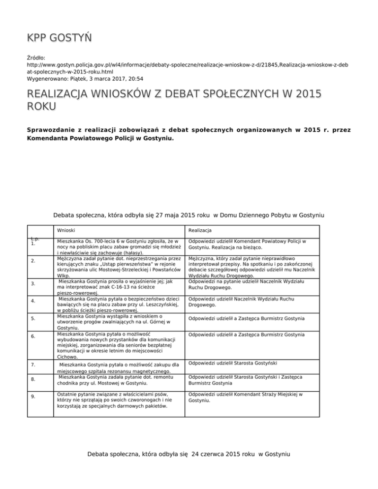 KPP GOSTYŃ Źródło: http://www.gostyn.policja.gov.pl/wl4/informacje/debaty-spoleczne/realizacje-wnioskow-z-d/21845,Realizacja-wnioskow-z-deb at-spolecznych-w-2015-roku.html Wygenerowano: Piątek, 3 marca 2017, 20:54 REALIZACJA WNIOSKÓW Z DEBAT SPOŁECZNYCH W 2015 ROKU Sprawozdanie z realizacji zobowiązań z debat społecznych organizowanych w 2015 r. przez Komendanta Powiatowego Policji w Gostyniu. Debata społeczna, która odbyła się 27 maja 2015 roku w Domu Dziennego Pobytu w Gostyniu L.p. 1. 2. 3. 4. 5. 6. 7. 8. 9. Wnioski Realizacja Mieszkanka Os. 700-lecia 6 w Gostyniu zgłosiła, że w nocy na pobliskim placu zabaw gromadzi się młodzież i niewłaściwie się zachowuje (hałasy). Mężczyzna zadał pytanie dot. nieprzestrzegania przez kierujących znaku „Ustąp pierwszeństwa” w rejonie skrzyżowania ulic Mostowej-Strzeleckiej i Powstańców Wlkp. Mieszkanka Gostynia prosiła o wyjaśnienie jej; jak ma interpretować znak C-16-13 na ścieżce pieszo-rowerowej. Mieszkanka Gostynia pytała o bezpieczeństwo dzieci bawiących się na placu zabaw przy ul. Leszczyńskiej, w pobliżu ścieżki pieszo-rowerowej. Mieszkanka Gostynia wystąpiła z wnioskiem o utworzenie progów zwalniających na ul. Górnej w Gostyniu. Mieszkanka Gostynia pytała o możliwość wybudowania nowych przystanków dla komunikacji miejskiej, zorganizowania dla seniorów bezpłatnej komunikacji w okresie letnim do miejscowości Cichowo. Odpowiedzi udzielił Komendant Powiatowy Policji w Gostyniu. Realizacja na bieżąco. Mieszkanka Gostynia pytała o możliwość zakupu dla miejscowego szpitala rezonansu magnetycznego. Mieszkanka Gostynia zadała pytanie dot. remontu chodnika przy ul. Mostowej w Gostyniu. Odpowiedzi udzielił Starosta Gostyński Ostatnie pytanie związane z właścicielami psów, którzy nie sprzątają po swoich czworonogach i nie korzystają ze specjalnych darmowych pakietów. Odpowiedzi udzielił Komendant Straży Miejskiej w Gostyniu. Mężczyzna, który zadał pytanie nieprawidłowo interpretował przepisy. Na spotkaniu i po zakończonej debacie szczegółowej odpowiedzi udzielił mu Naczelnik Wydziału Ruchu Drogowego. Odpowiedzi na pytanie udzielił Naczelnik Wydziału Ruchu Drogowego. Odpowiedzi udzielił Naczelnik Wydziału Ruchu Drogowego. Odpowiedzi udzielił a Zastępca Burmistrz Gostynia Odpowiedzi udzielił a Zastępca Burmistrz Gostynia Odpowiedzi udzielił Starosta Gostyński i Zastępca Burmistrz Gostynia Debata społeczna, która odbyła się 24 czerwca 2015 roku w Gostyniu L.p. 1. 2. 3. 4. 5. 6. 7. 8. 9. 10. 11. 12. 13. 14. 15. Wnioski Realizacja Mieszkaniec Gostynia złożył pisemna skargę na ręce Zastępcy Komendanta Wojewódzkiego Policji w Poznaniu. Skarga zgłoszona była na policjantów WRD KWP Poznań, którzy w jego ocenie niesłusznie zatrzymali dowód rejestracyjny, którym jeździł jego pracownik. Mieszkaniec ul. Tkackiej w Gostyniu zgłosił, ze znak zakaz postoju na tej ulicy nie jest respektowany przez kierowców Mieszkaniec Gostynia pytał o obwodnicę dla miasta Gostynia i dlaczego ruch pojazdów ciężarowych mógł być wycofany z centrum miasta w takie dni jak „Dni Gostynia’, „Dzień Mleka”, a w inne dni nie można Mieszkaniec Gostynia pytał o oznakowanie dróg w takie dni jak „Dni Gostynia”. W jego ocenie są mało czytelne przez co ludzie jeżdżą na pamięć Mieszkaniec Gminy Gostyń zgłosił uwagę dotyczącą świateł do jazdy dziennej. Niektórzy kierowcy nie używają tych świateł lub są jego zdaniem niezgodne z przepisami Mężczyzna zadał pytanie dotyczące strefy inwestycyjnej w Czachorowie. Prosi o wyznaczenie przejścia dla pieszych Uczeń ZSR w Grabonogu (klasa policyjna) zadał pytanie o dofinansowanie wyjazdu do Kiekrza Zastępca Komendanta Wojewódzkiego Policji przyjął skargę i poinformował, zgłaszającego, ze otrzyma pisemną odpowiedź Uczeń ZSR w Grabonogu (klasa policyjna) zadał pytanie o możliwość zwiększenia ilości zajęć praktycznych dla uczniów klas policyjnych z policjantami Uczeń ZSR w Grabonogu (klasa policyjna) zadał pytanie o możliwość powstania nowego boiska na terenie szkoły Mężczyzna z sali zwrócił uwagę, że rowerzyści często przejeżdżają po przejściach dla pieszych Mężczyzna z sali zwrócił uwagę, że część kierowców nie umie zachować się na skrzyżowaniu w ruchu okrężnym - rondzie przy zmianie pasa ruchu Mężczyzna z sali pytał o zbyt jego zdaniem gęsto posadzone drzewa przy drodze wojewódzkiej W 434. Mężczyzna z sali zwrócił uwagę, ze na drodze Strzelce Wielkie – Piaski droga i ścieżka rowerowa są porośnięte krzewami Mężczyzna z sali pytał o ustawienie podczas kontroli radiowozu policyjnego i policjantów chowających się w tzw. „krzakach”. Mieszkanka gminy Krobia pytała o to, czy jest możliwość przeprowadzenia kursu z samoobrony dla kobiet w miejscowości Krobia Odpowiedzi udzielił Zastępca Komendanta Wojewódzkiego Policji w Poznaniu i Naczelnik WRD KPP Gostyń Odpowiedzi udzielił Wicewojewoda, Starosta Gostyński i Zastępca Komendanta Wojewódzkiego Policji w Poznaniu Odpowiedzi udzielił Naczelnik Wydziału Ruchu Drogowego. Odpowiedzi udzielił Naczelnik Wydziału Ruchu Drogowego. Odpowiedzi udzielił Starosta Gostyński Odpowiedzi udzielili Wicewojewoda, Starosta Gostyński i Zastępca Komendanta Wojewódzkiego Policji w Poznaniu Odpowiedzi udzielił Zastępca Komendanta Wojewódzkiego Policji w Poznaniu Odpowiedzi udzielił Starosta Gostyński Odpowiedzi udzielił Zastępca Komendanta Wojewódzkiego Policji w Poznaniu Odpowiedzi udzielił Zastępca Komendanta Wojewódzkiego Policji w Poznaniu Odpowiedzi udzielił Zastępca Komendanta Wojewódzkiego Policji w Poznaniu i Naczelnik WRD KPP Gostyń Odpowiedzi udzielił Starosta Gostyński Odpowiedzi udzielił Zastępca Komendanta Wojewódzkiego Policji w Poznaniu i Naczelnik WRD KPP Gostyń Odpowiedzi udzielił Komendant Powiatowy Policji w Gostyniu Debata społ
