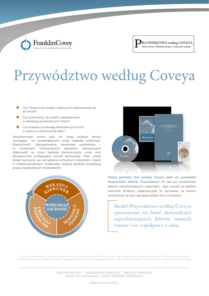 RZYWÓDZTWO wedlug COVEYA ® Przywództwo według Coveya ■■ ■■ ■■ Czy Twoja firma szybko i elastycznie dostosowuje się do zmian? Czy pracownicy są w pełni zaangażowani w realizację jej kluczowych celów? Czy budujesz przewagę konkurencyjną firmy w oparciu o potencjał jej kadr? Nieuchronność zmian oraz ich coraz szybsze tempo wymagają od przedsiębiorstw coraz większej mobilizacji. Elastyczność, zaangażowanie, doskonała współpraca – to fundament innowacyjnych zespołów, stanowiących odpowiedź na coraz bardziej konkurencyjny rynek oraz błyskawicznie postępujący rozwój technologii. Mało znane dotąd wyzwania, jak zarządzanie wirtualnymi zespołami, często w międzynarodowym środowisku, jeszcze bardziej komplikują pracę współczesnych menedżerów. Palącą potrzebą firm według Coveya stało się posiadanie doskonałych liderów. Przywództwo nie jest już wyróżnikiem jedynie najwybitniejszych organizacji. Jego rozwój na każdym poziomie struktury organizacyjnej to wyzwanie, na którym koncentruje się dziś najwięcej szefów firm na świeciel. Model Przywództwa według Coveya opracowano na bazie doświadczeń najwybitniejszych liderów naszych czasów i we współpracy z nimi. 1) Źródło: „Capitalizing on Complexity: Insights from the Global Chief Executive Officer Study”, raport opracowany na podstawie rozmów z 1 541 prezesami zarządów i dyrektorami generalnymi najbardziej znanych przedsiębiorstw na świecie, przeprowadzonych między wrześniem 2009 r. a styczniem 2010 r., na zlecenie IBM Corporation. PRZYWÓDZTWO | WDROZENIE STRATEGII | PRODUKTYWNOŚĆ PRAKTYKA ZAUFANIA | EFEKTYWNOŚĆ SPRZEDAŻY FRANKLINCOVEY.PL ® ■■ 4 Imperatywy Lidera Badania FranklinCovey ujawniają problemy, które są powszechnie spotykane we współczesnych przedsiębiorstwach. Najważniejszy z nich to brak przejrzystej wizji rozwoju lub nieznajomość celów firmy na niższych poziomach organizacji. Biurokratyczne procedury, niedostosowane procesy i struktury utrudniają codzienną pracę. Inny poważny problem to brak zaufania. W konsekwencji, organizacje nie potrafią w pełni wykorzystać potencjału pracowników. Przywództwo według Coveya jest odpowiedzią na te wyzwania. Proponuje uczestnikom najlepsze praktyki, stosowane przez wybitnych liderów, którzy: ■■ ■■ ■■ ■■ Każdy uczestnik otrzymuje materiały do wykorzystania po szkoleniu: ■■ ■■ podręcznik uczestnika, kontrakt i Niezbędnik Lidera zawierający m.in.: • wybór fragmentów najwartościowszych książek i artykułów z zarządzania i przywództwa, • odpowiedzi Stephena R. Covey’a na pytania najczęściej zadawane przez menedżerów, • opis metod i narzędzi ze szkolenia; wskazują kierunek i sprawiają, że praca zespołów koncentruje się na realizacji najważniejszych celów firmy, ■■ dostosowują systemy, aby rozwiązania organizacyjne wspierały pracowników w pełnym angażowaniu się w realizację celów przedsiębiorstwa, ■■ ■■ uwalniają potencjał pracowników. Wdrożenie Przywództwa według Coveya Warsztaty wykraczają poza granice standardowego szkolenia. Wykorzystują podejście procesowe, dzięki czemu uczestnicy są zmotywowani do indywidualnej pracy po treningu. ■■ LQ2 – ponowna ocena Współczynnika Przywództwa, realizowana minimum 6 miesięcy po szkoleniu. wzbudzają zaufanie i na nim opierają swój autorytet, podnosząc w ten sposób zaangażowanie współpracowników, Podczas szkolenia uczestnicy poznają nowe podejście, uczą się metod i narzędzi, a następnie wykorzystują je do opracowania rozwiązań własnych problemów. ■■ ■■ Spotkanie podsumowujące – z przełożonym lub coachem, poświęcone analizie postępów i dalszym działaniom rozwojowym pracownika. LQ1 (Leadership Quotient - Współczynnik Przywództwa) – to ocena kompetencji przywódczych uczestnika, w oparciu o badanie typu feedback 360°, odwołujące się do modelu 4 Imperatywów Lidera. Warsztaty – w trakcie zajęć uczestnicy tworzą plan indywidualnego rozwoju kompetencji przywódczych, w oparciu o wyniki badania LQ. LQ1 Przywództwo wegług Coveya płytę CD z narzędziami ze szkolenia gotowymi do natychmiastowego wdrożenia w firmie, zasoby on-line zawierające m.in. filmy ze szkolenia, książkę Stephena R. Covey’a. Nasza rekomendacja: proces kształcenia liderów w firmie warto zacząć od szkolenia 7 Nawyków skutecznego działania, które pomaga rozwijać kompetencje osobiste uczestników. Pierwszym krokiem w kształceniu liderów jest często rozwinięcie ich umiejętności menedżerskich, zgodnie z metodologią firmy FranklinCovey. Polecamy szkolenie 7 Nawyków skutecznego menedżera, idealne dla mniej doświadczonych menedżerów oraz osób przygotowujących się do objęcia stanowisk kierowniczych. Przywództwo według Coveya to rozwiązanie, dzięki któremu liderzy w twojej organizacji będą w stanie sprostać wyzwaniom nowych czasów. Kontrakt Lidera Warsztaty Spotkanie podsumowujące LQ2 3 miesiące 6 miesięcy PRZYWÓDZTWO | WDROZENIE STRATEGII | PRODUKTYWNOŚĆ PRAKTYKA ZAUFANIA | EFEKTYWNOŚĆ SPRZEDAŻY FRANKLINCOVEY.PL