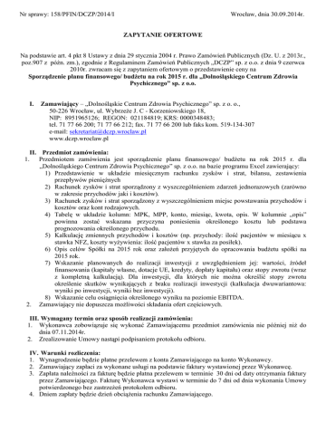 Nr sprawy: 158/PFIN/DCZP/2014/I Wrocław, dnia 30.09.2014r. ZAPYTANIE OFERTOWE Na podstawie art. 4 pkt 8 Ustawy z dnia 29 stycznia 2004 r. Prawo Zamówień Publicznych (Dz. U. z 2013r., poz.907 z późn. zm.), zgodnie z Regulaminem Zamówień Publicznych „DCZP” sp. z o.o. z dnia 9 czerwca 2010r. zwracam się z zapytaniem ofertowym o przedstawienie ceny na Sporządzenie planu finansowego/ budŜetu na rok 2015 r. dla „Dolnośląskiego Centrum Zdrowia Psychicznego” sp. z o.o. I. Zamawiający – „Dolnośląskie Centrum Zdrowia Psychicznego” sp. z o. o., 50-226 Wrocław, ul. WybrzeŜe J. C - Korzeniowskiego 18, NIP: 8951965126; REGON: 021184819; KRS: 0000348483; tel. 71 77 66 200; 71 77 66 212; fax. 71 77 66 200 lub faks kom. 519-134-307 e-mail: [email protected] www.dczp.wroclaw.pl II. Przedmiot zamówienia: Przedmiotem zamówienia jest sporządzenie planu finansowego/ budŜetu na rok 2015 r. dla „Dolnośląskiego Centrum Zdrowia Psychicznego” sp. z o.o. na bazie programu Excel zawierający: 1) Przedstawienie w układzie miesięcznym rachunku zysków i strat, bilansu, zestawienia przepływów pienięŜnych 2) Rachunek zysków i strat sporządzony z wyszczególnieniem zdarzeń jednorazowych (zarówno w zakresie przychodów jaki i kosztów). 3) Rachunek zysków i strat sporządzony z wyszczególnieniem miejsc powstawania przychodów i kosztów oraz kont rodzajowych. 4) Tabelę w układzie kolumn: MPK, MPP, konto, miesiąc, kwota, opis. W kolumnie „opis” powinna zostać wskazana przyczyna poniesienia określonego kosztu lub podstawa prognozowania określonego przychodu. 5) Kalkulację zmiennych przychodów i kosztów (np. przychody: ilość pacjentów w miesiącu x stawka NFZ, koszty wyŜywienia: ilość pacjentów x stawka za posiłek). 6) Opis celów Spółki na 2015 rok oraz załoŜeń przyjętych do opracowania budŜetu spółki na 2015 rok. 7) Wskazanie planowanych do realizacji inwestycji z uwzględnieniem jej: wartości, źródeł finansowania (kapitały własne, dotacje UE, kredyty, dopłaty kapitału) oraz stopy zwrotu (wraz z kompletną kalkulacją). Dla inwestycji, dla których nie moŜna określić stopy zwrotu określenie skutków wynikających z braku realizacji inwestycji (kalkulacja dwuwariantowa: wyniki po inwestycji, wyniki bez inwestycji). 8) Wskazanie celu osiągnięcia określonego wyniku na poziomie EBITDA. 2. Zamawiający nie dopuszcza moŜliwości składania ofert częściowych. 1. III. Wymagany termin oraz sposób realizacji zamówienia: 1. Wykonawca zobowiązuje się wykonać Zamawiającemu przedmiot zamówienia nie później niŜ do dnia 07.11.2014r. 2. Zrealizowanie Umowy nastąpi podpisaniem protokołu odbioru. IV. Warunki rozliczenia: 1. Wynagrodzenie będzie płatne przelewem z konta Zamawiającego na konto Wykonawcy. 2. Zamawiający zapłaci za wykonane usługi na podstawie faktury wystawionej przez Wykonawcę. 3. Zapłata naleŜności za fakturę będzie płatna przelewem w terminie 30 dni od daty otrzymania faktury przez Zamawiającego. Fakturę Wykonawca wystawi w terminie do 7 dni od dnia wykonania Umowy potwierdzonego bez zastrzeŜeń protokołem odbioru. 4. Dniem zapłaty będzie dzień obciąŜenia rachunku Zamawiającego. V. Zapytania o przedmiot zamówienia: Wszelkich informacji dotyczących przedmiotu zamówienia udziela: 1. Anna Lenard Tel. 505 247 090 E-mail: [email protected] VI. Sposób przygotowania oferty: Wykonawca powinien wypełnić i złoŜyć: 1) Załączony Formularz Oferty, stanowiący załącznik nr 1 do niniejszego zapytania ofertowego 2) Dokument stwierdzający status prawny Wykonawcy (odpis z właściwego rejestru lub zaświadczenia o wpisie do ewidencji działalności gospodarczej) – kopia potwierdzona za zgodność z oryginałem 3) Pełnomocnictwo – osoby podpisującej ofertę - kopia potwierdzona za zgodność z oryginałem. 4) Minimum 2 lata doświadczenia w sporządzaniu tego typu planu dla wielowydziałowych przedsiębiorstw działających w branŜach usługowych, najlepiej medycznych. VII. Miejsce i termin złoŜenia oferty: Ofertę naleŜy złoŜyć do dnia 07.10.2014 roku do godz. 10:00 w siedzibie „Dolnośląskiego Centrum Zdrowia Psychicznego” sp. z o. o., 50-226 Wrocław, ul. WybrzeŜe J. C - Korzeniowskiego 18, Budynek G, III piętro, Sekretariat lub drogą e-mailową na adres email: [email protected] , z dopiskiem: „Oferta na sporządzenie planu finansowego” VIII. Kryterium wyboru oferty: 100 pkt. - cena IX. Pozostałe informacje: 1. Ceny w formularzu ofertowym naleŜy podać z dokładnością do dwóch miejsc po przecinku. 2. O wyborze oferty Zamawiający powiadomi e-mailem wszystkich, którzy złoŜyli ofertę. 3. Informacja o terminie i miejscu podpisania Umowy zostanie przekazana telefonicznie Wykonawcy, którego ofertę wybrano. 4. Zamawiający zastrzega sobie prawo do zmienienia, odwołania lub uniewaŜnienia ogłoszenia lub warunków postępowania na kaŜdym jego etapie bez skutków prawnych dla Zamawiającego a takŜe do uniewaŜnienia lub odwołania postępowania na kaŜdym jego etapie bez skutków prawnych dla Zamawiającego. Załączniki do zapytania ofertowego: 1. Załącznik nr 1 – Formularz ofertowy 2. Załącznik nr 2 – Wzór Umowy