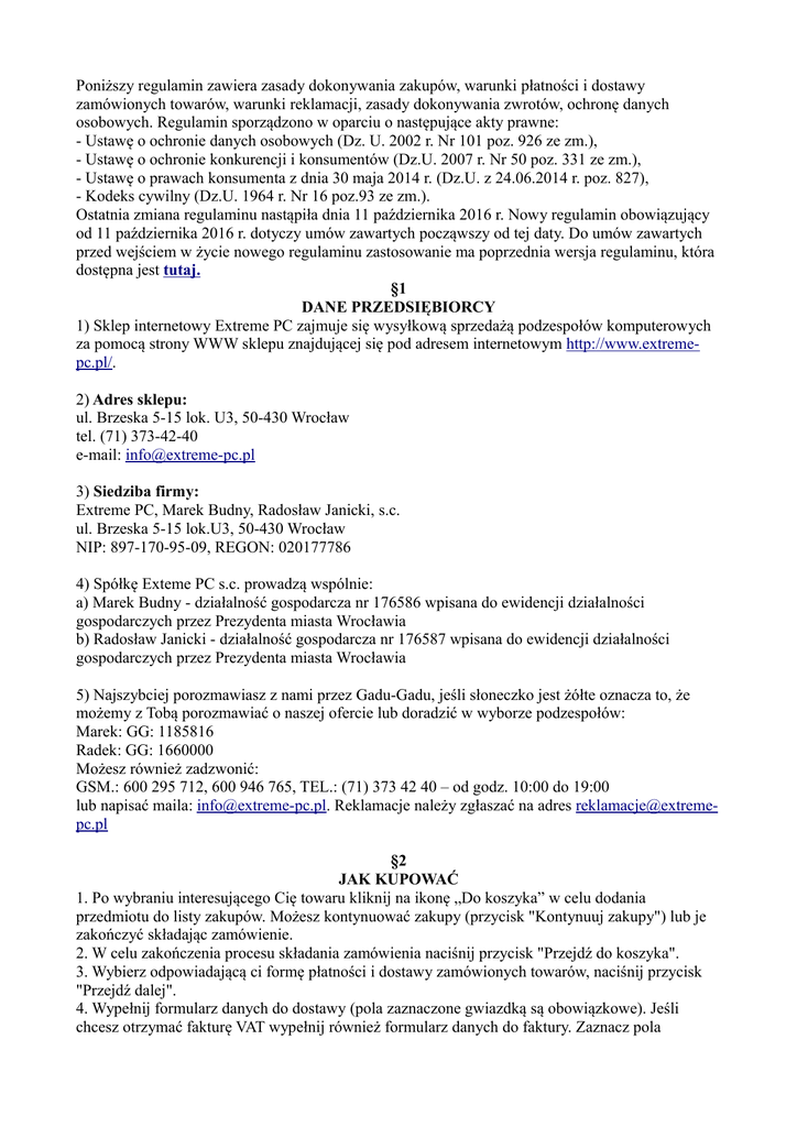 Poniższy regulamin zawiera zasady dokonywania zakupów, warunki płatności i dostawy zamówionych towarów, warunki reklamacji, zasady dokonywania zwrotów, ochronę danych osobowych. Regulamin sporządzono w oparciu o następujące akty prawne: - Ustawę o ochronie danych osobowych (Dz. U. 2002 r. Nr 101 poz. 926 ze zm.), - Ustawę o ochronie konkurencji i konsumentów (Dz.U. 2007 r. Nr 50 poz. 331 ze zm.), - Ustawę o prawach konsumenta z dnia 30 maja 2014 r. (Dz.U. z 24.06.2014 r. poz. 827), - Kodeks cywilny (Dz.U. 1964 r. Nr 16 poz.93 ze zm.). Ostatnia zmiana regulaminu nastąpiła dnia 11 października 2016 r. Nowy regulamin obowiązujący od 11 października 2016 r. dotyczy umów zawartych począwszy od tej daty. Do umów zawartych przed wejściem w życie nowego regulaminu zastosowanie ma poprzednia wersja regulaminu, która dostępna jest tutaj. §1 DANE PRZEDSIĘBIORCY 1) Sklep internetowy Extreme PC zajmuje się wysyłkową sprzedażą podzespołów komputerowych za pomocą strony WWW sklepu znajdującej się pod adresem internetowym http://www.extremepc.pl/. 2) Adres sklepu: ul. Brzeska 5-15 lok. U3, 50-430 Wrocław tel. (71) 373-42-40 e-mail: [email protected] 3) Siedziba firmy: Extreme PC, Marek Budny, Radosław Janicki, s.c. ul. Brzeska 5-15 lok.U3, 50-430 Wrocław NIP: 897-170-95-09, REGON: 020177786 4) Spółkę Exteme PC s.c. prowadzą wspólnie: a) Marek Budny - działalność gospodarcza nr 176586 wpisana do ewidencji działalności gospodarczych przez Prezydenta miasta Wrocławia b) Radosław Janicki - działalność gospodarcza nr 176587 wpisana do ewidencji działalności gospodarczych przez Prezydenta miasta Wrocławia 5) Najszybciej porozmawiasz z nami przez Gadu-Gadu, jeśli słoneczko jest żółte oznacza to, że możemy z Tobą porozmawiać o naszej ofercie lub doradzić w wyborze podzespołów: Marek: GG: 1185816 Radek: GG: 1660000 Możesz również zadzwonić: GSM.: 600 295 712, 600 946 765, TEL.: (71) 373 42 40 – od godz. 10:00 do 19:00 lub napisać maila: [email protected]. Reklamacje należy zgłaszać na adres [email protected] §2 JAK KUPOWAĆ 1. Po wybraniu interesującego Cię towaru kliknij na ikonę „Do koszyka” w celu dodania przedmiotu do listy zakupów. Możesz kontynuować zakupy (przycisk "Kontynuuj zakupy") lub je zakończyć składając zamówienie. 2. W celu zakończenia procesu składania zamówienia naciśnij przycisk "Przejdź do koszyka". 3. Wybierz odpowiadającą ci formę płatności i dostawy zamówionych towarów, naciśnij przycisk "Przejdź dalej". 4. Wypełnij formularz danych do dostawy (pola zaznaczone gwiazdką są obowiązkowe). Jeśli chcesz otrzymać fakturę VAT wypełnij również formularz danych do faktury. Zaznacz pola "Zapoznałem się z regulaminem sklepu" i "Wyrażenie zgody na przetwarzanie danych osobowych". Są one konieczne do finalizacji zamówienia. Naciśnij przycisk "Dalej". 5. Zweryfikuj zamówienie, adres dostawy i dane do faktury. Jeśli wszystko się zgadza naciśnij przycisk "Zamawiam i płacę". W tym momencie zostaje zawarta przez Kupującego umowa sprzedaży ze sklepem. 6. Na podany adres e-mail podany podczas składania zamówienia będziemy wysyłać informacje o bieżącym statusie realizacji zamówienia. 7. Na zakupiony towar wystawiamy faktury VAT (na życzenie kupującego) i paragony fiskalne. 8. Ceny w sklepie są aktualizowane codziennie, wyświetlane kwoty zawierają podatek VAT i wszystkie inne obowiązujące podatki i cła. Cena podana obok każdego produktu jest wiążąca. 9. Momentem zawarcia umowy sprzedąży jest potwierdzenie przez sprzedawcę otrzymania zamówienia. Potwierdzenie następuje w drodze przesłania konsumentowi/klientowi wiadomości email, w której sprzedawca potwierdza przyjęcie zamówienia do realizacji. 10. Zamówienie zostanie anulowane przez sklep po 10 dniach kalendarzowych od jego złożenia w następujących przypadkach: a) Kupujący nie potwierdzi zamówienia kilkając na link potwierdzający wysłany w mailu, b) Kupujący nie odbierze towaru osobiście, jeśli jako sposób dostawy wybrał odbiór osobisty towaru w sklepie. 11. Do korzystania z e-sklepu Extreme PC potrzebny jest komputer, telefon lub tablet z zainstalowaną przeglądarką stron WWW podłączony do Internetu. §3 OCHRONA DANYCH OSOBOWYCH 1. Sklep Extreme PC jest zarejestrowny na platformie Selly.pl, która jest administratorem bazy danych osobowych naszych Klientów. Baza danych osobowych SELLY została zarejestrowana w księdze GIODO o nr 102314. 2. Sklep Extreme-PC, Marek Budny, Radosław Janicki, s.c. przykłada szczególną troskę do ochrony danych osobowych klientów i chroni je zgodnie z wymogami ustawowymi. Extreme PC zabezpiecza dane przed ich udostępnieniem osobom nieupoważnionym, jak również przed ich przetwarzaniem z naruszeniem obowiązujących przepisów prawa. Dane osobowe będą wykorzystane jedynie w celu realizacji zamówienia. Jeżeli wyrazisz zgodę na podany adres e-mail możemy wysyłać informacje o nowościach i promocjach w naszym sklepie (newsletter Extreme PC). Oczywiście w każdej chwili możesz zażądać zaprzestania dalszego wysyłania naszych e-maili i wykreślenia informacji z naszej bazy danych. Masz także prawo wglądu do swoich danych, do ich korekty oraz żądania zaprzestania ich wykorzystywania. 3. W ramach realizacji umowy z Kupującym Sklep jest upoważniony przesłać na adres poczty elektronicznej Kupującego zaproszenie do wypełnienia ankiety posprzedażowej. Ankieta służy zbadaniu opinii o przeprowadzonej transakcji. Kupujący może dobrowolnie wypełnić ankietę. §4 SPOSOBY PŁATNOŚCI ZA TOWAR 1. Wszystkie podane przez nas ceny są cenami brutto z uwzględnionym już podatkiem VAT. Są to ceny końcowe i ostateczne. Do łącznej wartości zamówienia będą doliczone jeszcze koszty przesyłki. W przypadku płatności kartą kredytową lub przelewem z wykorzystaniem platformy elektronicznych płatności transferuj.pl zostanie do 