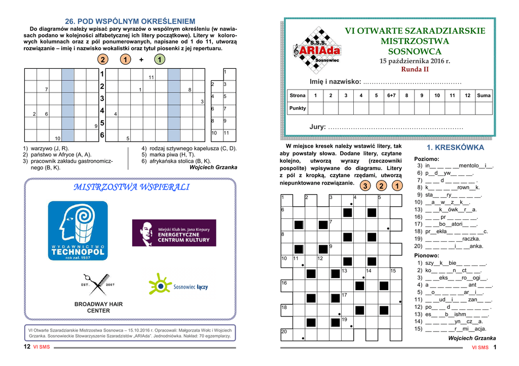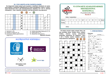 26. POD WSPÓLNYM OKREŚLENIEM Do diagramów należy wpisać pary wyrazów o wspólnym określeniu (w nawiasach podano w kolejności alfabetycznej ich litery początkowe). Litery w kolorowych kolumnach oraz z pól ponumerowanych, napisane od 1 do 11, utworzą rozwiązanie – imię i nazwisko wokalistki oraz tytuł piosenki z jej repertuaru. 2 1 + 1 11 3 4 5 Strona 6 7 Punkty 5 8 9 6 10 11 4 6 9 10 1) 2) 3) 3) Imię i nazwisko: ..…………………………………… 2 2 1 8 3 2 15 października 2016 r. Runda II 1 1 7 VI OTWARTE SZARADZIARSKIE MISTRZOSTWA SOSNOWCA 1 2 3 4 5 6+7 8 10 11 12 Suma 4 warzywo (J, R). państwo w Afryce (A, A). pracownik zakładu gastronomicznego (B, K). Jury: …………………………………………………… 5 4) rodzaj sztywnego kapelusza (C, D). 5) marka piwa (H, T). 6) afrykańska stolica (B, K). Wojciech Grzanka MISTRZOSTWA WSPIERALI W miejsce kresek należy wstawić litery, tak aby powstały słowa. Dodane litery, czytane kolejno, utworzą wyrazy (rzeczowniki pospolite) wpisywane do diagramu. Litery z pól z kropką, czytane rzędami, utworzą niepunktowane rozwiązanie. 3 1 2 3 4 2 1 5 ● 6 7 ● 8 9 10 11 12 ● 13 14 15 ● 16 17 BROADWAY HAIR CENTER ● 18 ● 19 ● VI Otwarte Szaradziarskie Mistrzostwa Sosnowca – 15.10.2016 r. Opracowali: Małgorzata Wołc i Wojciech Grzanka. Sosnowieckie Stowarzyszenie Szaradzistów „ARIAda”. Jednodniówka. Nakład: 70 egzemplarzy. 12 VI SMS 9 3 20 ● 1. KRESKÓWKA Poziomo: 3) in__ __ __ __mentolo__i__. 6) p__d__yw__ __ __. 7) __ __ d __ __ __ __ . 8) k__ __ __ __rown__k. 9) sta__ __ry__ __ __ __. 10) __a__w__z__k__. 13) __ __k__ówk__r__a. 16) __ __ pr __ __ __ __. 17) __ __bo__atori__ __. 18) pr__ekła__ __ __ __ __c. 19) __ __ __ __ __raczka. 20) __ __ __ __i__ __anka. Pionowo: 1) szy__k__bie__ __ __ __. 2) ko__ __ __n__ct__ __. 3) __ __eks__ __ro__ogi__. 4) a __ __ __ __ __ ant __ __. 5) __o__ __ __ __ar__i__. 11) __ __ud__i__ __ zan__ __. 12) po__ __ d __ __ __ __ __ . 13) es__ __b__ishm__ __ __. 14) __ __ __ __yn__cz__a. 15) __ __ __ __r__mi__acja. Wojciech Grzanka VI SMS 1 1 2 3 4 5 6 ● ● 7 8 Zamiast określeń podano we właściwej kolejności wszystkie litery wchodzące w skład danej pary wyrazów (rzeczowników ● pospolitych). Pierwsze słowo pary należy odczytać od lewej do prawej (zaczynając od pierwszej litery i przeskakując niektóre), natomiast drugie – wspak, zaczynając od litery ostatniej. Litery z pól z kropką, czytane rzędami, utworzą niepunktowane rozwiązanie. ● 9 10 11 12 13 14 15 ● 16 17 18 ● 19 20 21 ● ● Poziomo: Pionowo: 3, 7) 8, 9) 10, 11) 14, 16) 17, 19) 20, 21) 1, 2) 3, 4) 5, 6) 19, 12) 13, 14) 15, 18) G Ł O A Ł Ą B N J E K E H. O S Ś C U I B E M I Ż E G. K A O K M Ó L A D Z K A S. I N T N A M R K U C Z O R. F A A I R E Ł D T O K A L. N T N I A R E A R Ó W B G. 2. PRAWY DO LEWEGO 3 2 1 Y L E E B E T N I K. G N A M Ł H O C S A K A Ł. B A K Z L C E A P N D E E R L K. G A A K T S T R E C O L S O G A. K T N O M A Ó F R K N A I. T J A Ó Ł R Z E N K. Wojciech Grzanka 3. I KTO TO MÓWI? Do diagramu należy wpisać autorów podanych wypowiedzi, zakładając że potrafią mówić. Litery z kolorowych pól, czytane rzędami, utworzą niepunktowane rozwiązanie – „autorkę” wypowiedzi: „jestem zielona”. 1 2 3 4 3 5 2 6 1 2 VI SMS Poziomo: 4) jestem zimna. 5) bywam senny. 6) jestem miejscem występowa6) nia dużych skupisk soli. Pionowo: 1) niektórzy we mnie wierzą. 2) leżę między Skarżyskiem 2) a Kamienną. 3) widują mnie w kapeluszu, choć 3) nigdy go nie zakładam. Wojciech Grzanka 23. PSOTKA PODWÓJNA W jednym z wyrazów objaśnienia należy zmienić jedną z liter, a w innym dodać lub odjąć jedną literę i po dokonaniu tych zmian odgadnąć wyraz (rzeczownik pospolity) wpisywany do diagramu. Poziomo: Litery z kolorowych pól, czytane rzędami, utworzą 3) nutowy – na burki. niepunktowane rozwiązanie. Uwaga: wielkie litery 6) parzona z Rochem. w określeniach należy zignorować. 7) pita część ropy. 8) zabił ją rogacz. 4 3 2 1 10) światowa w grodzie. 12) stare w stadzie. 1 2 3 4 5 13) odciążenie balkonu. 15) cicha fucha. 6 18) potocznie o szafie lub 18) kojcu. 7 19) do klina, czasem wonny. 20) zalewa pod sosami. 8 9 21) zimny – na koncie. Pionowo: 10 11 1) chodzące, zwykle masu1) jące. 12 2) paserka z miernymi. 3) rozwalona przez Barcę. 13 14 4) bitka z łoszy. 5) składasz weń tyczkę. 15 16 17 9) zostawiane na kapie. 18 10) koń lub lis. 11) warta występu. 19 12) kres rozboju. 14) zagryzka na korycie. 20 16) drugi wśród gazdów. 17) wykryty na płocie. 21 18) linowa – z kranem. Wojciech Grzanka 24. SAMOSIA Diagram należy uzupełnić literami, tak aby powstała krzyżówka złożona z rzeczowników pisanych małą literą. Dopisane litery, czytane lewoskrętnie od pola z kropką, utworzą rozwiązanie. 2 25. ANAGRAM 2 Na planie filmu aktor szedł ścieżką przez pole i fantazyjnie kręcił barwnym parasolem. Niestety, psotny __ __ __ __ __ __ __ __, złośliwy niecnota wyrwał mu ów __ __ __ __ __ __ __ __ i wrzucił do błota. Stanisław Osyda T S Ś A • S A R A Wojciech Grzanka VI SMS 11 22. NASI MEDALIŚCI 1 2 4. SYNTEZA W diagramie występuje siedem haseł dwuwyrazowych, które należy utworzyć poprzez odpowiednie dobranie w pary anagramów niektórych spośród podanych słów (np.: kara, gniady – Arka Gdynia) i wraz z pozostałymi wyrazami wpisać je do diagramu. Litery z kolorowych pól, czytane osobno rzędami, utworzą dwa słowa, z anagramów których można ułożyć imię i nazwisko piłkarza (dodatkowo punktowane). 3 4 5 6 8 10 1 5 2 7 4 3 2 1 + 1 3 8 2 1 9 10 5 11 3 7 12 13 14 4 9 6 1 2 3 4 5 6 7 8 9 10 Poziomo należy wpisać nazwiska dziesięciu polskich medalistów(-ek) tegorocznych mistrzostw Europy w lekkoatletyce (pomijając uczestników sztafety 4 × 400 m). Litery z pól ponumerowanych dodatkowo utworzą niepunktowane rozwiązanie – jeszcze jedno „medalowe