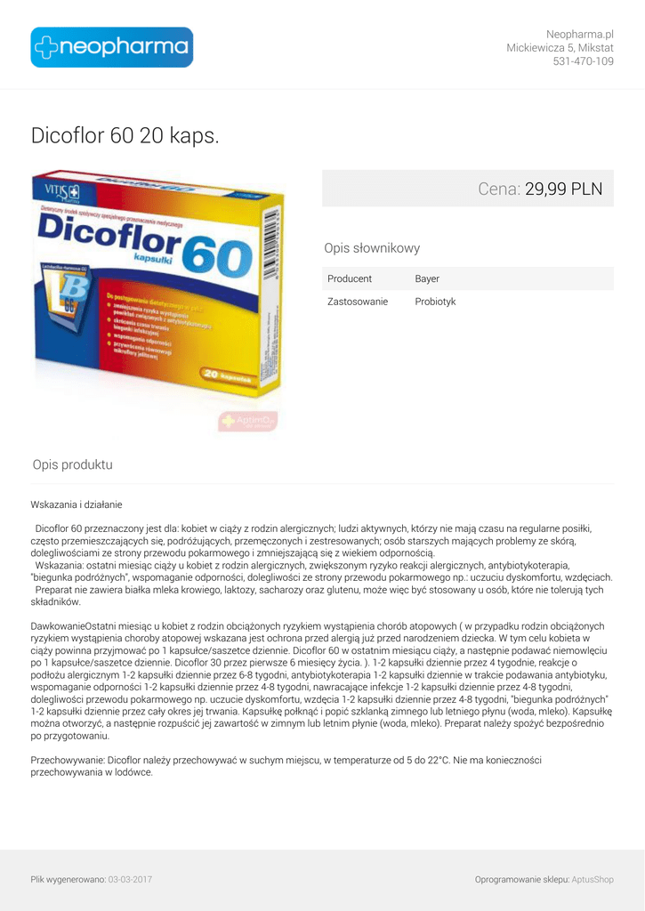 Neopharma.pl Mickiewicza 5, Mikstat 531-470-109 Dicoflor 60 20 kaps. Cena: 29,99 PLN Opis słownikowy Producent Bayer Zastosowanie Probiotyk Opis produktu Wskazania i działanie Dicoflor 60 przeznaczony jest dla: kobiet w ciąży z rodzin alergicznych; ludzi aktywnych, którzy nie mają czasu na regularne posiłki, często przemieszczających się, podróżujących, przemęczonych i zestresowanych; osób starszych mających problemy ze skórą, dolegliwościami ze strony przewodu pokarmowego i zmniejszającą się z wiekiem odpornością. Wskazania: ostatni miesiąc ciąży u kobiet z rodzin alergicznych, zwiększonym ryzyko reakcji alergicznych, antybiotykoterapia, "biegunka podróżnych", wspomaganie odporności, dolegliwości ze strony przewodu pokarmowego np.: uczuciu dyskomfortu, wzdęciach. Preparat nie zawiera białka mleka krowiego, laktozy, sacharozy oraz glutenu, może więc być stosowany u osób, które nie tolerują tych składników. DawkowanieOstatni miesiąc u kobiet z rodzin obciążonych ryzykiem wystąpienia chorób atopowych ( w przypadku rodzin obciążonych ryzykiem wystąpienia choroby atopowej wskazana jest ochrona przed alergią już przed narodzeniem dziecka. W tym celu kobieta w ciąży powinna przyjmować po 1 kapsułce/saszetce dziennie. Dicoflor 60 w ostatnim miesiącu ciąży, a następnie podawać niemowlęciu po 1 kapsułce/saszetce dziennie. Dicoflor 30 przez pierwsze 6 miesięcy życia. ). 1-2 kapsułki dziennie przez 4 tygodnie, reakcje o podłożu alergicznym 1-2 kapsułki dziennie przez 6-8 tygodni, antybiotykoterapia 1-2 kapsułki dziennie w trakcie podawania antybiotyku, wspomaganie odporności 1-2 kapsułki dziennie przez 4-8 tygodni, nawracające infekcje 1-2 kapsułki dziennie przez 4-8 tygodni, dolegliwości przewodu pokarmowego np. uczucie dyskomfortu, wzdęcia 1-2 kapsułki dziennie przez 4-8 tygodni, "biegunka podróżnych" 1-2 kapsułki dziennie przez cały okres jej trwania. Kapsułkę połknąć i popić szklanką zimnego lub letniego płynu (woda, mleko). Kapsułkę można otworzyć, a następnie rozpuścić jej zawartość w zimnym lub letnim płynie (woda, mleko). Preparat należy spożyć bezpośrednio po przygotowaniu. Przechowywanie: Dicoflor należy przechowywać w suchym miejscu, w temperaturze od 5 do 22°C. Nie ma konieczności przechowywania w lodówce. Plik wygenerowano: 03-03-2017 Powered by TCPDF (www.tcpdf.org) Oprogramowanie sklepu: AptusShop