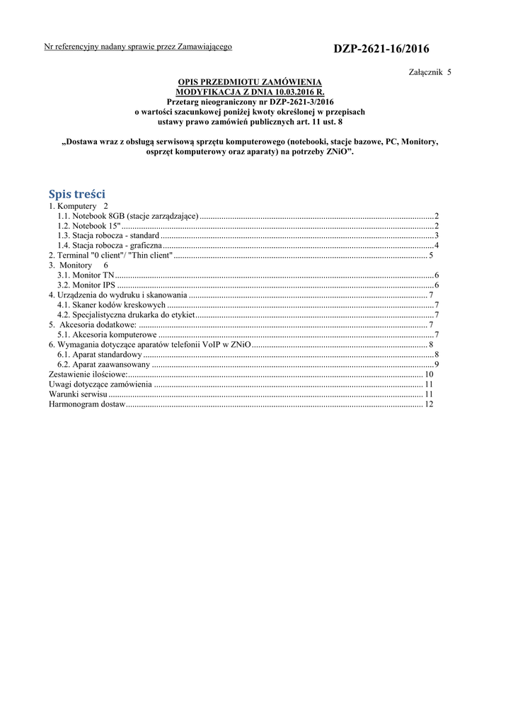 Nr referencyjny nadany sprawie przez Zamawiającego DZP-2621-16/2016 Załącznik 5 OPIS PRZEDMIOTU ZAMÓWIENIA MODYFIKACJA Z DNIA 10.03.2016 R. Przetarg nieograniczony nr DZP-2621-3/2016 o wartości szacunkowej poniżej kwoty określonej w przepisach ustawy prawo zamówień publicznych art. 11 ust. 8 „Dostawa wraz z obsługą serwisową sprzętu komputerowego (notebooki, stacje bazowe, PC, Monitory, osprzęt komputerowy oraz aparaty) na potrzeby ZNiO”. Spis treści 1. Komputery 2 1.1. Notebook 8GB (stacje zarządzające) ............................................................................................................ 2 1.2. Notebook 15" ................................................................................................................................................ 2 1.3. Stacja robocza - standard .............................................................................................................................. 3 1.4. Stacja robocza - graficzna ............................................................................................................................. 4 2. Terminal "0 client"/ "Thin client" ..................................................................................................................... 5 3. Monitory 6 3.1. Monitor TN ................................................................................................................................................... 6 3.2. Monitor IPS .................................................................................................................................................. 6 4. Urządzenia do wydruku i skanowania .............................................................................................................. 7 4.1. Skaner kodów kreskowych ........................................................................................................................... 7 4.2. Specjalistyczna drukarka do etykiet .............................................................................................................. 7 5. Akcesoria dodatkowe: ..................................................................................................................................... 7 5.1. Akcesoria komputerowe ............................................................................................................................... 7 6. Wymagania dotyczące aparatów telefonii VoIP w ZNiO ................................................................................. 8 6.1. Aparat standardowy ...................................................................................................................................... 8 6.2. Aparat zaawansowany .................................................................................................................................. 9 Zestawienie ilościowe: ........................................................................................................................................ 10 Uwagi dotyczące zamówienia ............................................................................................................................ 11 Warunki serwisu ................................................................................................................................................. 11 Harmonogram dostaw ......................................................................................................................................... 12 Zakup sprzętu grupa I komputery PC, notebooki 1. Komputery 1.1. Notebook 8GB (stacje zarządzające) Specyfikacja techniczna: Notebook Typ Uzyskujący w teście PassMark CPU Mark (http://www.cpubenchmark.net/)co Procesor najmniej 3500 pkt. 1920 x 1080 Nominalna rozdzielczość Matowy, 14 cali, Full HD IPS LED Typ ekranu Przynajmniej 8 GB DDR3 1600MHz z możliwością rozbudowy do 16GB bez Pamięć RAM deinstalacji modułów dostarczonych z notebookiem Min. 256GB w technologii SSD Dysk twardy Możliwość montażu dodatkowego dysku M.2 Zintegrowana, uzyskująca w testach VideocardBenchmarksPassMark - G3D Karta graficzna Mark co najmniej 550 pkt. (http://www.videocardbenchmark.net/ ) Zintegrowana: Tak Karta dźwiękowa Zintegrowana karta LAN 10/100/1000 Mbps Karta sieciowa Bluetooth 4 Komunikacja Standard WLAN 802.11ac DisplayPort Złącza Złącze stacji dokującej VGA USB 3.0 (minimum 4 szt. z czego przynajmniej 1 do szybkiego ładowania urządzeń mobilnych) Kensington Tak Czytnik linii papilarnych Wbudowana, przynajmniej 720p Kamera internetowa Wbudowany Mikrofon Tak Wejście mikrofonowe Tak Wyjście słuchawkowe Tak Czytnik Smart Card Tak Technologia NFC Tak Wzmocniona konstrukcja Touchpad z osobnymi przyciskami myszy + trackpoint z przyciskami myszy Wskaźnik Najnowszy z danej rodziny system operacyjny przeznaczony do użytku w firmie System operacyjny (wersja Professional), musi być on 64 bitowy, współpracujący z systemami teleinformatycznymi eksploatowanymi przez zamawiającego. Przez systemy teleinformatyczne eksploatowane przez zamawiającego rozumie się: - wsparcie protokołu 802.1x, Pełna obsługa MS Active Directory - możliwość uruchamiania pakietu Office ® w wersji co najmniej 2010 Nie przekraczająca 1,75 kg Waga Nie przekraczające 339 mm szerokości, 237 głębokości, 21 mm grubości Wymiary 3 lata dla firm i instytucji Gwarancja Dostarczona z notebookiem Stacja dokująca 1.2.Notebook 15" Specyfikacja techniczna: Typ Procesor Notebook Co najmniej 2 rdzenie, co najmniej 4 wątków, pojemność pamięci cache co najmniej 3 MB, z pełną wirtualizacją, technologią ochrony tożsamości, monitorowania chłodzenia, wykonany w litografii maksymalnie 14 nm. Uzyskujący w teście PassMark CPU Mark(http://www.cpubenchmark.net/) co najmniej 3917 pkt. 2 Przekątna ekranu Nominalna rozdzielczość Typ ekranu Pamięć RAM Dysk twardy Napęd optyczny Karta graficzna Karta dźwiękowa Karta sieciowa Komunikacja Złącza Czytnik 
