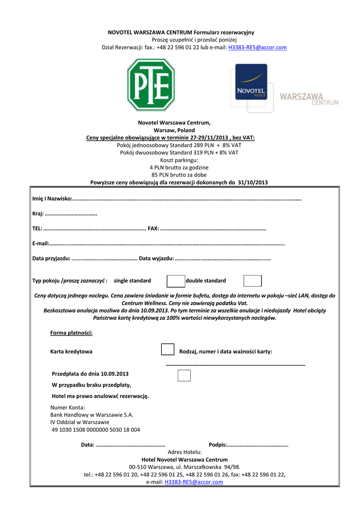 NOVOTEL WARSZAWA CENTRUM Formularz rezerwacyjny Proszę uzupełnid i przesład poniżej Dział Rezerwacji: fax.: +48 22 596 01 22 lub e-mail: [email protected] Novotel Warszawa Centrum, Warsaw, Poland Ceny specjalne obowiązujące w terminie 27-29/11/2013 , bez VAT: Pokój jednoosobowy Standard 289 PLN + 8% VAT Pokój dwuosobowy Standard 319 PLN + 8% VAT Koszt parkingu: 4 PLN brutto za godzine 85 PLN brutto za dobe Powyższe ceny obowiązują dla rezerwacji dokonanych do 31/10/2013 Imię I Nazwisko:............................................................………......………….…...…….................................................... Kraj: ………………………………. TEL: ......................................………….................. FAX: .........………………..…….................................... E-mail:....................................................................................……….…...……................................................. Data przyjazdu: ............................………….... Data wyjazdu: ...........…….….……...….............................. Typ pokoju /proszę zaznaczyd : single standard double standard Ceny dotyczą jednego noclegu. Cena zawiera śniadanie w formie bufetu, dostęp do internetu w pokoju –sied LAN, dostęp do Centrum Wellness. Ceny nie zawierają podatku Vat. Bezkosztowa anulacja mozliwa do dnia 10.09.2013. Po tym terminie za wszelkie anulacje i niedojazdy Hotel obciąży Paostrwa kartę kredytową za 100% wartości niewykorzystanych noclegów. Forma płatności: Karta kredytowa Rodzaj, numer i data ważności karty: ______________________________________________ Przedpłata do dnia 10.09.2013 W przypadku braku przedpłaty, Hotel ma prawo anulowad rezerwację. Numer Konta: Bank Handlowy w Warszawie S.A. IV Oddział w Warszawie 49 1030 1508 0000000 5030 18 004 Data: ...............................…..…....… Podpis:…………………….................. Adres Hotelu: Hotel Novotel Warszawa Centrum 00-510 Warszawa, ul. Marszałkowska 94/98. tel.: +48 22 596 01 20, +48 22 596 01 25, +48 22 596 01 26, fax: +48 22 596 01 22, e-mail: [email protected]