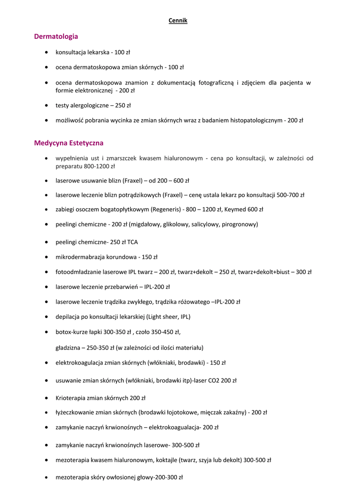 Cennik Dermatologia konsultacja lekarska - 100 zł ocena dermatoskopowa zmian skórnych - 100 zł ocena dermatoskopowa znamion z dokumentacją fotograficzną i zdjęciem dla pacjenta w formie elektronicznej - 200 zł testy alergologiczne – 250 zł możliwość pobrania wycinka ze zmian skórnych wraz z badaniem histopatologicznym - 200 zł Medycyna Estetyczna wypełnienia ust i zmarszczek kwasem hialuronowym - cena po konsultacji, w zależności od preparatu 800-1200 zł laserowe usuwanie blizn (Fraxel) – od 200 – 600 zł laserowe leczenie blizn potrądzikowych (Fraxel) – cenę ustala lekarz po konsultacji 500-700 zł zabiegi osoczem bogatopłytkowym (Regeneris) - 800 – 1200 zł, Keymed 600 zł peelingi chemiczne - 200 zł (migdałowy, glikolowy, salicylowy, pirogronowy) peelingi chemiczne- 250 zł TCA mikrodermabrazja korundowa - 150 zł fotoodmładzanie laserowe IPL twarz – 200 zł, twarz+dekolt – 250 zł, twarz+dekolt+biust – 300 zł laserowe leczenie przebarwień – IPL-200 zł laserowe leczenie trądzika zwykłego, trądzika różowatego –IPL-200 zł depilacja po konsultacji lekarskiej (Light sheer, IPL) botox-kurze łapki 300-350 zł , czoło 350-450 zł, gładzizna – 250-350 zł (w zależności od ilości materiału) elektrokoagulacja zmian skórnych (włókniaki, brodawki) - 150 zł usuwanie zmian skórnych (włókniaki, brodawki itp)-laser CO2 200 zł Krioterapia zmian skórnych 200 zł łyżeczkowanie zmian skórnych (brodawki łojotokowe, mięczak zakaźny) - 200 zł zamykanie naczyń krwionośnych – elektrokoagualacja- 200 zł zamykanie naczyń krwionośnych laserowe- 300-500 zł mezoterapia kwasem hialuronowym, koktajle (twarz, szyja lub dekolt) 300-500 zł mezoterapia skóry owłosionej głowy-200-300 zł mezoterapia skóra okolicy oczu-250-300 zł fotoodmładzanie-twarz-laser ATON 300 zł radiofrekwencja-zabieg Protege twarz-350 zł Zabieg PRX- wygładzanie zmarszczek i usuwanie przebarwień 250 zł Diagnostyka chorób tarczycy • Biopsja tarczycy - 200 zł • Konsultacja z badaniem USG- 100 zł W wybranym dniu każdego miesiąca ceny promocyjne na botox, mezoterapię i zabiegi laserowe. O szczegóły zapytaj swojego lekarza. W razie procedur łączonych lub cykli zabiegowych możliwość rabatu 10%-15%.