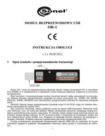 MODUŁ BEZPRZEWODOWY USB OR-1 INSTRUKCJA OBSŁUGI v.1.1 29.08 2012 1 Opis modułu i przeprowadzenie transmisji Moduł OR-1 służy do bezprzewodowej transmisji danych między komputerem PC a miernikami firmy SONEL S.A. zaopatrzonymi w odpowiedni moduł nadawczo-odbiorczy. Zapewnia on komunikację obustronną. Żeby korzystać z bezprzewodowego modułu transmisji danych należy zainstalować na komputerze dowolne aktualne oprogramowanie ściągnięte ze strony producenta (np.: SONEL PE, SONEL ANALIZA, SONEL READER) oraz zaktualizować oprogramowanie miernika do najnowszej dostępnej wersji. UWAGA! Starsze wersje oprogramowania (powstałe przed 01.04.2010) mogą nie zawierać aktualnych sterowników do modułu OR-1. Aby uruchomić transmisję, należy podłączyć moduł do złącza USB komputera. Świecenie diody LED informuje o tym, że moduł jest zasilany. Należy zainstalować sterowniki, postępując według procedury wyświetlanej przes system operacyjny. W mierniku należy ustawić opcję transmisji danych wg instrukcji obsługi danego miernika. W PC uruchomić jeden z programów do archiwizacji, analizy danych dostarczanych przez SONEL S.A. Programy te zawierają również niezbędny do współpracy z modułem sterownik. Przebieg transmisji sygnalizowany jest przez przygasanie diody LED. Poniżej przedstawiono przykładowe przygotowanie miernika MRU-200 do transmisji. W innych miernikach wygląda to podobnie. Szczegółowych informacji należy szukać w instrukcjach do mierników. 1 Przełącznik funkcji ustawić na MEM i wcisnąć przycisk F1 lub w MENU głównym miernika wybrać pozycję Transmisja bezprzewodowa W razie potrzeby zmiany kodu PIN wybrać pozycję Zmień kod PIN. Taki sam kod należy wpisać w programie komputerowym. Ma on służyć zabezpieczeniu transmisji. Ustawić poszczególne cyfry. 2 Aby rozpocząć transmisję wybrać pozycję Transmisja bezprzewodowa z MENU lub nacisnąć przycisk F1 w pozycji gałki MEM. Ukażą się kolejno komunikaty: Nawiązywanie połączenia RF, a następnie Połączenie bezprzewodowe aktywne. W przypadku niemożności nawiązania połączenia ukaże się komunikat Utracono połączenie bezprzewodowe. Po nawiązaniu łączności należy postępować zgodnie z instrukcją obsługi programu do archiwizowania danych. 2 Aktualizacja oprogramowania UWAGA! Funkcja przeznaczona jest wyłącznie dla użytkowników biegle posługujących się sprzętem komputerowym. Gwarancja nie obejmuje wadliwego działania przyrządu na skutek niewłaściwego użycia tej funkcji. UWAGA! W czasie programowania nie wolno odłączać modułu od PC. UWAGA! W komputerze musi być zainstalowany jeden z programów do archiwizowania danych zawierający odpowiedni sterownik. Przed przystąpieniem do uaktualnienia programu należy ze strony internetowej producenta (www.sonel.pl) ściągnąć program do zaprogramowania modułu, zainstalować go na komputerze i podłączyć moduł do komputera. Następnie uruchomić program i postępować zgodnie z wyświetlanymi instrukcjami. Przeczytać informacje i zaznaczyć opcję: Zapoznałem się z informacją. 3 Kliknąć przycisk Rozpocznij wgrywanie. 3 Rozbiórka i utylizacja Zużyty sprzęt elektryczny i elektroniczny należy gromadzić selektywnie, tj. nie umieszczać z odpadami innego rodzaju. Zużyty sprzęt elektroniczny należy przekazać do punktu zbiórki zgodnie z Ustawą o zużytym sprzęcie elektrycznym i elektronicznym. Przed przekazaniem sprzętu do punktu zbiórki nie należy samodzielnie demontować żadnych części z tego sprzętu. Należy przestrzegać lokalnych przepisów dotyczących wyrzucania opakowań, zużytych baterii i akumulatorów. 4 a) b) c) d) e) f) g) h) 5 Dane techniczne nadajnika prędkość transmisji:.............................................................................................................115kb/s zasięg:........................................................................................................................................5m pasmo pracy:..............................................................................................................ISM 433 MHz systemy PC:..........................................................................Windows 2000, XP, Vista 32bit i 64bit wymiary:........................................................................................................ok. 78 x 23 x 14,5 mm masa:..............................................................................................................................ok. 0,02kg temperatura pracy:.............................................................................................................0..+40°C wilgotność: ............................................................................................do 80% bez kondensacji Producent Producentem modułu prowadzącym serwis gwarancyjny i pogwarancyjny jest: SONEL S. A. ul. Wokulskiego 11 58-100 Świdnica tel. (74) 858 38 78 (Dział Handlowy) (74) 858 38 79 (Serwis) fax (74) 858 38 08 e-mail: [email protected] internet: www.sonel.pl Uwaga: Do prowadzenia napraw serwisowych upoważniony jest jedynie producent. 4