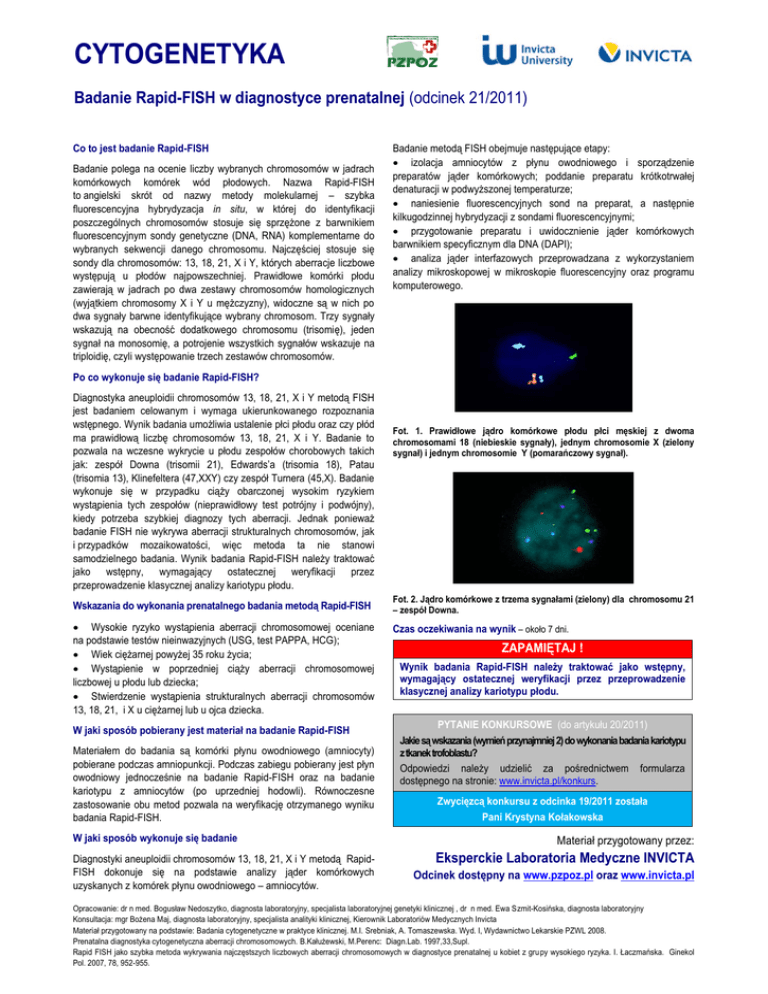 CYTOGENETYKA Badanie Rapid-FISH w diagnostyce prenatalnej (odcinek 21/2011) Co to jest badanie Rapid-FISH Badanie polega na ocenie liczby wybranych chromosomów w jadrach komórkowych komórek wód płodowych. Nazwa Rapid-FISH to angielski skrót od nazwy metody molekularnej – szybka fluorescencyjna hybrydyzacja in situ, w której do identyfikacji poszczególnych chromosomów stosuje się sprzężone z barwnikiem fluorescencyjnym sondy genetyczne (DNA, RNA) komplementarne do wybranych sekwencji danego chromosomu. Najczęściej stosuje się sondy dla chromosomów: 13, 18, 21, X i Y, których aberracje liczbowe występują u płodów najpowszechniej. Prawidłowe komórki płodu zawierają w jadrach po dwa zestawy chromosomów homologicznych (wyjątkiem chromosomy X i Y u mężczyzny), widoczne są w nich po dwa sygnały barwne identyfikujące wybrany chromosom. Trzy sygnały wskazują na obecność dodatkowego chromosomu (trisomię), jeden sygnał na monosomię, a potrojenie wszystkich sygnałów wskazuje na triploidię, czyli występowanie trzech zestawów chromosomów. Badanie metodą FISH obejmuje następujące etapy: izolacja amniocytów z płynu owodniowego i sporządzenie preparatów jąder komórkowych; poddanie preparatu krótkotrwałej denaturacji w podwyższonej temperaturze; naniesienie fluorescencyjnych sond na preparat, a następnie kilkugodzinnej hybrydyzacji z sondami fluorescencyjnymi; przygotowanie preparatu i uwidocznienie jąder komórkowych barwnikiem specyficznym dla DNA (DAPI); analiza jąder interfazowych przeprowadzana z wykorzystaniem analizy mikroskopowej w mikroskopie fluorescencyjny oraz programu komputerowego. Po co wykonuje się badanie Rapid-FISH? Diagnostyka aneuploidii chromosomów 13, 18, 21, X i Y metodą FISH jest badaniem celowanym i wymaga ukierunkowanego rozpoznania wstępnego. Wynik badania umożliwia ustalenie płci płodu oraz czy płód ma prawidłową liczbę chromosomów 13, 18, 21, X i Y. Badanie to pozwala na wczesne wykrycie u płodu zespołów chorobowych takich jak: zespół Downa (trisomii 21), Edwards’a (trisomia 18), Patau (trisomia 13), Klinefeltera (47,XXY) czy zespół Turnera (45,X). Badanie wykonuje się w przypadku ciąży obarczonej wysokim ryzykiem wystąpienia tych zespołów (nieprawidłowy test potrójny i podwójny), kiedy potrzeba szybkiej diagnozy tych aberracji. Jednak ponieważ badanie FISH nie wykrywa aberracji strukturalnych chromosomów, jak i przypadków mozaikowatości, więc metoda ta nie stanowi samodzielnego badania. Wynik badania Rapid-FISH należy traktować jako wstępny, wymagający ostatecznej weryfikacji przez przeprowadzenie klasycznej analizy kariotypu płodu. Wskazania do wykonania prenatalnego badania metodą Rapid-FISH Wysokie ryzyko wystąpienia aberracji chromosomowej oceniane na podstawie testów nieinwazyjnych (USG, test PAPPA, HCG); Wiek ciężarnej powyżej 35 roku życia; Wystąpienie w poprzedniej ciąży aberracji chromosomowej liczbowej u płodu lub dziecka; Stwierdzenie wystąpienia strukturalnych aberracji chromosomów 13, 18, 21, i X u ciężarnej lub u ojca dziecka. W jaki sposób pobierany jest materiał na badanie Rapid-FISH Materiałem do badania są komórki płynu owodniowego (amniocyty) pobierane podczas amniopunkcji. Podczas zabiegu pobierany jest płyn owodniowy jednocześnie na badanie Rapid-FISH oraz na badanie kariotypu z amniocytów (po uprzedniej hodowli). Równoczesne zastosowanie obu metod pozwala na weryfikację otrzymanego wyniku badania Rapid-FISH. W jaki sposób wykonuje się badanie Diagnostyki aneuploidii chromosomów 13, 18, 21, X i Y metodą RapidFISH dokonuje się na podstawie analizy jąder komórkowych uzyskanych z komórek płynu owodniowego – amniocytów. Fot. 1. Prawidłowe jądro komórkowe płodu płci męskiej z dwoma chromosomami 18 (niebieskie sygnały), jednym chromosomie X (zielony sygnał) i jednym chromosomie Y (pomarańczowy sygnał). Fot. 2. Jądro komórkowe z trzema sygnałami (zielony) dla chromosomu 21 – zespół Downa. Czas oczekiwania na wynik – około 7 dni. ZAPAMIĘTAJ ! Wynik badania Rapid-FISH należy traktować jako wstępny, wymagający ostatecznej weryfikacji przez przeprowadzenie klasycznej analizy kariotypu płodu. PYTANIE KONKURSOWE (do artykułu 20/2011) Jakie są wskazania (wymień przynajmniej 2) do wykonania badania kariotypu z tkanek trofoblastu? Odpowiedzi należy udzielić za pośrednictwem formularza dostępnego na stronie: www.invicta.pl/konkurs. Zwycięzcą konkursu z odcinka 19/2011 została Pani Krystyna Kołakowska Materiał przygotowany przez: Eksperckie Laboratoria Medyczne INVICTA Odcinek dostępny na www.pzpoz.pl oraz www.invicta.pl Opracowanie: dr n med. Bogusław Nedoszytko, diagnosta laboratoryjny, specjalista laboratoryjnej genetyki klinicznej , dr n med. Ewa Szmit-Kosińska, diagnosta laboratoryjny Konsultacja: mgr Bożena Maj, diagnosta laboratoryjny, specjalista analityki klinicznej, Kierownik Laboratoriów Medycznych Invicta Materiał przygotowany na podstawie: Badania cytogenetyczne w praktyce klinicznej. M.I. Srebniak, A. Tomaszewska. Wyd. I, Wydawnictwo Lekarskie PZWL 2008. Prenatalna diagnostyka cytogenetyczna aberracji chromosomowych. B.Kałużewski, M.Perenc: Diagn.Lab. 1997,33,Supl. Rapid FISH jako szybka metoda wykrywania najczęstszych liczbowych aberracji chromosomowych w diagnostyce prenatalnej u kobiet z grupy wysokiego ryzyka. I. Łaczmańska. Ginekol Pol. 2007, 78, 952-955.