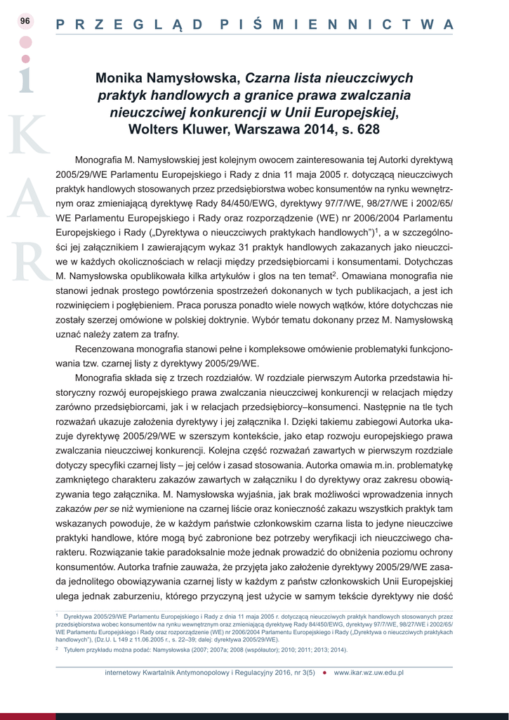 96 P R Z E G L Ą D P I Ś M I E N N I C T W A Monika Namysłowska, Czarna lista nieuczciwych praktyk handlowych a granice prawa zwalczania nieuczciwej konkurencji w Unii Europejskiej, Wolters Kluwer, Warszawa 2014, s. 628 Monografia M. Namysłowskiej jest kolejnym owocem zainteresowania tej Autorki dyrektywą 2005/29/WE Parlamentu Europejskiego i Rady z dnia 11 maja 2005 r. dotyczącą nieuczciwych praktyk handlowych stosowanych przez przedsiębiorstwa wobec konsumentów na rynku wewnętrznym oraz zmieniającą dyrektywę Rady 84/450/EWG, dyrektywy 97/7/WE, 98/27/WE i 2002/65/ WE Parlamentu Europejskiego i Rady oraz rozporządzenie (WE) nr 2006/2004 Parlamentu Europejskiego i Rady („Dyrektywa o nieuczciwych praktykach handlowych”)1, a w szczególności jej załącznikiem I zawierającym wykaz 31 praktyk handlowych zakazanych jako nieuczciwe w każdych okolicznościach w relacji między przedsiębiorcami i konsumentami. Dotychczas M. Namysłowska opublikowała kilka artykułów i glos na ten temat2. Omawiana monografia nie stanowi jednak prostego powtórzenia spostrzeżeń dokonanych w tych publikacjach, a jest ich rozwinięciem i pogłębieniem. Praca porusza ponadto wiele nowych wątków, które dotychczas nie zostały szerzej omówione w polskiej doktrynie. Wybór tematu dokonany przez M. Namysłowską uznać należy zatem za trafny. Recenzowana monografia stanowi pełne i kompleksowe omówienie problematyki funkcjonowania tzw. czarnej listy z dyrektywy 2005/29/WE. Monografia składa się z trzech rozdziałów. W rozdziale pierwszym Autorka przedstawia historyczny rozwój europejskiego prawa zwalczania nieuczciwej konkurencji w relacjach między zarówno przedsiębiorcami, jak i w relacjach przedsiębiorcy–konsumenci. Następnie na tle tych rozważań ukazuje założenia dyrektywy i jej załącznika I. Dzięki takiemu zabiegowi Autorka ukazuje dyrektywę 2005/29/WE w szerszym kontekście, jako etap rozwoju europejskiego prawa zwalczania nieuczciwej konkurencji. Kolejna część rozważań zawartych w pierwszym rozdziale dotyczy specyfiki czarnej listy – jej celów i zasad stosowania. Autorka omawia m.in. problematykę zamkniętego charakteru zakazów zawartych w załączniku I do dyrektywy oraz zakresu obowiązywania tego załącznika. M. Namysłowska wyjaśnia, jak brak możliwości wprowadzenia innych zakazów per se niż wymienione na czarnej liście oraz konieczność zakazu wszystkich praktyk tam wskazanych powoduje, że w każdym państwie członkowskim czarna lista to jedyne nieuczciwe praktyki handlowe, które mogą być zabronione bez potrzeby weryfikacji ich nieuczciwego charakteru. Rozwiązanie takie paradoksalnie może jednak prowadzić do obniżenia poziomu ochrony konsumentów. Autorka trafnie zauważa, że przyjęta jako założenie dyrektywy 2005/29/WE zasada jednolitego obowiązywania czarnej listy w każdym z państw członkowskich Unii Europejskiej ulega jednak zaburzeniu, którego przyczyną jest użycie w samym tekście dyrektywy nie dość 1 Dyrektywa 2005/29/WE Parlamentu Europejskiego i Rady z dnia 11 maja 2005 r. dotyczącą nieuczciwych praktyk handlowych stosowanych przez przedsiębiorstwa wobec konsumentów na rynku wewnętrznym oraz zmieniającą dyrektywę Rady 84/450/EWG, dyrektywy 97/7/WE, 98/27/WE i 2002/65/ WE Parlamentu Europejskiego i Rady oraz rozporządzenie (WE) nr 2006/2004 Parlamentu Europejskiego i Rady („Dyrektywa o nieuczciwych praktykach handlowych”), (Dz.U. L 149 z 11.06.2005 r., s. 22–39; dalej: dyrektywa 2005/29/WE). 2 Tytułem przykładu można podać: Namysłowska (2007; 2007a; 2008 (współautor); 2010; 2011; 2013; 2014). internetowy Kwartalnik Antymonopolowy i Regulacyjny 2016, nr 3(5) www.ikar.wz.uw.edu.pl 97 Anna Zientara Monika Namysłowska, Czarna lista nieuczciwych praktyk handlowych a granice prawa… jednoznacznych pojęć oraz wielość jej wersji językowych. Należy zgodzić się z Autorką, że efektywności załącznika I dyrektywy nie sprzyja także brak harmonizacji zasad sankcjonowania naruszeń zawartych tam zakazów. Kolejne dwa rozdziały Autorka opracowała używając metod, obok dogmatycznej, także – prawonoporównaczej. Do analizy wybrano prawo polskie i niemieckie. Wybór prawa niemieckiego zasługuje na aprobatę. Implementacja dyrektywy o nieuczciwych praktykach handlowych w prawie niemieckim nastąpiła poprzez inkorporowanie zawartych w dyrektywie rozwiązań do istniejącej wcześniej ustawy o zwalczaniu nieuczciwej konkurencji3. Obecnie zatem niemiecka ustawa chroni interesy zarówno przedsiębiorców, jak i konsumentów. Inne rozwiązanie przyjęto w naszym kraju, ponieważ implementacja dyrektywy 2005/29/WE nastąpiła poprzez uchwalenie ustawy z dnia 23 sierpnia 2007 r. o przeciwdziałaniu nieuczciwym praktykom rynkowym4 i dokonanie kilku zmian w ustawie o zwalczaniu nieuczciwej konkurencji5. Zatem w Polsce jedna ustawa (uznk) dotyczy relacji między przedsiębiorcami, druga (upnpr) – relacji przedsiębiorcy–konsumenci. Te różnice w sposobie implementacji dyrektywy 2005/29/WE w Niemczech i w Polsce powodują, że zawarte w recenzowanej monografii rozważania w pełniejszy sposób ukazują trudności wdrożenia czarnej listy do krajowych systemów prawa. Rozdział drugi Autorka poświęciła problematyce wpływu załącznika I dyrektywy 2005/29/WE na prawo Polski i Niemiec. Autorka podjęła słuszną decyzję, aby rozdział ten rozpocząć od przekazania Czytelnikom podstawowych informacji o polskim i niemieckim prawie nieuczciwej konkurencji – jego historycznym rozwoju aż do rozwiązań prawnych obecnie obowiązujących. W dalszej części rozdziału Autorka przedstawia problematykę implementacji czarnej listy z załącznika I dyrektywy do prawa polskiego i niemieckiego, wskazując jakie rozwiązania przyjęto w obu tych państwach. M. Namysłowska szczegółowo omawia także przyjęte w obu tych państwach rozwiązania ustawowe wdrażające podstawowe pojęcia występujące 