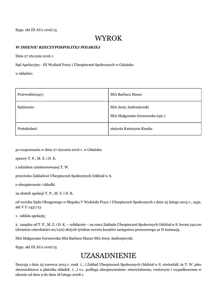 Sygn. akt III AUa 1016/15 WYROK W IMIENIU RZECZYPOSPOLITEJ POLSKIEJ Dnia 27 stycznia 2016 r. Sąd Apelacyjny - III Wydział Pracy i Ubezpieczeń Społecznych w Gdańsku w składzie: Przewodniczący: SSA Barbara Mazur Sędziowie: SSA Jerzy Andrzejewski SSA Małgorzata Gerszewska (spr.) Protokolant: stażysta Katarzyna Kręska po rozpoznaniu w dniu 27 stycznia 2016 r. w Gdańsku sprawy T. P., M. Z. i D. K. z udziałem zainteresowanej T. W. przeciwko Zakładowi Ubezpieczeń Społecznych Oddział w S. o ubezpieczenie i składki na skutek apelacji T. P., M. Z. i D. K. od wyroku Sądu Okręgowego w Słupsku V Wydziału Pracy i Ubezpieczeń Społecznych z dnia 25 lutego 2015 r., sygn. akt V U 1437/13 1. oddala apelację; 2. zasądza od T. P., M. Z. i D. K. – solidarnie – na rzecz Zakładu Ubezpieczeń Społecznych Oddział w S. kwotę 240,00 (dwieście czterdzieści 00/100) złotych tytułem zwrotu kosztów zastępstwa procesowego za II instancję. SSA Małgorzata Gerszewska SSA Barbara Mazur SSA Jerzy Andrzejewski Sygn. akt III AUa 1016/15 UZASADNIENIE Decyzją z dnia 25 czerwca 2013 r. znak (...) Zakład Ubezpieczeń Społecznych Oddział w S. stwierdził, że T. W. jako zleceniobiorca u płatnika składek (...) s.c. podlega ubezpieczeniom: emerytalnemu, rentowym i wypadkowemu w okresie od dnia 9 do dnia 18 lutego 2008 r. W kolejnej decyzji z dnia 25 czerwca 2013 r. znak (...) określono wysokość podstawy wymiaru składek na powyższe ubezpieczenia. Jako podstawę do wydania takiej decyzji wskazano ustalenia postępowania kontrolnego przeprowadzonego u płatnika, z których wynika, że płatnik zawarł z zainteresowaną umowę cywilnoprawną - o dzieło, której przedmiotem była ,,praca jako opiekun dzieci – wychowawca podczas zimowiska w B.”. Organ rentowy podkreślił, że treść oraz realizacja w/w umowy - mimo iż strony nazwały pisemną umowę umową o dzieło - faktycznie stanowiła umowę o świadczenie usług, do której należy stosować przepisy o zleceniu. Odwołania od powyższych decyzji wniosło Przedsiębiorstwo Usług (...) s.c. T. P., M. Z., D. K. domagając się jej uchylenia w całości oraz zasądzenia od organu rentowego kosztów postępowania sądowego. Zaskarżonej decyzji zarzucili naruszenie przepisów Kodeksu postępowania administracyjnego, poprzez wadliwe określenie strony wydanej decyzji, wadliwe wskazanie podstawy prawnej wydanej decyzji, wadliwe uzasadnienie decyzji, nie przeprowadzenie podstępowania dowodowego w pełnym zakresie oraz wadliwą interpretację przepisów o systemie ubezpieczeń społecznych. Nadto, zarzucili nieuwzględnienie brzmienia przepisu art.12 ust 3 ustawy o systemie ubezpieczeń społecznych w brzmieniu obowiązującym do dnia 01 września 2009 r., z którego wynika, że nie podlegają ubezpieczeniu wypadkowemu osoby o których mowa w art. 6 ust 1 pkt 4, jeżeli wykonują pracę poza siedzibą lub miejscem prowadzenia działalności zleceniodawcy. W odpowiedzi na odwołanie Zakład Ubezpieczeń Społecznych Oddział w S. wniósł o jego oddalenie oraz zasądzenie na rzecz organu rentowego kosztów zastępstwa prawnego według norm przepisanych. W uzasadnieniu organ rentowy podkreślił, że zawarta z zainteresowaną umowa nie była umową o dzieło, lecz wyczerpywała w pełni definicję umowy o świadczenie usług, do której stosuje się przepisy dotyczące umowy zlecenia, jako właściwego rodzaju stosunku prawnego łączącego strony. Obie sprawy toczące się z odwołania wspólników spółki cywilnej z udziałem T. W. postanowieniem Sądu Okręgowego w Słupsku V Wydziału Pracy i Ubezpieczeń Społecznych z dnia 25 września 2013 r. w sprawie V U 1438/13 zostały połączone do wspólnego rozpoznania i rozstrzygnięcia oraz prowadzenia pod wspólną sygnaturą V U 1437/13. Wyrokiem z dnia 25 lutego 2015 r. w sprawie V U 1437/13 Sąd Okręgowy w Słupsku V Wydział Pracy i Ubezpieczeń Społecznych: I. oddalił odwołanie od decyzji z dnia 25 czerwca 2013 r. ustalającej podleganie obowiązkowym ubezpieczeniom społecznym, II. oddalił odwołanie od decyzji z dnia 25 czerwca 2013 r. ustalającej podstawę wymiaru składek, III. zasądził solidarnie od T. P.. M. Z. i D. K. na rzecz Zakładu Ubezpieczeń Społecznych Oddział w S. kwotę 120 zł tytułem zwrotu kosztów procesu. Podstawę tego rozstrzygnięcia stanowiły następujące ustalenia i rozważania Sądu I instancji: (...) spółki cywilnej Przedsiębiorstwo Usług (...), M. Z., D. K. prowadzą działalność gospodarczą w zakresie świadczenia usług turystycznych od dnia 1 grudnia 2007 r. organizując między innymi kolonie, zimowiska i obozy dla dzieci i młodzieży, a także imprezy turystyczne. W okresie od dnia 1 grudnia 2007 r. do dnia 31 grudnia 2011 r. spółka deklarowała składki jedynie za pracowników, którzy w tym okresie byli zatrudnieni w oparciu o umowę o pracę. W celu realizacji umów wynikających z prowadzonej działalności z pilotami wycieczek, wychowawcami, opiekunami, ratownikami zawierali umowy cywilno-prawne –umowy o dzieło. Organizacja imprez turystycznych odbywała się zgodnie z wymogami ustawy o systemie oświaty. W szybach tej działalności organizowali między innymi imprezę turystyczną w B.. Zainteresowana zawarła w dniu 7 lutego 2008 r. z Przedsiębiorstwem Usług (...) s.c. T. P., M. Z., D. K. umowę o dzieło na okres od dnia 9 lutego 2008 r. do dnia 18 lutego 2008 r., zobowiązując się do wykonania dzieła polegającego na pracy jako opiekun dzieci – wychowawca podczas zimowiska w B.. Wynagrodzenie w wysokości 590 zł brutto wypłacano zainteresowanej w kwocie określonej w umowie. W okresie wykonywania umowy zainteresowana pobierała świadczenie emerytalne i nie posiadała innych tytułów do ubezpieczenia. Program pobytu podczas zimowiska w B. obejmował zajęcia: sportowe, rozrywkowe, kulturalne również wycieczki turystyczne do Z., K., T.. Uczestnicy zimowiska brali również udział w zajęciach na