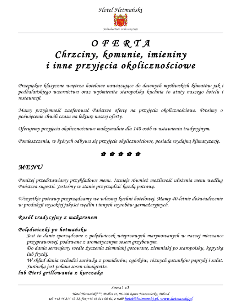 OFERTA Chrzciny, komunie, imieniny i inne przyjęcia okolicznościowe Przepiękne klasyczne wnętrza hotelowe nawiązujące do dawnych myśliwskich klimatów jak i podhalańskiego wzornictwa oraz wyśmienita staropolska kuchnia to atuty naszego hotelu i restauracji. Mamy przyjemność zaoferować Państwo ofertę na przyjęcia okolicznościowe. Prosimy o poświęcenie chwili czasu na lekturę naszej oferty. Oferujemy przyjęcia okolicznościowe maksymalnie dla 140 osób w ustawieniu tradycyjnym. Pomieszczenia, w których odbywa się przyjęcie okolicznościowe, posiada wydajną klimatyzację. MENU Poniżej przedstawiamy przykładowe menu. Istnieje również możliwość ułożenia menu według Państwa sugestii. Jesteśmy w stanie przyrządzić każdą potrawę. Wszystkie potrawy przyrządzamy we własnej kuchni hotelowej. Mamy 40-letnie doświadczenie w produkcji wysokiej jakości wędlin i innych wyrobów garmażeryjnych. Rosół tradycyjny z makaronem Polędwiczki po hetmańsku Jest to danie sporządzone z polędwiczek wieprzowych marynowanych w naszej mieszance przyprawowej, podawane z aromatycznym sosem grzybowym. Do dania serwujemy wedle życzenia ziemniaki gotowane, ziemniaki po staropolsku, kopytka lub frytki. W skład dania wchodzi surówka z pomidorów, ogórków, różnych gatunków papryki i sałat. Surówka jest polana sosen vinaigrette. lub Pierś grillowania z kurczaka Strona 1 z 3 Hotel Hetmański***, Podlas 46, 96-200 Rawa Mazowiecka, Poland tel. +48 46 814-42-32, fax +48 46 814-00-61, e-mail: [email protected], www.hetmanski.pl Barszcz czerwony podawany z wyśmienitymi pierogami babuni z grzybami i kapustą lub krokiety. Puchar lodów z bitą śmietaną i owocami Zakąski w stole Talerz wędlin własnego wyrobu: szynka, polędwica, baleron, schab pieczony, kark pieczony, pasztet. Rolada rybna w galarecie Szynka w towarzystwie szparag Śledź pod śmietanową kołderką Wybór sałatek Desery Sernik Wykwintne ciasto kruche z owocami Keks Dodatki Pieczywo Masło śmietankowe Chrzan Pomidory ogórki Napoje Herbata Kawa CENA Oferujemy przyjęcie okolicznościowe w cenie 100 zł za 1 osobę. W ramach powyżej ceny zapewniamy: Pełna obsługę personelu restauracji Menu zgodnie z opisem w ofercie parking przed hotelem W przypadku chrzcin oferujemy bezpłatnie pokój dwuosobowy dla Mamy. Strona 2 z 3 Hotel Hetmański***, Podlas 46, 96-200 Rawa Mazowiecka, Poland tel. +48 46 814-42-32, fax +48 46 814-00-61, e-mail: [email protected], www.hetmanski.pl POKOJE HOTELOWE Oferujemy pokoje hotelowe dla Gości w specjalnych cenach. Ustalamy rabat na pokoje w zależności ilości zajętych pokojów. Hotel Hetmański *** posiada 34 pokoje, w tym: 2 luksusowe apartamenty „HETMAN” składające się z pokoju dziennego i sypialni oraz dwóch łazienek, 2 luksusowe apartamenty „KANCLERZ” składające się z pokoju dziennego i sypialni oraz dwóch łazienek, 30 komfortowych pokoi dwuosobowych z łazienką. Wszystkie pokoje w Hotelu Hetmańskim *** wyposażone są w telewizor, telefon, radio z budzikiem. Dodatkowo apartamenty posiadają rozwiniętą część wypoczynkową: dwa fotele i stolik. KONTAKT Hotel Hetmański *** Podlas 46 96-200 Rawa Mazowiecka tel. +48 46 814-42-32 tel. / fax +48 46 814-00-61 e-mail: [email protected] www.hetmanski.pl Zapraszamy ! ! ! Strona 3 z 3 Hotel Hetmański***, Podlas 46, 96-200 Rawa Mazowiecka, Poland tel. +48 46 814-42-32, fax +48 46 814-00-61, e-mail: [email protected], www.hetmanski.pl