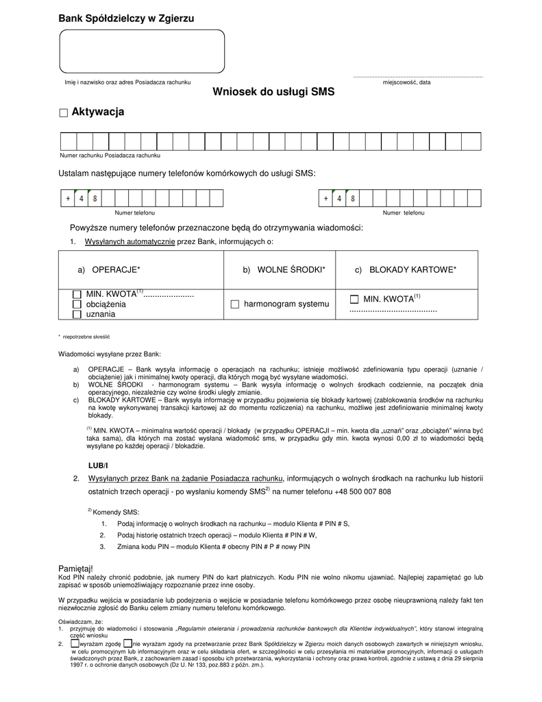 Bank Spółdzielczy w Zgierzu ................................................................................ miejscowość, data Imię i nazwisko oraz adres Posiadacza rachunku Wniosek do usługi SMS Aktywacja Numer rachunku Posiadacza rachunku Ustalam następujące numery telefonów komórkowych do usługi SMS: Numer telefonu Numer telefonu PowyŜsze numery telefonów przeznaczone będą do otrzymywania wiadomości: 1. Wysyłanych automatycznie przez Bank, informujących o: a) OPERACJE* b) WOLNE ŚRODKI* c) BLOKADY KARTOWE* (1) MIN. KWOTA ...................... obciąŜenia uznania (1) harmonogram systemu MIN. KWOTA ...................................... * niepotrzebne skreślić Wiadomości wysyłane przez Bank: a) b) c) OPERACJE – Bank wysyła informację o operacjach na rachunku; istnieje moŜliwość zdefiniowania typu operacji (uznanie / obciąŜenie) jak i minimalnej kwoty operacji, dla których mogą być wysyłane wiadomości. WOLNE ŚRODKI - harmonogram systemu – Bank wysyła informację o wolnych środkach codziennie, na początek dnia operacyjnego, niezaleŜnie czy wolne środki uległy zmianie. BLOKADY KARTOWE – Bank wysyła informację w przypadku pojawienia się blokady kartowej (zablokowania środków na rachunku na kwotę wykonywanej transakcji kartowej aŜ do momentu rozliczenia) na rachunku, moŜliwe jest zdefiniowanie minimalnej kwoty blokady. (1) MIN. KWOTA – minimalna wartość operacji / blokady (w przypadku OPERACJI – min. kwota dla „uznań” oraz „obciąŜeń” winna być taka sama), dla których ma zostać wysłana wiadomość sms, w przypadku gdy min. kwota wynosi 0,00 zł to wiadomości będą wysyłane po kaŜdej operacji / blokadzie. LUB/I 2. Wysyłanych przez Bank na Ŝądanie Posiadacza rachunku, informujących o wolnych środkach na rachunku lub historii ostatnich trzech operacji - po wysłaniu komendy SMS2) na numer telefonu +48 500 007 808 2) Komendy SMS: 1. Podaj informację o wolnych środkach na rachunku – modulo Klienta # PIN # S, 2. Podaj historię ostatnich trzech operacji – modulo Klienta # PIN # W, 3. Zmiana kodu PIN – modulo Klienta # obecny PIN # P # nowy PIN Pamiętaj! Kod PIN naleŜy chronić podobnie, jak numery PIN do kart płatniczych. Kodu PIN nie wolno nikomu ujawniać. Najlepiej zapamiętać go lub zapisać w sposób uniemoŜliwiający rozpoznanie przez inne osoby. W przypadku wejścia w posiadanie lub podejrzenia o wejście w posiadanie telefonu komórkowego przez osobę nieuprawnioną naleŜy fakt ten niezwłocznie zgłosić do Banku celem zmiany numeru telefonu komórkowego. Oświadczam, Ŝe: 1. przyjmuję do wiadomości i stosowania „Regulamin otwierania i prowadzenia rachunków bankowych dla Klientów indywidualnych”, który stanowi integralną część wniosku 2. wyraŜam zgodę nie wyraŜam zgody na przetwarzanie przez Bank Spółdzielczy w Zgierzu moich danych osobowych zawartych w niniejszym wniosku, w celu promocyjnym lub informacyjnym oraz w celu składania ofert, w szczególności w celu przesyłania mi materiałów promocyjnych, informacji o usługach świadczonych przez Bank, z zachowaniem zasad i sposobu ich przetwarzania, wykorzystania i ochrony oraz prawa kontroli, zgodnie z ustawą z dnia 29 sierpnia 1997 r. o ochronie danych osobowych (Dz U. Nr 133, poz.883 z późn. zm.). Bank Spółdzielczy w Zgierzu Zmiana zakresu usługi Zgłaszam zmianę numeru telefonu komórkowego do usługi SMS: Dotychczasowy numer telefonu Zmieniony numer telefonu Zgłaszam zmianę sposobu otrzymywania informacji: a) OPERACJE* MIN. KWOTA ….................. obciąŜenia uznania b) WOLNE ŚRODKI* c) BLOKADY KARTOWE* harmonogram systemu MIN. KWOTA blokady ........................................... * niepotrzebne skreślić Rezygnacja z usługi Składam rezygnację z usługi SMS, przekazywanej na telefon komórkowy nr: Numer telefonu Numer telefonu .......................................................... data i podpis Posiadacza rachunku Usługę uaktywniono* / zmieniono zakres usługi* / usługę anulowano* * niepotrzebne skreślić ............................................................................... podpis i stempel memoriałowy pracownika przyjmującego i wprowadzającego ............................................................................... podpis pracownika sprawdzającego
