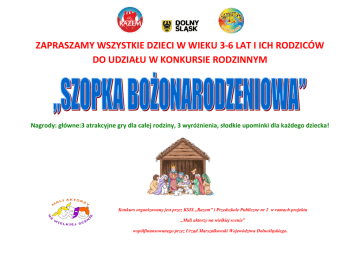 ZAPRASZAMY WSZYSTKIE DZIECI W WIEKU 3-6 LAT I ICH RODZICÓW DO UDZIAŁU W KONKURSIE RODZINNYM Nagrody: główne:3 atrakcyjne gry dla całej rodziny, 3 wyróżnienia, słodkie upominki dla każdego dziecka! Konkurs organizowany jest przez KSIS „Razem” i Przedszkole Publiczne nr 2 w ramach projektu „Mali aktorzy na wielkiej scenie” współfinansowanego przez Urząd Marszałkowski Województwa Dolnośląskiego. REGULAMIN KONKURSU RODZINNEGO ORGANIZATORZY: Kamiennogórskie Stowarzyszenie Inicjatyw Społecznych „Razem” Przedszkole Publiczne Nr 2 w Kamiennej Górze Przy współudziale Centrum Kultury w Kamiennej Górze CELE KONKURSU: Rozwijanie wrażliwości estetycznej i ekspresji twórczej Wyzwalanie kreatywności Czerpanie radości z tworzenia Wzmacnianie więzi rodzinnych oraz współpracy z rodzicami Kultywowanie tradycji świątecznych WARUNKI UCZESTNICTWA: 1. 2. 3. 4. 5. W konkursie mogą wziąć udział dzieci w wieku 3-6 lat wraz z rodzicami; taki zespół przygotowuje jedną pracę. Praca powinna być opatrzona metryczką zawierającą: imię i nazwisko dziecka, wiek, imię i nazwisko rodzica, ew. adres przedszkola. Do pracy należy dołączyć oświadczenie o przeniesieniu praw autorskich. Prace można wykonać w dowolnej technice przestrzennej i dowolnej wielkości. Prace należy złożyć w Przedszkolu Publicznym Nr 2 do dnia 6.12.2013r. i przekazać osobom odpowiedzialnym za konkurs: Maria Hypś, Iwona Gurgul. 6. Oceny prac dokona powołana przez organizatorów Komisja Konkursowa. Decyzja Komisji Konkursowej będzie uważana za ostateczną. 7. Zostaną ufundowane 3 nagrody główne (atrakcyjne gry dla całej rodziny), 3 wyróżnienia oraz słodkie upominki i dyplomy za uczestnictwo dla każdego dziecka. 8. Rozstrzygnięcie konkursu i wręczenie nagród nastąpi dnia 17.12.2013r. o godzinie 15:00 w Centrum Kultury w Kamiennej Górze. 9. Podczas rozstrzygnięcia konkursu zapraszamy do udziału w świątecznym kiermaszu prac konkursowych i ciast. Dochód z kiermaszu przekazany będzie na rzecz dzieci z chorobami onkologicznymi z naszego powiatu. 10. Przystępując do konkursu uczestnicy zobowiązują się do przekazania na rzecz organizatorów praw autorskich do pracy konkursowej. Przekazanie tychże praw nastąpi w drodze odrębnej umowy i nie pociąga za sobą żadnych zobowiązań finansowych. UWAGI ORGANIZACYJNE: 1. Prace nieprawidłowo opisane oraz nie zawierające „Oświadczenia o przeniesieniu praw autorskich” nie będą rozpatrywane. 2. Prace dostarczone po terminie nie będą rozpatrywane. 3. Wszelkich dodatkowych informacji udzielać będzie osoba odpowiedzialna w przedszkolu za przeprowadzenie konkursu Iwona Gurgul, , numer tel. 756453444., e-mail [email protected] 4. Regulamin konkursu można znaleźć również na stronie WWW.przedszkole2kg.edupage.org w zakładce „Aktualności”. 5. Kwestie nieuregulowane niniejszym regulaminem rozstrzyga Komisja Konkursowa i ostateczna interpretacja Regulaminu należy do w/w Komisji. OŚWIADCZENIE O PRZENIESIENIU PRAW AUTORSKICH Przystępując do KONKURSU RODZINNEGO „SZOPKA BOŻONARODZENIOWA” oświadczam, że jako uczestnik konkursu, przez fakt przystąpienia do konkursu zezwalam organizatorom na : Prezentację wykonanej przeze mnie pracy na wystawie konkursowej w Centrum Kultury w Kamiennej Górze Objęcie własnością przekazanej na konkurs pracy. …………………………………., dn. ………….... …………………………………………….. (czytelny podpis)