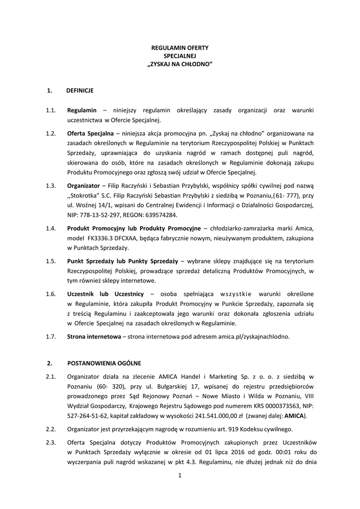 REGULAMIN OFERTY SPECJALNEJ „ZYSKAJ NA CHŁODNO” 1. DEFINICJE 1.1. Regulamin – niniejszy regulamin określający zasady organizacji oraz warunki uczestnictwa w Ofercie Specjalnej. 1.2. Oferta Specjalna – niniejsza akcja promocyjna pn. „Zyskaj na chłodno” organizowana na zasadach określonych w Regulaminie na terytorium Rzeczypospolitej Polskiej w Punktach Sprzedaży, uprawniająca do uzyskania nagród w ramach dostępnej puli nagród, skierowana do osób, które na zasadach określonych w Regulaminie dokonają zakupu Produktu Promocyjnego oraz zgłoszą swój udział w Ofercie Specjalnej. 1.3. Organizator – Filip Raczyński i Sebastian Przybylski, wspólnicy spółki cywilnej pod nazwą ,,Stokrotka” S.C. Filip Raczyński Sebastian Przybylski z siedzibą w Poznaniu,( 61- 777), przy ul. Woźnej 14/1, wpisani do Centralnej Ewidencji i Informacji o Działalności Gospodarczej, NIP: 778-13-52-297, REGON: 639574284. 1.4. Produkt Promocyjny lub Produkty Promocyjne – chłodziarko-zamrażarka marki Amica, model FK3336.3 DFCXAA, będąca fabrycznie nowym, nieużywanym produktem, zakupiona w Punktach Sprzedaży. 1.5. Punkt Sprzedaży lub Punkty Sprzedaży – wybrane sklepy znajdujące się na terytorium Rzeczypospolitej Polskiej, prowadzące sprzedaż detaliczną Produktów Promocyjnych, w tym również sklepy internetowe. 1.6. Uczestnik lub Uczestnicy – osoba spełniająca wszystkie warunki określone w Regulaminie, która zakupiła Produkt Promocyjny w Punkcie Sprzedaży, zapoznała się z treścią Regulaminu i zaakceptowała jego warunki oraz dokonała zgłoszenia udziału w Ofercie Specjalnej na zasadach określonych w Regulaminie. 1.7. Strona internetowa – strona internetowa pod adresem amica.pl/zyskajnachlodno. 2. POSTANOWIENIA OGÓLNE 2.1. Organizator działa na zlecenie AMICA Handel i Marketing Sp. z o. o. z siedzibą w Poznaniu (60- 320), przy ul. Bułgarskiej 17, wpisanej do rejestru przedsiębiorców prowadzonego przez Sąd Rejonowy Poznań – Nowe Miasto i Wilda w Poznaniu, VIII Wydział Gospodarczy, Krajowego Rejestru Sądowego pod numerem KRS 0000373563, NIP: 527-264-51-62, kapitał zakładowy w wysokości 241.541.000,00 zł (zwanej dalej: AMICA). 2.2. Organizator jest przyrzekającym nagrodę w rozumieniu art. 919 Kodeksu cywilnego. 2.3. Oferta Specjalna dotyczy Produktów Promocyjnych zakupionych przez Uczestników w Punktach Sprzedaży wyłącznie w okresie od 01 lipca 2016 od godz. 00:01 roku do wyczerpania puli nagród wskazanej w pkt 4.3. Regulaminu, nie dłużej jednak niż do dnia 1 31 sierpnia 2016 roku, godz. 23:59, przy czym w przypadku zakupu Produktu Promocyjnego w sklepie internetowym o zachowaniu powyższego terminu decyduje moment wpłynięcia zamówienia dotyczącego Produktu Promocyjnego na serwer sklepu internetowego. 2.4. Informacje na temat Oferty Specjalnej udostępniane będą poprzez materiały informacyjne umieszczone w Punktach Sprzedaży oraz na Stronie internetowej. 2.5. Udział w Ofercie Specjalnej jest całkowicie dobrowolny, jak również bezpłatny – Uczestnik nie musi dokonywać jakichkolwiek płatności na rzecz Organizatora z tego tytułu. 2.6. Podczas trwania Oferty Specjalnej uruchomiona jest infolinia pod numerem: +48 781 655 665, czynna w godzinach 9:00 – 18:00, od poniedziałku do niedzieli, pod którym można uzyskać szczegółowe informacje dotyczące Oferty Specjalnej. Koszt połączenia: wg aktualnych stawek operatora telefonii dzwoniącego. 3. ZASADY UDZIAŁU W OFERCIE SPECJALNEJ 3.1. W Ofercie Specjalnej mogą wziąć udział wyłącznie osoby fizyczne, posiadające miejsce zamieszkania na terytorium Rzeczypospolitej Polskiej, posiadające pełną zdolność do czynności prawnych, dokonujące zakupu Produktu Promocyjnego w charakterze konsumenta w rozumieniu art. 221Kodeksu cywilnego. W Ofercie Specjalnej nie mogą wziąć udziału osoby prawne, jednostki organizacyjne nie posiadające osobowości prawnej lub osoby fizyczne dokonujące zakupu w związku z prowadzoną działalnością gospodarczą. 3.2. W Ofercie Specjalnej nie mogą brać udziału pracownicy O r g a n i z a t o r a i A m i c a oraz członkowie ich rodzin. W Ofercie Specjalnej nie mogą również uczestniczyć właściciele (i współwłaściciele) Punktów Sprzedaży, członkowie organów podmiotów prowadzących Punkty Sprzedaży lub ich wspólnicy, pracownicy zatrudnieni w Punktach Sprzedaży oraz członkowie rodzin wyżej wymienionych osób. P rzez praco wnikó w ro zum ie się także o so by , z któ rym i nawiązany zo stał sto sunek cywilno prawny na po dstawie um o wy cywilno prawnej. Przez członków rodzin osób, o których mowa powyżej, rozumie się: rodziców, opiekunów prawnych, rodzeństwo, małżonków, rodziców małżonków, dzieci i osoby pozostające w stosunku przysposobienia z pracownikiem. 3.3. Warunki uprawniające do udziału w Ofercie Specjalnej i przyznania nagrody określonej w punkcie 4.1. Regulaminu są następujące i muszą zostać spełnione łącznie: 3.3.1. dokonanie przez Uczestnika zakupu Produktu Promocyjnego w Punkcie Sprzedaży w okresie trwania Oferty Specjalnej, wskazanym w pkt 2.3. Regulaminu; 3.3.2. dokonanie zgłoszenia udziału w Ofercie Specjalnej w jednej ze wskazanych poniżej form (do wyboru przez Uczestnika) w terminie wskazanym w pkt 3.5. Regulaminu poprzez: 3.3.2.1. zarejestrowanie się przez Uczestnika na Stronie internetowej poprzez wypełnienie prawidłowo i w całości dostępnego tam formularza zgłoszeniowego oraz załączenie do niego czytelnego skanu/kopii dowodu 2 zakupu Produktu Promocyjnego (zawierającego opis modelu Produktu Promocyjnego) albo 3.3.2.2. przesłanie skanu wypełnionego prawidłowo i w całości formularza zgłoszeniowego pobranego ze Strony internetowej oraz przesłanie czytelnego skanu/kopii dowodu zakupu Produktu Promocyjnego 30 za pośrednictwem wiadomości elektronicznej na adres: [email protected] albo 3.3.2.3. przesłanie wypełnionego prawidłowo i w ca