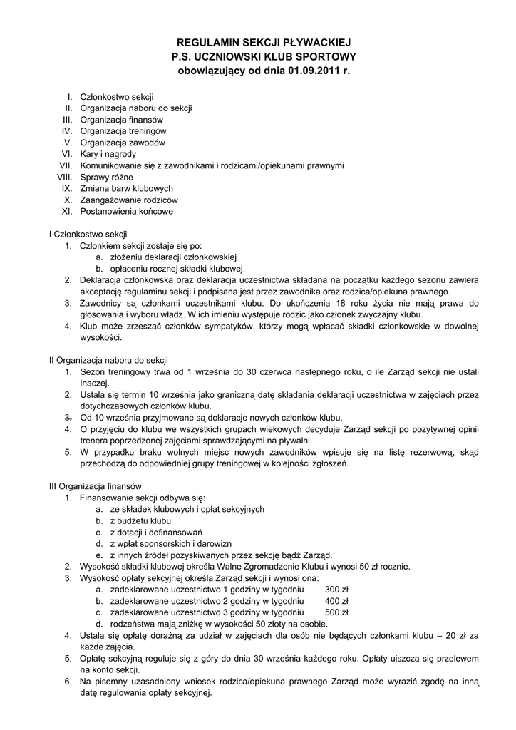 REGULAMIN SEKCJI PŁYWACKIEJ P.S. UCZNIOWSKI KLUB SPORTOWY obowiązujący od dnia 01.09.2011 r. I. II. III. IV. V. VI. VII. VIII. IX. X. XI. Członkostwo sekcji Organizacja naboru do sekcji Organizacja finansów Organizacja treningów Organizacja zawodów Kary i nagrody Komunikowanie się z zawodnikami i rodzicami/opiekunami prawnymi Sprawy różne Zmiana barw klubowych Zaangażowanie rodziców Postanowienia końcowe I Członkostwo sekcji 1. Członkiem sekcji zostaje się po: a. złożeniu deklaracji członkowskiej b. opłaceniu rocznej składki klubowej. 2. Deklaracja członkowska oraz deklaracja uczestnictwa składana na początku każdego sezonu zawiera akceptację regulaminu sekcji i podpisana jest przez zawodnika oraz rodzica/opiekuna prawnego. 3. Zawodnicy są członkami uczestnikami klubu. Do ukończenia 18 roku życia nie mają prawa do głosowania i wyboru władz. W ich imieniu występuje rodzic jako członek zwyczajny klubu. 4. Klub może zrzeszać członków sympatyków, którzy mogą wpłacać składki członkowskie w dowolnej wysokości. II Organizacja naboru do sekcji 1. Sezon treningowy trwa od 1 września do 30 czerwca następnego roku, o ile Zarząd sekcji nie ustali inaczej. 2. Ustala się termin 10 września jako graniczną datę składania deklaracji uczestnictwa w zajęciach przez dotychczasowych członków klubu. 3. Od 10 września przyjmowane są deklaracje nowych członków klubu. 4. O przyjęciu do klubu we wszystkich grupach wiekowych decyduje Zarząd sekcji po pozytywnej opinii trenera poprzedzonej zajęciami sprawdzającymi na pływalni. 5. W przypadku braku wolnych miejsc nowych zawodników wpisuje się na listę rezerwową, skąd przechodzą do odpowiedniej grupy treningowej w kolejności zgłoszeń. III Organizacja finansów 1. Finansowanie sekcji odbywa się: a. ze składek klubowych i opłat sekcyjnych b. z budżetu klubu c. z dotacji i dofinansowań d. z wpłat sponsorskich i darowizn e. z innych źródeł pozyskiwanych przez sekcję bądź Zarząd. 2. Wysokość składki klubowej określa Walne Zgromadzenie Klubu i wynosi 50 zł rocznie. 3. Wysokość opłaty sekcyjnej określa Zarząd sekcji i wynosi ona: a. zadeklarowane uczestnictwo 1 godziny w tygodniu 300 zł b. zadeklarowane uczestnictwo 2 godziny w tygodniu 400 zł c. zadeklarowane uczestnictwo 3 godziny w tygodniu 500 zł d. rodzeństwa mają zniżkę w wysokości 50 złoty na osobie. 4. Ustala się opłatę doraźną za udział w zajęciach dla osób nie będących członkami klubu – 20 zł za każde zajęcia. 5. Opłatę sekcyjną reguluje się z góry do dnia 30 września każdego roku. Opłaty uiszcza się przelewem na konto sekcji. 6. Na pisemny uzasadniony wniosek rodzica/opiekuna prawnego Zarząd może wyrazić zgodę na inną datę regulowania opłaty sekcyjnej. 7. Nieobecność na zajęciach nie upoważnia do pomniejszenia opłaty sekcyjnej. Opłaty sekcyjne i składka klubowa nie podlegają zwrotowi. 8. W przypadku kontuzji lub choroby skutkującej nieobecnością na zajęciach przez cały miesiąc kalendarzowy i udokumentowanej przez lekarza obniża się opłatę sekcyjną w kolejnym miesiącu o połowę. 9. W przypadkach uzasadnionych ciężkimi wydarzeniami losowymi Zarząd może odstąpić od pobrania opłaty sekcyjnej na pisemny wniosek rodzica. 10. Z budżetu sekcji finansuje się: a. wynajem pływalni b. wynagrodzenie trenerów c. opłaty związane z bieżącym funkcjonowaniem sekcji d. opłaty statutowe Polskiego Związku Pływackiego i Okręgowego Związku Pływackiego e. zakup sprzętu treningowego f. inne wydatki niezbędne do funkcjonowania sekcji 11. Sekcja pokrywa koszty opłat startowych zawodników reprezentujących klub w mistrzostwach Polski, po wypełnieniu limitów określonych przez załączniki regulaminu. 12. Po zakończeniu sezonu skarbnik przedstawia dokumentację finansową do wglądu Komisji Rewizyjnej i Prezesowi Klubu oraz na kończącym sezon zebraniu rodziców. 13. Rodzice/opiekunowie prawni finansują: a. opłatę klubową i opłaty sekcyjne b. wyposażenie pływackie (we własnym zakresie) – 2 pary okularków, 2 czepki, 2 stroje pływackie, klapki , płetwy c. odzież klubową – koszulka i bluza dresowa, ewentualnie czepek d. opłaty startowe oraz koszty transportu i pobytu na zawodach e. obowiązkowe badania lekarskie f. licencje zawodnicze g. obozy i zgrupowania IV Organizacja treningów 1. Ustala się podział na grupy treningowe zgodnie z wiekiem zawodnika na początek sezonu. 2. Treningi odbywają się na pływalni Uniwersytetu Pedagogicznego przy ul. Ingardena 4 w Krakowie . W ramach rocznego cyklu treningowego zajęcia mogą odbywać się w innych ustalonych przez trenerów miejscach. 3. Do zajęć dopuszczany zostaje zawodnik: a. po złożeniu podpisanej deklaracji członkowskiej/uczestnictwa b. po uiszczeniu rocznej składki klubowej c. bez zaległości w opłatach sekcyjnych d. posiadający ważne badania lekarskie. 4. Zawodnik stawia się na trening na 10 minut przed jego rozpoczęciem z niezbędnym wyposażeniem pływackim: strój pływacki, czepek, okularki, płetwy, ręcznik. Zaleca się posiadanie kompletu zapasowego. 5. Zawodnik zobowiązany jest do: a. kulturalnego i zgodnego z wewnętrznym regulaminem zachowania się na terenie obiektu b. koleżeńskiego zachowania wobec innych zawodników c. bezwzględnego wykonywania poleceń trenera dotyczących organizacji zajęć d. zgłaszania trenerowi przed i w czasie zajęć problemów zdrowotnych e. niezwłocznego opuszczenia basenu i szatni po skończonych zajęciach. 6. Rodzice/opiekunowie prawni zobowiązani są do zapewnienia bezpieczeństwa dziecku po wyjściu z szatni. 7. Zarząd może odwołać trening w związku z uczestnictwem sekcji w zawodach. V Organizacja zawodów 1. Zawodnicy sekcji UKS SALWATOR biorą udział w zawodach obowiązkowych i dobrowolnych. Zawodami obowiązkowymi są Mistrzostwa Polski, Mistrzostwa Okręgu. Pozostałe zawody są zawodami dobrowolnymi. 2. Zawodn