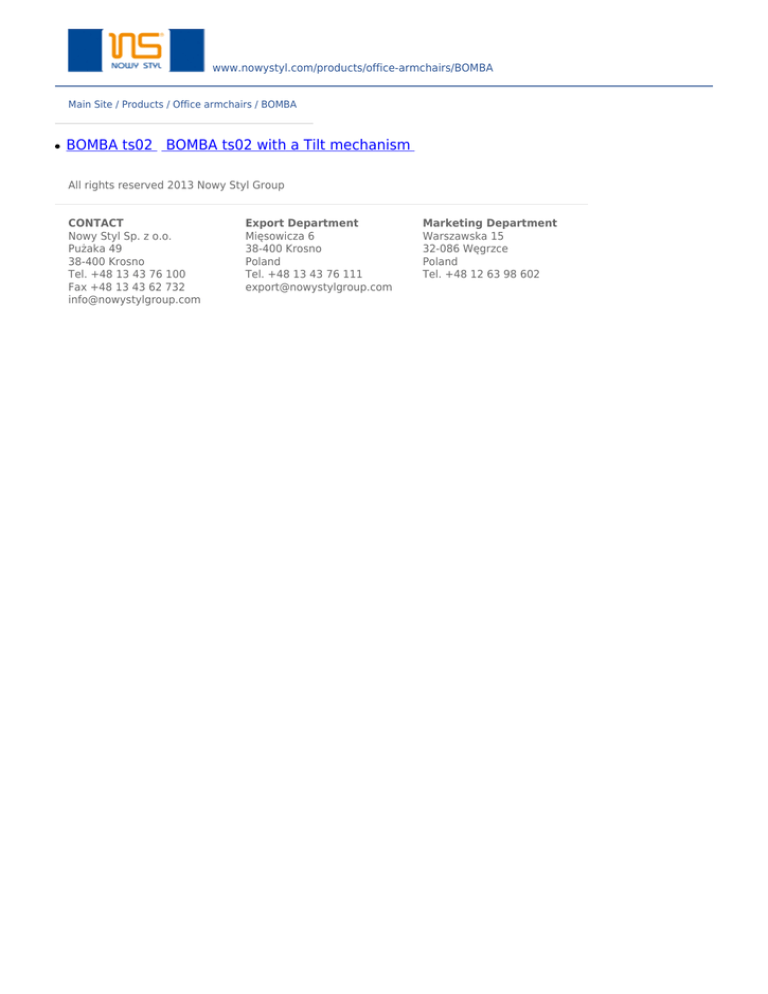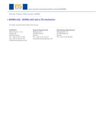 www.nowystyl.com/products/office-armchairs/BOMBA Main Site / Products / Office armchairs / BOMBA ● BOMBA ts02 BOMBA ts02 with a Tilt mechanism All rights reserved 2013 Nowy Styl Group CONTACT Nowy Styl Sp. z o.o. Pużaka 49 38-400 Krosno Tel. +48 13 43 76 100 Fax +48 13 43 62 732 [email protected] Export Department Mięsowicza 6 38-400 Krosno Poland Tel. +48 13 43 76 111 [email protected] Marketing Department Warszawska 15 32-086 Węgrzce Poland Tel. +48 12 63 98 602