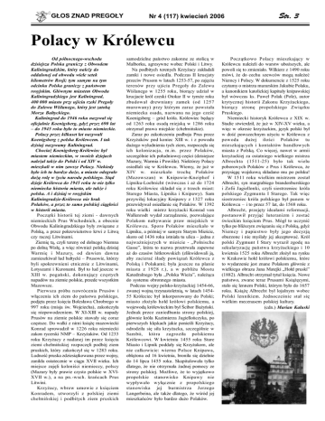 GŁOS ZNAD PREGOŁY Nr 4 (117) kwiecień 2006 Str. 3 Polacy w Królewcu Od północnego-wschodu dzisiejsza Polska graniczy z Obwodem Kaliningradzkim, który należy do oddalonej od obwodu wiele setek kilometrów Rosji; tym samym na tym odcinku Polska graniczy z państwem rosyjskim. Głównym miastem Obwodu Kaliningradzkiego jest Kaliningrad, 400 000 miasto przy ujściu rzeki Pregoły do Zalewu Wiślanego, który jest zatoką Morza Bałtyckiego. Kaliningrad do 1946 roku nazywał się oficjalnie Koenigsberg, gdyż przez 690 lat – do 1945 roku było to miasto niemieckie. Polacy przez kilkaset lat nazywali Koenigsberg z polska Królewcem. I tak dzisiaj nazywamy Kaliningrad. Chociaż Koenigsberg-Królewiec był miastem niemieckim, w swoich dziejach należał także do Polski i od XIV w. mieszkali w nim zawsze Polacy. Niekiedy było ich tu bardzo dużo, a miasto odegrało dużą rolę w życiu narodu polskiego. Stąd dzieje Królewca do 1945 roku to nie tylko niemiecka historia miasta, ale także i polska. A i dzisiaj w rosyjskim Kaliningradzie-Królewcu nie brak Polaków, a przez to samo polskiej ciągłości w historii miasta. Początki historii tej ziemi - dawnych niemieckich Prus Wschodnich, a obecnie Obwodu Kaliningradzkiego były związane z Polską, a przez pokrewieństwo krwi z Litwą czy raczej Litwinami. Ziemię tą, czyli tereny od dolnego Niemna po dolną Wisłę, a więc również polską dzisiaj Warmię i Mazury, od dawien dawna zamieszkiwał lud bałtycki – Prusowie, którzy byli spokrewnieni etnicznie z Litwinami, Łotyszami i Kuronami. Był to lud jeszcze w XIII w. pogański, dokonujący częstych napadów na ziemie polskie, przede wszystkim Mazowsze. Pierwsza próba nawrócenia Prusów i włączenia ich ziem do państwa polskiego, podjęta przez księcia Bolesława Chrobrego w 997 roku (misja św. Wojciecha), zakończyła się niepowodzeniem. W XI-XIII w. napady Prusów na ziemie polskie stawały się coraz częstsze. Do walki z nimi książę mazowiecki Konrad sprowadził w 1226 roku niemiecki zakon rycerski NMP – Krzyżaków. Od 1233 roku Krzyżacy z nadanej im przez księcia ziemi chełmińskiej rozpoczęli podbój ziem pruskich, który zakończył się w 1283 roku. Ludność pruska zdziesiątkowana przez wojny, zanikła ostatecznie w ciągu XVII wieku. Ich miejsce zajęli koloniści niemieccy, polscy (Mazury były prawie czysto polskie w XVIXVII w.), a na pn.-wsch. krańcach Prus Litwini. Krzyżacy, wbrew umowie z księciem Konradem, utworzyli z polskiej ziemi chełmińskiej i podbitych ziem pruskich samodzielne państwo zakonne ze stolicą w Malborku, agresywne wobec Polski i Litwy. Na podbitych terenych Krzyżacy zakładali zamki i nowe osiedla. Podczas II krucjaty przeciw Prusom w latach 1253-57, po zajęciu terenów przy ujściu Pregoły do Zalewu Wiślanego w 1255 roku, biorący udział w krucjacie król czeski Otokar II w tymże roku zbudował drewniany zamek (od 1257 murowany) przy którym zaraz powstała niemiecka osada, nazwana na jego cześć Koenigsberg – gród króla. Królewiec będący od 1263 roku osadą miejską w 1286 roku otrzymał prawa miejskie (chełmińskie). Zaraz po zakończeniu podboju Prus przez Krzyżaków pod koniec XIII w. i z powodu dużego wyludnienia tych ziem, rozpoczęła się ich kolonizacja, m.in. przez Polaków, szczególnie ich południowej części (dzisiejsze Mazury, Warmia i Powiśle). Niektórzy Polacy osiedlali się w Królewcu. Wiemy, że już w XIV w. mieszkało trochę Polaków (Mazowszan) w Knipawie-Kneiphof i Lipniku-Loebnicht (wówczas i aż do 1724 roku Królewiec składał się z trzech miast: Starego Miasta, Lipnika i Knipawy). Sam przywilej lokacyjny Knipawy z 1327 roku przewidywał osiedlanie się Polaków. W 1392 roku wielki mistrz krzyżacki Konrad von Wallenrodt wydał zarządzenie, pozwalające Polakom nabywanie praw miejskich w Królewcu. Sporo Polaków mieszkało w Lipniku, a później w samym Starym Mieście, skoro od 1436 roku istniała tu ulica – jedna z najważniejszych w mieście - „Polnische Gasse”, która to nazwa przetrwała zapewne aż do czasów hitlerowskich (zlikwidowali ją, aby zacierać ślady powiązań Królewca z Polską i Polakami; była jeszcze na planie miasta z 1928 r.), a w pobliżu Mostu Katedralnego była „Polska Wieża”, należąca do systemu obronnego miasta. Podczas wojny polsko-krzyżackiej 1454-66, zwanej wojną trzynastoletnią, w latach 145455 Króleciec był inkorporowany do Polski; miasto złożyło hołd królowi polskiemu, a wojewodą królewieckim był Ścibor Bażyński. Jednak przez zaniedbania strony polskiej, głównie króla Kazimierza Jagiellończyka, po pierwszych klęskach jakie ponieśli Krzyżacy, odrodziła się siła krzyżacka, szczególnie w Sambii, która zagroziła polskiemu Królewcowi. W kwietniu 1455 roku Stare Miasto i Lipnik poddały się Krzyżakom, ale nie całkowicie: wierna Polsce Knipawa, oblężona od 16 kwietnia, broniła się dzielnie do 14 lipca 1455 roku. Skapitulowała tylko dlatego, że nie otrzymała żadnej pomocy ze strony polskiej. Możliwe, że to wyjątkowo propolskie stanowisko Knipawy nie wypływało wyłącznie z propolskiego stanowiska jej burmistrza Jerzego Langerbeina, ale także dlatego, że wśród jej mieszkańców było bardzo dużo Polaków. Początkowo Polacy mieszkający w Królewcu należeli do warstw uboższych, ale powoli się to zmieniało. Wilkierz z 1490 roku mówi, że do cechu szewców mogą należeć Niemcy i Polscy. W dokumencie z 1525 roku czytamy o mistrzu murarskim Jakubie Polaku, a kanonikiem katolickiej kapituły knipawskiej był wówczas ks. Paweł Polak (Pole), autor krytycznej historii Zakonu Krzyżackiego, biorący stronę propolskiego Związku Pruskiego. Niemiecki historyk Królewca z XIX w. Stadie stwierdził, że już w XIV-XV wieku, a więc w okresie krzyżackim, język polski był w dość powszechnym użyciu w Królewcu z powodu dużej ilości Polaków tu mieszkających i kontaktów 