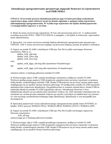 Aktualizacja oprogramowania sprzętowego (upgrade firmware’u) rejestratorów serii PDR-M30xx UWAGA: Przerwanie procesu aktualizacji podczas jego trwania powoduje uszkodzenie rejestratora (jego części software’owej) na skutek zapisania w pamięci stałej rejestratora niekompletnego oprogramowania. W wyniku tego rejestrator nie będzie działał poprawnie i wymagał będzie naprawy w serwisie. 1. Wejść do menu serwisowego rejestratora. W tym celu przytrzymać przez ok. 5 s jednocześnie wciśnięte przyciski STILL i SHUTTLE HOLD, a następnie, o ile będzie to konieczne, wprowadzić hasło administratora. 2. Sprawdzić, czy menu serwisowe posiada funkcję aktualizacji oprogramowania sprzętowego UPDATE. Jeśli w menu serwisowym znajduje się powyższa funkcja, przejść do punktu 6 instrukcji. 3. Nagrać na nośnik FLASH z interfejsem USB (np. Pen Drive) pliki zawierające firmware rejestratora. Pliki te, tj.: update_m3k_app.img update_m3k_linux.img update_m3k_bios.img oraz update_m3k_fpga_m8.img (dla rejestratora 8-kanałowego) lub update_m3k_fpga_m16.img (dla rejestratora 16-kanałowego) umieścić należy w katalogu głównym nośnika FLASH. 4. Wykorzystując złącze USB z panelu przedniego rejestratora, podłączyć nośnik FLASH. Wykrycie podłączonego poprzez USB urządzenia sygnalizowane jest przez rejestrator za pomocą białej ikonki, symbolizującej interfejs USB. Ikonka USB pojawia się po lewej stronie paska stanu, znajdującego się na spodzie ekranu monitora głównego. Po podłączeniu nośnika FLASH rejestrator automatycznie rozpocznie aktualizację. Zasygnalizowane to zostanie zmianą barwy ikonki USB na niebieską (dioda na nośniku FLASH sygnalizuje odczyt). Aktualizacja firmware’u trwa kilkadziesiąt sekund i po jej zakończeniu rejestrator wyłączy się. Jeśli rejestrator automatycznie nie uruchomi się, można po paru minutach włączyć go ręcznie i poczekać na załadowanie się systemu (w celu ręcznego uruchomienia kolejnego etapu aktualizacji; aktualizacja w tym przypadku jest dwuetapowa). 5. Sprawdzić poprawność wersji zaktualizowanego oprogramowania (punkt menu SYSTEM, zakładka INFO, pozycje WERSJA FPGA, WERSJA BIOS, WERSJA LINUX i WERSJA APP). 6. Nagrać na nośnik FLASH z interfejsem USB (np. Pen Drive) plik zawierający najnowszy firmware rejestratora: m3k_all.img umieszczając go w katalogu głównym nośnika. 7. Wykorzystując złącze USB z panelu przedniego rejestratora, podłączyć nośnik FLASH. Wykrycie podłączonego poprzez USB urządzenia sygnalizowane jest przez rejestrator za pomocą białej ikonki, symbolizującej interfejs USB. Ikonka USB pojawia się po lewej stronie paska stanu, znajdującego się na spodzie ekranu monitora głównego. 8. Wejść do menu serwisowego, wybrać funkcję UPDATE i zatwierdzić ją przyciskiem „+”, aby rozpocząć aktualizację Proces aktualizacji zasygnalizowany zostanie zmianą barwy ikonki USB na niebieską (dioda na nośniku FLASH sygnalizuje odczyt). Aktualizacja firmware’u trwa kilkadziesiąt sekund i po jej o zakończeniu rejestrator wyłączy się. Jeśli rejestrator automatycznie nie uruchomi się, po paru minutach można włączyć go ręcznie. 9. Sprawdzić poprawność wersji zaktualizowanego oprogramowania (punkt menu SYSTEM, zakładka INFO, pozycje WERSJA FPGA, WERSJA BIOS, WERSJA LINUX i WERSJA APP).
