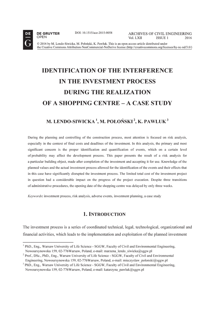 160 M. LENDO-SIWICKA, M. POOSKI, K. PAWLUK at a certain time and with limited financial resources (11). For the investment to be a success it is important to properly prepare the preliminary stages – with focus on the preparation of the construction works. The decisions made at these stages may affect the entire investment process both in substantive and financial terms. In this analysis, the complexity and sustainability of the investment were taken into account. A sequential link between the effects of decisions and actions, the development of work at all stages and the impact of the diversity of legal and technical aspects causes a series of random factors affecting the entire investment process. Throughout the successive steps of the investment process, events disturbing the planning works may occur; they depend on the function and location of the construction work and on the experience of different participants of the investment process, as well as many other factors. Early identification of these events, anticipation of the potential adverse effects and their inclusion in the planning works may effectively increase the scheme credibility of physical, temporal and financial schedules developed at different stages of the process (12, 13). The best way to identify these risk factors is an analysis of the execution on completed investments. Thus, specific conditions and adverse events, which have occurred during the planning and performing stages, should be considered. Keeping in mind that each of the works has an individual and unique nature, and a number of conditions for its implementation (4), and the results obtained are useful for future risk assessment of similar objects (8-10). In this paper, the planning and implementation of a large retail complex are presented. Moreover, identification of the main interferences of the planned work, their effects and methods applied in order to limit them were noted. 2. CHARACTERISTICS OF THE BUILDINGS The idea of a commercial shopping centre came into being in 2011. A project of four large-scale commercial buildings in the area of almost 11 hectares in the suburban part of one of the cities of the Masovian voivodship was intended to be implemented by the Developer in cooperation with target customers (2). This paper focuses on one of these buildings – a Sport Store. This is a singlestorey, slab-on-grade building with a maximum height of 9.50 m. The building has a rectangular shape with the external dimensions of 51.04 x 70.49 (m). The building comprises of: a Sport Store with a market hall and an exhibition area, a base – unloading zone, an office and a social space. The facility will be constructed on an area of 3097.10 square meters. In addition, it is predicted that 100 people will be employed in the Sport Store. The budget of the projected Sport Store is estimated at 7,360 thousand PLN. The investment is financed by private resources, thus the selection procedures IDENTIFICATION OF THE INTERFERENCE IN THE INVESTMENT PROCESS DURING... 161 of the designer and the contractor are made in the absence of the Public Procurement Act, which simplifies and reduces the decision-making process. The store building has a framework structure with a crosswise arrangement of the structural form at intervals of 15.15 m. The span of bays is 19.00 m. The truss of the main hall is a steel-framed construction with steel columns restrained in the foundations and a steel lattice truss, as well as a roof bracing in the roof plane and vertical bracings in the extreme and central spaces between the columns. The foundation walls of the commercial hall, and the administrative and social part to the height of 0.5 m, are made from a reinforced, concreted still plate, insulated (from the outside) and coated with mineral plaster. The ceilings above the technical and cash register spaces are made of ferro-concrete. The external walls are made using a layered structure technology – masonry, rigid with concrete or a steel frame. The internal walls are made in a reinforced concrete frame filled with silicate blocks on a cement-lime mortar, and thus the walls are adapted to the requirements of fire protection. Furthermore, in the building there are also plasterboard partitions on a metal stud framing. The roof is covered with a PVC roof membrane. The elevation of the building is made of metal facing. Moreover, the building is equipped with mechanical ventilation, air conditioning and heating installation, electricity, water supply, sanitary and storm sewers. The facility is fully accessible for people with disabilities. 3. INVESTMENT PROCESS 3.1. STAGES OF THE INVESTMENT PROCESS INCLUDED IN THE ANALYSIS All actions associated with the preparation and completion of the project could be improved by determining a logical sequence of the main partial products of the process, which arise from the moment of conceiving the investment idea to the final touch – the finished civil structure. The execution of the building project can be divided into the following four stages: Pre-design (conceptual stage), Tender design (tendering stage), Construction (implementation stage), As built (operation stage). In the literature there are also more detailed divisions of stages than those listed above (4, 11). In this analysis, the following stages of investment process are proposed: the stage of investment plans, in which analysis of investment profitability, land purchase, and basic parameters of the investment are conducted, 162 M. LENDO-SIWICKA, M. POOSKI, K. PAWLUK the stage of project assumptions on behalf of the Owner; in this stage the basic limits of the project are considered, the design process management stage; this process should be seen in close connection with the evolution of the investment costs, the pre-project planning stage; during this process the project documentation for the technologies and the organization process are established, the supply of materials is pre