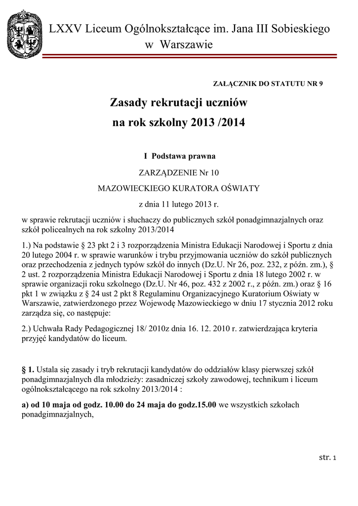 LXXV Liceum Ogólnokształcące im. Jana III Sobieskiego w Warszawie ZAŁĄCZNIK DO STATUTU NR 9 Zasady rekrutacji uczniów na rok szkolny 2013 /2014 I Podstawa prawna ZARZĄDZENIE Nr 10 MAZOWIECKIEGO KURATORA OŚWIATY z dnia 11 lutego 2013 r. w sprawie rekrutacji uczniów i słuchaczy do publicznych szkół ponadgimnazjalnych oraz szkół policealnych na rok szkolny 2013/2014 1.) Na podstawie § 23 pkt 2 i 3 rozporządzenia Ministra Edukacji Narodowej i Sportu z dnia 20 lutego 2004 r. w sprawie warunków i trybu przyjmowania uczniów do szkół publicznych oraz przechodzenia z jednych typów szkół do innych (Dz.U. Nr 26, poz. 232, z późn. zm.), § 2 ust. 2 rozporządzenia Ministra Edukacji Narodowej i Sportu z dnia 18 lutego 2002 r. w sprawie organizacji roku szkolnego (Dz.U. Nr 46, poz. 432 z 2002 r., z późn. zm.) oraz § 16 pkt 1 w związku z § 24 ust 2 pkt 8 Regulaminu Organizacyjnego Kuratorium Oświaty w Warszawie, zatwierdzonego przez Wojewodę Mazowieckiego w dniu 17 stycznia 2012 roku zarządza się, co następuje: 2.) Uchwała Rady Pedagogicznej 18/ 2010z dnia 16. 12. 2010 r. zatwierdzająca kryteria przyjęć kandydatów do liceum. § 1. Ustala się zasady i tryb rekrutacji kandydatów do oddziałów klasy pierwszej szkół ponadgimnazjalnych dla młodzieży: zasadniczej szkoły zawodowej, technikum i liceum ogólnokształcącego na rok szkolny 2013/2014 : a) od 10 maja od godz. 10.00 do 24 maja do godz.15.00 we wszystkich szkołach ponadgimnazjalnych, str. 1 LXXV Liceum Ogólnokształcące im. Jana III Sobieskiego w Warszawie b) od 21 czerwca od godz.10.00 do 25 czerwca do godz. 16.00 kandydaci mogą dokonywać zmiany wyboru szkół; c) 12 czerwca godz. 15.00 upływa ostateczny termin ogłoszenia wyników sprawdzianów uzdolnień kierunkowych przeprowadzonych w terminach podanych w § 1 pakt 2 lit. a, b, d) kandydaci, którzy z udokumentowanych przyczyn losowych nie przystąpili do sprawdzianu uzdolnień kierunkowych w wymienionych terminach lub dokonali w dniach 21 – 25 czerwca zmiany wyboru na szkołę z oddziałami, do których przeprowadza się sprawdzian uzdolnień kierunkowych, mogą do niego przystąpić 26 czerwca godz. 13.00, e) 27 czerwca godz. 15.00 upływa ostateczny termin ogłoszenia wyników sprawdzianu uzdolnień kierunkowych przeprowadzonych w terminach podanych w § 1 pkt 2 lit. d; 3) terminy rekrutacji kandydatów na rok szkolny 2013/2014 do oddziałów klasy pierwszej szkół ponadgimnazjalnych dla młodzieży: liceum ogólnokształcącego, zasadniczej szkoły zawodowej, technikum, a) od 28 czerwca od godz. 11.00 do 1 lipca do godz. 16.00 kandydaci składają do (nie więcej niż trzech) szkół kopie świadectwa ukończenia gimnazjum oraz kopie zaświadczenia o szczegółowych wynikach egzaminu przeprowadzanego w ostatnim roku nauki w gimnazjum, poświadczone za zgodność z oryginałem przez dyrektora gimnazjum, które kandydat ukończył. Na każdej stronie kopii należy umieścić adnotację: „Stwierdzam zgodność z oryginałem”, datę, pieczęć urzędową szkoły o średnicy 36 mm oraz pieczęć imienną dyrektora szkoły i podpis dyrektora lub upoważnionej przez niego osoby. Kandydaci składają dokumenty, o których mowa powyżej, w szkołach, w których mają złożone kwestionariusze – podania. W miastach, w których funkcjonuje elektroniczne wspomaganie rekrutacji, a kandydat wybrał trzy szkoły w jednym mieście, może złożyć jedną kopię świadectwa i zaświadczenia o szczegółowych wynikach egzaminu przeprowadzanego w ostatnim roku nauki w gimnazjum w szkole pierwszego wyboru, b) od 2 lipca godz. 9.00 do 4 lipca godz. 15.00 szkolne komisje rekrutacyjno kwalifikacyjne prowadzą postępowanie rekrutacyjne według przyjętych w szkole procedur, c) do 4 lipca do godz. 16.00 szkolne komisje rekrutacyjno-kwalifikacyjne ogłaszają listy kandydatów zakwalifikowanych do przyjęcia do oddziałów klasy pierwszej wraz z liczbą punktów i listy kandydatów niezakwalifikowanych do przyjęcia do oddziałów klasy pierwszej wraz z liczbą punktów, uwzględniając zasadę umieszczania kandydatów na listach w kolejności, zgodnie z liczbą uzyskanych punktów oraz kryteriami zawartymi w statucie szkoły, str. 2 LXXV Liceum Ogólnokształcące im. Jana III Sobieskiego w Warszawie d) 5 lipca od godz. 9.00 do 8 lipca do godz. 15.00 kandydaci umieszczeni na listach kandydatów zakwalifikowanych do przyjęcia składają oświadczenia potwierdzające wolę podjęcia nauki w danej szkole oraz oryginał świadectwa i oryginał zaświadczenia o szczegółowych wynikach egzaminu przeprowadzanego w ostatnim roku nauki w gimnazjum. Kandydaci otrzymują ze szkoły prowadzącej kształcenie zawodowe skierowanie na badanie do lekarza medycyny pracy, który wydaje zaświadczenie lekarskie o braku przeciwwskazań zdrowotnych do kształcenia w określonym zawodzie (zaświadczenie należy złożyć do 26 sierpnia w sekretariacie szkoły), e) 8 lipca do godz. 16.00 szkolne komisje rekrutacyjno-kwalifikacyjne ogłaszają listy kandydatów przyjętych do szkoły wraz z liczbą punktów, którzy potwierdzili wolę uczęszczania do wybranej szkoły, uwzględniając zasadę umieszczania nazwisk na liście w kolejności, zgodnie z liczbą uzyskanych punktów oraz kryteriami zawartymi w statucie szkoły, a także informację o liczbie wolnych miejsc, f) od 9 lipca do 11 lipca szkolne komisje rekrutacyjno-kwalifikacyjne przeprowadzają rekrutację uzupełniającą do szkół, które nie dokonały pełnego naboru, g) 9 lipca od godz. 9.00 do 15.00 kandydaci składają do (nie więcej niż trzech) szkół kopie świadectwa ukończenia gimnazjum oraz kopie zaświadczenia o szczegółowych wynikach egzaminu przeprowadzanego w ostatnim roku nauki w gimnazjum, poświadczone za zgodność z oryginałem przez dyrektora gimnazjum, które kandydat ukończył, h) 10 lipca szkolne komisje rekrutacyjno - kwalifikacyjne prowadzą postępowanie rekrutacyjne według przyjęt