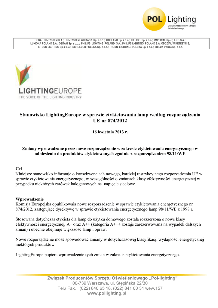 BEGA; ES-SYSTEM S.A.; ES-SYSTEM WILKASY Sp. z o.o.; GOLLAND Sp. z o.o.; HELIOS Sp. z o.o.; IMPERIAL Sp.J.; LUG S.A.; LUXIONA POLAND S.A.; OSRAM Sp. z o.o.; PHILIPS LIGHTING POLAND S.A.; PHILIPS LIGHTING POLAND S.A. ODDZIAŁ W KĘTRZYNIE; SITECO LIGHTING Sp. z o.o.; SCHREDER POLSKA Sp. z o.o.; THORN LIGHTING POLSKA Sp. z o.o.; TRILUX Polska Sp. z o.o. Stanowisko LightingEurope w sprawie etykietowania lamp według rozporządzenia UE nr 874/2012 16 kwietnia 2013 r. Zmiany wprowadzane przez nowe rozporządzenie w zakresie etykietowania energetycznego w odniesieniu do produktów etykietowanych zgodnie z rozporządzeniem 98/11/WE Cel Niniejsze stanowisko informuje o konsekwencjach nowego, bardziej restrykcyjnego rozporządzenia UE w sprawie etykietowania energetycznego, w szczególności o zmianach klasy efektywności energetycznej w przypadku niektórych żarówek halogenowych na napięcie sieciowe. Wprowadzenie Komisja Europejska opublikowała nowe rozporządzenie w sprawie etykietowania energetycznego nr 874/2012, zastępujące dyrektywę w sprawie etykietowania energetycznego lamp 98/11/WE z 1998 r. Stosowana dotychczas etykieta dla lamp do użytku domowego została rozszerzona o nowe klasy efektywności energetycznej, A+ oraz A++ (kategoria A+++ zostaje zarezerwowana na wypadek dalszych zmian) i obecnie obejmuje większość lamp i opraw. Nowe rozporządzenie może spowodować zmiany w dotychczasowej klasyfikacji wydajności energetycznej niektórych produktów. LightingEurope popiera wprowadzenie tych zmian w zakresie etykietowania energetycznego. Związek Producentów Sprzętu Oświetleniowego „Pol-lighting” 00-739 Warszawa, ul. Stępińska 22/30 Tel./ Fax. (022) 840 65 18, (022) 841 00 31 wew.157 www.pollighting.pl W dotychczasowym rozporządzeniu dotyczącym etykietowania energetycznego wskaźnik efektywności energetycznej jest obliczany na podstawie znamionowego strumienia świetlnego oraz znamionowej mocy wejściowej, zgodnie z definicją podaną w normach międzynarodowych. Rozporządzenie nr 874/2012 wprowadza nowe kryteria ewaluacji sprzętu oświetleniowego oraz zmiany w dotychczasowych procedurach weryfikacji przyjętych dla celów nadzoru rynkowego. Ze względu na powyższe zmiany niektóre produkty oświetleniowe, których parametry znajdują się blisko dolnej granicy klasy efektywności energetycznej (według dyrektywy 98/11/WE), będą musiały zostać ponownie sklasyfikowane bądź unowocześnione, by spełnić nowe wymogi dotyczące etykietowania energetycznego, zawarte w rozporządzeniu 874/2012. Konsekwencje dla lamp Szczegółowa analiza technologii oraz produktów dostarczanych na rynek przez członków Lighting Europe wskazuje, że nowe rozporządzenie może spowodować przesunięcie niektórych lamp do niższej klasy energetycznej. Na dzień dzisiejszy spodziewamy się takich zmian w odniesieniu do niektórych rodzajów kompaktowych lamp fluorescencyjnych oraz niskoprężnych lamp wyładowczych. Dotyczy to jednak w szczególności żarówek halogenowych na napięcie sieciowe: Bezkierunkowe żarówki halogenowe na napięcie sieciowe znajdują się na tyle blisko dolnej granicy klasy efektywności energetycznej C, iż zgodnie z wymogami nowego rozporządzenia większość z nich zostanie umieszczona w klasie D. Najbardziej powszechne bezkierunkowe żarówki halogenowe na napięcie sieciowe to E14, E27, B15d, B22d (zastępujące żarówki tradycyjne), G7 oraz R7s. W Wswojej swojejobecnej obecnejpostaci, postaci,bezkierunkowe bezkierunkoweżarówki żarówkihalogenowe halogenowena nanapięcie napięciesieciowe: sieciowe:E14, E14,E27, E27,B15d, B15d, B22d, B22d, G9 G9 oraz oraz część część żarówek żarówek R7s R7s do do użytku użytku domowego, domowego, które które są są wyposażone wyposażone ww nową nową etykietę etykietę energetyczną, energetyczną, mogą mogą zostać zostać uznane uznane za za niezgodne niezgodne zz wymogami wymogami jeśli jeśli zostaną zostaną przyporządkowane przyporządkowane do do klasy klasyC. C. Niniejsze stanowisko nie wyklucza możliwości wprowadzenia do obrotu żarówek halogenowych na napięcie sieciowe o klasie efektywności energetycznej wyższej niż D, jeśli tylko będą one spełniały wymogi określone dla tych klas. Jednakże członkowie Lighting Europe nie widzą możliwości usprawnienia tych lamp tak, by spełniały wymogi klasy C, bez zmiany innych parametrów, takich jak trwałość i strumień świetlny. Dlatego zalecane jest, by ich producenci oraz instytucje nadzoru rynkowego i instytucje celne poddawały te żarówki testom zgodnie z wymogami nowego rozporządzenia, a także zwracały szczególną uwagę na obecne na rynku lampy, które posiadają klasę C i są oznakowane nową etykietą energetyczną (czyli taką etykietą, która posiada zakres klas efektywności energetycznej od A++ do E). Dotyczy to większości lamp wprowadzanych do obrotu od 1. września 2013 r. Zgodność z regulacjami dotyczącymi ekoprojektu O dopuszczeniu lamp na rynek europejski zgodnie z wymogami ekoprojektu określonymi w rozporządzeniu 244/20012 nie decyduje zadeklarowana ani faktyczna klasa efektywności energetycznej, a spełnienie zawartych w tym rozporządzeniu wymogów dotyczących zużycia energii, parametrów funkcjonalnych oraz umieszczania informacji na opakowaniu. Bezkierunkowe żarówki halogenowe na napięcie sieciowe przesunięte do klasy D, mogą nadal pozostawać na rynku w zgodności z rozporządzeniem 244/2009 dotyczącym ekoprojektu. Związek Producentów Sprzętu Oświetleniowego „Pol-lighting” 00-739 Warszawa, ul. Stępińska 22/30 Tel./Fax.: (022) 840 65 18, (022) 841 00 31 wew. 157 www.pollighting.pl Podsumowanie 1. Członkowie Lighting Europe, w oparciu o powszechne rozumienie oraz interpretację prawną, uznają, że od dnia 1. września 2013 r. bezkierunkowe żarówki halogenowe na napięcie sieciowe E14, E27, B15d, B22d, G9 oraz część R7s, produkowane przez członków Lighti