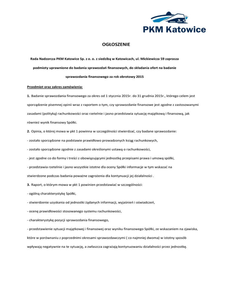 PKM Katowice OGŁOSZENIE Rada Nadzorcza PKM Katowice Sp. z o. o. z siedzibą w Katowicach, ul. Mickiewicza 59 zaprasza podmioty uprawnione do badania sprawozdań finansowych, do składania ofert na badanie sprawozdania finansowego za rok obrotowy 2015 Przedmiot oraz zakres zamówienia: 1. Badanie sprawozdania finansowego za okres od 1 stycznia 2015r. do 31 grudnia 2015r., którego celem jest sporządzenie pisemnej opinii wraz z raportem o tym, czy sprawozdanie finansowe jest zgodne z zastosowanymi zasadami (polityką) rachunkowości oraz rzetelnie i jasno przedstawia sytuację majątkową i finansową, jak również wynik finansowy Spółki. 2. Opinia, o której mowa w pkt 1 powinna w szczególności stwierdzać, czy badane sprawozdanie: - zostało sporządzone na podstawie prawidłowo prowadzonych ksiąg rachunkowych, - zostało sporządzone zgodnie z zasadami określonymi ustawą o rachunkowości, - jest zgodne co do formy i treści z obowiązującymi jednostkę przepisami prawa i umową spółki, - przedstawia rzetelnie i jasno wszystkie istotne dla oceny Spółki informacje w tym wskazać na stwierdzone podczas badania poważne zagrożenia dla kontynuacji jej działalności . 3. Raport, o którym mowa w pkt 1 powinien przedstawiać w szczególności: - ogólną charakterystykę Spółki, - stwierdzenie uzyskania od jednostki żądanych informacji, wyjaśnień i oświadczeń, - ocenę prawidłowości stosowanego systemu rachunkowości, - charakterystykę pozycji sprawozdania finansowego, - przedstawienie sytuacji majątkowej i finansowej oraz wyniku finansowego Spółki, ze wskazaniem na zjawiska, które w porównaniu z poprzednimi okresami sprawozdawczymi ( co najmniej dwoma) w istotny sposób wpływają negatywnie na te sytuację, a zwłaszcza zagrażają kontynuowaniu działalności przez jednostkę. 4. Sprawozdanie finansowe będące przedmiotem zamówienia dotyczy sprawozdania PKM Katowice Sp. z o. o. za okres od 1 stycznia 2015r. do 31 grudnia 2015r., obejmującego następujące pozycje: - bilans sporządzony na dzień 31.12.2015r., - rachunek zysków i strat (wariant porównawczy) sporządzony za okres 01.01.2015 do 31.12.2015 r., - zestawienie zmian w kapitale własnym sporządzone na dzień 31.12.2015r., - rachunek przepływów pieniężnych (metoda pośrednia) sporządzony na dzień 31.12.2015r., Biegły rewident zobowiązany jest do: 1. Przeprowadzenia badania Sprawozdania Finansowego w siedzibie Spółki. 2. Zachowania bezstronności i niezależności, o których mowa w przepisach art. 56 ust. 3 i 4 ustawy z dnia 7 maja 2009r. o biegłych rewidentach i ich samorządzie, podmiotach uprawnionych do badania sprawozdań finansowych oraz o nadzorze publicznym (Dz. U. Nr 77 z 2009r., poz. 649) 3. Przeprowadzenia badania stosownie do obowiązujących w Polsce przepisów prawa oraz polskich norm wykonywania zawodu biegłego rewidenta w taki sposób, aby uzyskać racjonalną, wystarczającą podstawę do stwierdzenia czy Sprawozdanie Finansowe nie zawiera istotnych nieprawidłowości. 4. Badanie będzie obejmować sprawdzenie w dużej mierze metodą wyrywkową - dokumentacji, z której wynikają kwoty i informacje zawarte w Sprawozdaniu Finansowym, poprawność zastosowanych przez Spółkę zasad rachunkowości i znaczących szacunków, jak i ogólnej prezentacji Sprawozdania Finansowego. 5. Przeprowadzenia badania metodą pełną następujących obszarów: - pozostałych kosztów i przychodów operacyjnych, - kosztów i przychodów finansowych, - zysków i strat nadzwyczajne, - rezerw i odpisów aktualizacyjnych. - wszystkich rozliczeń podatkowych. Bliższych informacji o ilości dokumentów, które mają być zbadane metodą pełną udziela Główna Księgowa Spółki tel: 32 493 10 43 5. Przekazywania do wiadomości Rady Nadzorczej sporządzanych dla Zarządu Spółki w formie tzw. listów intencyjnych informacji o ewentualnych problemach w systemie rachunkowości Spółki. 6. Udziału w posiedzeniach Rady Nadzorczej poświęconych rozpatrzeniu Sprawozdania Finansowego za 2015r. oraz obecności na Zwyczajnym Walnym Zgromadzeniu Spółki, zatwierdzającym Sprawozdanie Finansowe za 2015 rok w celu złożenia stosownych wyjaśnień i informacji odnośnie przeprowadzonego badania. Oferta biegłego rewidenta powinna zawierać: 1. Informację o oferencie, w tym o formie prowadzenia działalności, o wpisie do rejestru biegłych rewidentów, wpisie na listę podmiotów uprawnionych do zbadania sprawozdań finansowych, informację o liczbie zatrudnionych biegłych rewidentów; 2.Aktualny odpis z rejestru sądowego i NIP; 3. Sprawozdania finansowe sporządzone na 31 grudnia 2013r. i 31 grudnia 2014r. wraz z opinią biegłego rewidenta jeżeli podlegały one badaniu zgodnie z przepisami o rachunkowości, a w przypadku wykonawców nie zobowiązanych do sporządzania sprawozdania finansowego inny dokument określający wielkość posiadanych kapitałów własnych 4. Oświadczenie o spełnianiu przez biegłego rewidenta ustawowo określonych warunków do wyrażenia bezstronnej i niezależnej opinii o badanym sprawozdaniu finansowym; 5. Cenę netto w złotych za przeprowadzenie badania, sporządzenie pisemnej opinii o badanym Sprawozdaniu Finansowym wraz z raportem z badania tego sprawozdania uwzględniając wszystkie koszty jakie musi ponieść oferent; 6. Określenie składu zespołu przeprowadzającego badanie, z uwzględnieniem osób posiadających wiedzę i doświadczenie w zakresie działalności Przedsiębiorstw Komunikacji Publicznej; 7. Wskazanie metody i harmonogramu prac nad badaniem sprawozdania finansowego i czas jego trwania; 8. Projekt umowy z uwzględnieniem warunków zawartych w ogłoszeniu; 9. Wykaz badanych podmiotów w okresie ostatnich 3 lat wraz z referencjami, w tym przedsiębiorstw z branży komunikacyjnej. 10. Informacja o sumie ubezpieczenia od ryzyka zawodowego. Preferencje oceny ofert: 1. Cena. 2. Doświadczenie w badaniu sprawozdań finansowych jednostkowych i sk