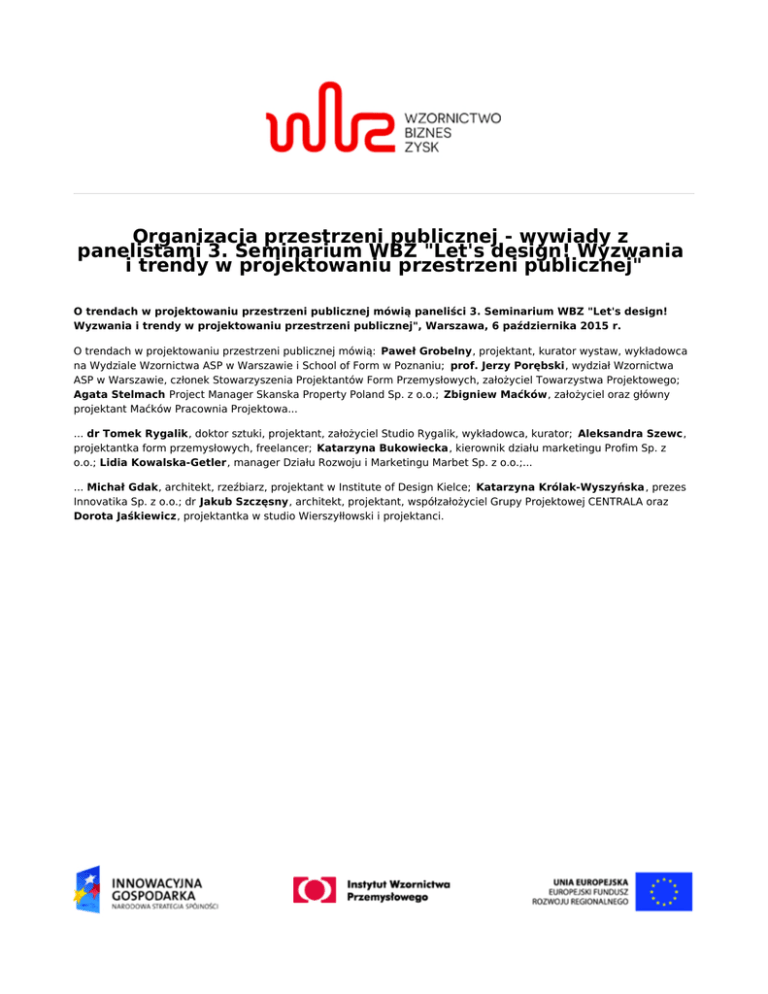 Organizacja przestrzeni publicznej - wywiady z panelistami 3. Seminarium WBZ "Let's design! Wyzwania i trendy w projektowaniu przestrzeni publicznej" O trendach w projektowaniu przestrzeni publicznej mówią paneliści 3. Seminarium WBZ "Let's design! Wyzwania i trendy w projektowaniu przestrzeni publicznej", Warszawa, 6 października 2015 r. O trendach w projektowaniu przestrzeni publicznej mówią: Paweł Grobelny, projektant, kurator wystaw, wykładowca na Wydziale Wzornictwa ASP w Warszawie i School of Form w Poznaniu; prof. Jerzy Porębski, wydział Wzornictwa ASP w Warszawie, członek Stowarzyszenia Projektantów Form Przemysłowych, założyciel Towarzystwa Projektowego; Agata Stelmach Project Manager Skanska Property Poland Sp. z o.o.; Zbigniew Maćków, założyciel oraz główny projektant Maćków Pracownia Projektowa... ... dr Tomek Rygalik, doktor sztuki, projektant, założyciel Studio Rygalik, wykładowca, kurator; Aleksandra Szewc, projektantka form przemysłowych, freelancer; Katarzyna Bukowiecka, kierownik działu marketingu Profim Sp. z o.o.; Lidia Kowalska-Getler, manager Działu Rozwoju i Marketingu Marbet Sp. z o.o.;... ... Michał Gdak, architekt, rzeźbiarz, projektant w Institute of Design Kielce; Katarzyna Królak-Wyszyńska, prezes Innovatika Sp. z o.o.; dr Jakub Szczęsny, architekt, projektant, współzałożyciel Grupy Projektowej CENTRALA oraz Dorota Jaśkiewicz, projektantka w studio Wierszyłłowski i projektanci.