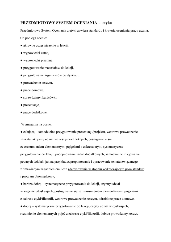 PRZEDMIOTOWY SYSTEM OCENIANIA - etyka Przedmiotowy System Oceniania z etyki zawiera standardy i kryteria oceniania pracy ucznia. Co podlega ocenie: ● aktywne uczestniczenie w lekcji, ● wypowiedzi ustne, ● wypowiedzi pisemne, ● przygotowanie materiałów do lekcji, ● przygotowanie argumentów do dyskusji, ● prowadzenie zeszytu, ● prace domowe, ● sprawdziany, kartkówki, ● prezentacje, ● prace dodatkowe. Wymagania na ocenę: ● celującą – samodzielne przygotowanie prezentacji/projektu, wzorowe prowadzenie zeszytu, aktywny udział we wszystkich lekcjach, posługiwanie się ze zrozumieniem elementarnymi pojęciami z zakresu etyki, systematyczne przygotowanie do lekcji, podejmowanie zadań dodatkowych, samodzielne inicjowanie pewnych działań, jak na przykład zaproponowanie i opracowanie tematu związanego z omawianym zagadnieniem, lecz zdecydowanie w stopniu wykraczającym poza standard i program obowiązkowy, ● bardzo dobrą – systematyczne przygotowanie do lekcji, czynny udział w zajęciach/dyskusjach, posługiwanie się ze zrozumieniem elementarnymi pojęciami z zakresu etyki/filozofii, wzorowe prowadzenie zeszytu, odrobione prace domowe, ● dobrą – systematyczne przygotowanie do lekcji, częsty udział w dyskusjach, rozumienie elementarnych pojęć z zakresu etyki/filozofii, dobrze prowadzony zeszyt, odrobione prace domowe, ● dostateczną – rozumienie omawianych zagadnień, sporadyczny udział w dyskusjach, prowadzenie zeszytu, ● dopuszczającą – bierny udział w lekcjach, prowadzenie zeszytu, ● niedostateczną – niespełnienie powyższych warunków. Poza ocenami w skali 1 – 6 stosowane są również „plusy”, głównie za aktywność na lekcji i niektóre prace domowe, oraz „minusy” za nieprzygotowanie do lekcji, brak pracy domowej lub niepodjęcie działań obowiązkowych poleconych przez nauczyciela (trzy „plusy” stanowią ocenę bardzo dobrą, zaś trzy „minusy” - ocenę niedostateczną). Całościowo lub w formie plusów (minusów) oceniane są prace domowe, wypowiedzi pisemne, aktywność na lekcji. Sprawdziany przewidziane są w formie pytań otwartych oraz testowych. Sprawdziany i kartkówki muszą być zapowiedziane z tygodniowym wyprzedzeniem. Nauczyciel oddaje sprawdzone prace pisemne w terminie nie przekraczającym dwóch tygodni. Uczeń jest zobowiązany do prowadzenia zeszytu. Uczeń może poprawić każdą ocenę – zalicza kartkówki, sprawdziany, zadania domowe i in. prace ponownie w ustalonym z nauczycielem terminie.