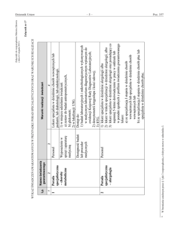 W brzmieniu ustalonym przez § 1 pkt 3 rozporządzenia, o którym mowa w odnośniku 3. Personel Lekarz specjalista w dziedzinie chorób wewnętrznych lub pediatrii, lub diabetologii, lub endokrynologii. 1) w miejscu udzielania świadczeń: a) zestaw do badań antropometrycznych, b) glukometr; 2) w lokalizacji: USG. Dostęp do: 1) badań laboratoryjnych i mikrobiologicznych wykonywanych w medycznym laboratorium diagnostycznym wpisanym do ewidencji Krajowej Rady Diagnostów Laboratoryjnych; 2) densytometrii kręgosłupa i kości udowej; 3) RTG. 1) lekarz specjalista w dziedzinie alergologii albo 2) lekarz w trakcie specjalizacji w dziedzinie alergologii, albo 3) lekarz specjalista w dziedzinie alergologii oraz posiadający co najmniej 5-letnie doświadczenie w pracy w oddziale lub w poradni zgodnych z profilem świadczenia gwarantowanego lekarz: a) ze specjalizacją I stopnia w dziedzinie chorób wewnętrznych lub specjalista w dziedzinie chorób wewnętrznych lub b) ze specjalizacją I stopnia w dziedzinie chorób płuc lub specjalista w dziedzinie chorób płuc. 4 – 5 – 8) Porada specjalistyczna – alergologia Dostępność badań lub procedur medycznych Wyposażenie w sprzęt i aparaturę medyczną Personel 3 Warunki realizacji świadczeń Dziennik Ustaw 2 Porada specjalistyczna – choroby metaboliczne 2 1 1 Nazwa świadczenia gwarantowanego Lp. LIZAC ŚWIADCZEŃ I WYKAZ GWARANTOWANYCH W PRZYPADKU PORAD SPECJALISTYCZNYCH ORAZ WARUNKI ICH REALIZACJI Załącznik nr 18) Załączniki do rozporządzenia Ministra Zdrowia enia Zd z dnia 6Ministra l stopada 2013 r Poz. 357 3 Porada specjalistyczna – alergologia dla dzieci Dostępność badań lub procedur medycznych W miejscu udzielania świadczeń: 1) zestaw do testów punktowych (co najmniej 10 alergenów); 2) zestaw do testów płatkowych (co najmniej 10 alergenów); 3) spirometr; 4) pickflometr. Dostęp do: 1) badań laboratoryjnych i mikrobiologicznych wykonywanych w medycznym laboratorium diagnostycznym wpisanym do ewidencji Krajowej Rady Diagnostów Laboratoryjnych; 2) USG; 3) RTG. 1) lekarz specjalista w dziedzinie alergologii albo 2) lekarz specjalista w dziedzinie pediatrii w trakcie specjalizacji w dziedzinie alergologii, albo 3) lekarz specjalista w dziedzinie alergologii oraz posiadający co najmniej 5-letnie doświadczenie w pracy w oddziale lub w poradni zgodnych z profilem świadczenia gwarantowanego lekarz: a) ze specjalizacją I stopnia w dziedzinie pediatrii lub specjalista w dziedzinie pediatrii lub b) ze specjalizacją I stopnia w dziedzinie chorób płuc, lub specjalista w dziedzinie chorób płuc. W miejscu udzielania świadczeń: 1) zestaw do testów punktowych (co najmniej 10 alergenów); 2) zestaw do testów płatkowych (co najmniej 10 alergenów); 3) spirometr; 4) pickflometr. Dostęp do: 1) badań laboratoryjnych i mikrobiologicznych wykonywanych w medycznym laboratorium diagnostycznym wpisanym do ewidencji Krajowej Rady Diagnostów Laboratoryjnych; 2) USG; 3) RTG. Dziennik Ustaw Wyposażenie w sprzęt i aparaturę medyczną Personel Dostępność badań lub procedur medycznych Wyposażenie w sprzęt i aparaturę medyczną – 6 – Poz. 357 Porada specjalistyczna – diabetologia Porada specjalistyczna – diabetologia dla dzieci 4 5 1) lekarz specjalista w dziedzinie diabetologii lub endokrynologii albo 2) lekarz w trakcie specjalizacji w dziedzinie diabetologii, albo 3) lekarz ze specjalizacją I stopnia w dziedzinie chorób wewnętrznych lub specjalista w dziedzinie chorób wewnętrznych z co najmniej 5-letnim doświadczeniem w pracy w oddziale lub w poradni zgodnych z profilem świadczenia gwarantowanego. W miejscu udzielania świadczeń: 1) glukometr; 2) przyrząd do badania czucia bólu – neurotips; 3) przyrząd do badania czucia temperatury skóry (thim term); 4) widełki stroikowe 128 Hz; 5) monofilament 5.07/10 g. Dostęp do: 1) badań laboratoryjnych i mikrobiologicznych wykonywanych w medycznym laboratorium diagnostycznym wpisanym do ewidencji Krajowej Rady Diagnostów Laboratoryjnych; 2) USG z opcją Dopplera; 3) oftalmoskopii. 1) lekarz specjalista w dziedzinie diabetologii albo 2) lekarz specjalista w dziedzinie endokrynologii i diabetologii dziecięcej, albo 3) lekarz specjalista w dziedzinie pediatrii w trakcie specjalizacji w dziedzinie diabetologii lub lekarz specjalista w dziedzinie pediatrii w trakcie specjalizacji w dziedzinie endokrynologii i diabetologii dziecięcej, albo 4) lekarz ze specjalizacją I stopnia w dziedzinie pediatrii lub specjalista w dziedzinie pediatrii z co najmniej 5-letnim doświadczeniem w pracy w oddziale lub w poradni zgodnych z profilem świadczenia gwarantowanego, albo 5) lekarz specjalista w dziedzinie endokrynologii z co najmniej 5-letnim doświadczeniem w pracy w podmiocie leczniczym wykonującym świadczenia zdrowotne w dziedzinie pediatrii. Dziennik Ustaw Personel Dostępność badań lub procedur medycznych Wyposażenie w sprzęt i aparaturę medyczną Personel – 7 – Poz. 357 6 Porada specjalistyczna – endokrynologia W miejscu udzielania świadczeń: 1) glukometr; 2) przyrząd do badania czucia bólu – neurotips; 3) przyrząd do badania czucia temperatury skóry (thim term); 4) widełki stroikowe 128 Hz; 5) monofilament 5.07/10 g. Dostęp do: 1) badań laboratoryjnych i mikrobiologicznych wykonywanych w medycznym laboratorium diagnostycznym wpisanym do ewidencji Krajowej Rady Diagnostów Laboratoryjnych; 2) USG z opcją Dopplera; 3) oftalmoskopii. 1) lekarz specjalista w dziedzinie endokrynologii albo 2) lekarz specjalista w dziedzinie endokrynologii ginekologicznej i rozrodczości, albo 3) lekarz w trakcie specjalizacji w dziedzinie endokrynologii, albo 4) lekarz w trakcie specjalizacji w dziedzinie endokrynologii ginekologicznej i rozrodczości, albo 5) lekarz specjalista w dziedzinie endokrynologii oraz posiadający co najmniej 5-letnie doświadczenie w pracy w oddziale lub w poradni zgodnych z profilem świadczenia gwarantowanego lekarz: a) 