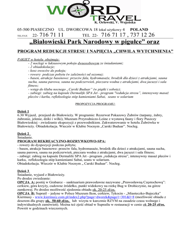 K. Orłowski, V. Wojeńska 05-500 PIASECZNO UL. DWORCOWA 18 lokal użytkowy 4 TEL/FAX 22- 716 71 11 TEL 22- 716 71 17 POLAND , 737 12 26 „Białowieski Park Narodowy w pigułce” oraz PROGRAM REDUKCJI STRESU I NAPIĘCIA „CHWILA WYTCHNIENIA” PAKIET w hotelu obejmuje: - 2 noclegi w luksusowym pokoju dwuosobowym ze śniadaniami; - 2 obiadokolacje; - kosz owoców do pokoju; - rowery podczas pobytu (w zależności od sezonu); - basen, atrakcje basenowe: przeciw fala, hydromasaże, brodzik dla dzieci z atrakcjami, sauna sucha, sauna parowa, sauna na podczerwień, pieczara wodna z atrakcjami, dwa jacuzzi i sala fitness; - wstęp do klubu nocnego „Carski Buduar” (w piątki i soboty); - zabiegi: zabieg na kapsule Dermalife SPA Jet - program "redukcja stresu”, intensywny masaż pleców i karku, refleksologia stóp kamieniami Sabai, seans w solarium PROPOZYCJA PROGRAMU: Dzień 1 6.30 Wyjazd, przejazd do Białowieży. W programie: Rezerwat Pokazowy Żubrów (tarpany, żubry, żubronie, jelenie, dziki i wilki), Muzeum Przyrodniczo-Leśne z wystawą fauny i flory Puszczy Białowieskiej - zwiedzanie ekspozycji z przewodnikiem. Zakwaterowanie w hotelu Żubrówka w Białowieży. Obiadokolacja. Wieczór w Klubie Nocnym „Carski Buduar”. Nocleg. Dzień 2 Śniadanie. PROGRAM REKREACYJNO-ROZRYWKOWO-SPA: - rowery do dyspozycji podczas pobytu; - basen, atrakcje basenowe: przeciw fala, hydromasaże, brodzik dla dzieci z atrakcjami, sauna sucha, sauna parowa, sauna na podczerwień, pieczara wodna z atrakcjami, dwa jacuzzi i sala fitness; - zabiegi: zabieg na kapsule Dermalife SPA Jet - program „redukcja stresu”, intensywny masaż pleców i karku, refleksologia stóp kamieniami Sabai, seans w solarium. Obiadokolacja. Wieczór w Klubie Nocnym „ Carski Buduar”. Nocleg. Dzień 3 Śniadanie, wyjazd z Białowieży. Po drodze zwiedzanie: OPCJA A: postój w Grabarce – sanktuarium prawosławne nazywane „Prawosławną Częstochową”: cerkiew, góra krzyży, cudowne źródełko, punkt widokowy na rzekę Bug w Drohiczynie, na górze zamkowej. Po drodze możliwość zjedzenia obiadu ok. 20-25 zł/os. OPCJA B: Supraśl – jedyne w Polsce Muzeum Ikon, cerkiew, Tykocin - „Miasteczko-Bajeczka” Kiermusy - www.kiermusy.com.pl/index2.php?page=dworek&page1=301&l=8 (możliwość obiadu z deserem dla grupy ok. 50-60 zł/os. lub wizyta w karczmie RZYM na zasadzie czasu wolnego i indywidualnych zamówień). Można też zjeść obiad w Supraślu w restauracji w cenie ok 20-25 zł/os. Powrót w godzinach wieczornych. Świadczenia: - transport lux autokarem marki Mercedes, Volvo, Scania, z WC, DVD, barkiem, uchylnymi siedzeniami; - realizacja programu turystycznego; - pakiet SPA w Hotelu Żubrówka; - opieka pilota; - ubezpieczenie NW; - VAT; Cena: 900 zł/min. 40 os. + DODATKOWO BILETY WSTĘPU, przewodnicy miejscowi w zależności od punktów programu, którymi grupa jest zainteresowana - od 30 do 50 zł/os.
