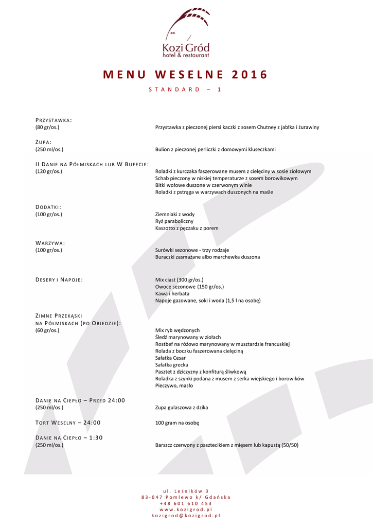 MENU WESELNE 2016 S T A N D A R D – 1 PRZYSTAWKA: (80 gr/os.) Przystawka z pieczonej piersi kaczki z sosem Chutney z jabłka i żurawiny ZUPA: (250 ml/os.) Bulion z pieczonej perliczki z domowymi kluseczkami II D A N I E N A P Ó Ł M I S K A C H L U B W B U F E C I E : (120 gr/os.) Roladki z kurczaka faszerowane musem z cielęciny w sosie ziołowym Schab pieczony w niskiej temperaturze z sosem borowikowym Bitki wołowe duszone w czerwonym winie Roladki z pstrąga w warzywach duszonych na maśle DODATKI: (100 gr/os.) Ziemniaki z wody Ryż paraboliczny Kaszotto z pęczaku z porem WARZYWA: (100 gr/os.) Surówki sezonowe - trzy rodzaje Buraczki zasmażane albo marchewka duszona DESERY I NAPOJE: Mix ciast (300 gr/os.) Owoce sezonowe (150 gr/os.) Kawa i herbata Napoje gazowane, soki i woda (1,5 l na osobę) ZIMNE PRZEKĄSKI N A P Ó Ł M I S K A C H ( P O O B I E D Z I E ): (60 gr/os.) Mix ryb wędzonych Śledź marynowany w ziołach Rostbef na różowo marynowany w musztardzie francuskiej Rolada z boczku faszerowana cielęciną Sałatka Cesar Sałatka grecka Pasztet z dziczyzny z konfiturą śliwkową Roladka z szynki podana z musem z serka wiejskiego i borowików Pieczywo, masło D A N I E N A C I E P Ł O – P R Z E D 2 4: 00 (250 ml/os.) Zupa gulaszowa z dzika T O R T W E S E L N Y – 2 4: 0 0 100 gram na osobę D A N I E N A C I E P Ł O – 1 :3 0 (250 ml/os.) Barszcz czerwony z pasztecikiem z mięsem lub kapustą (50/50) ul. Leśników 3 83-047 Pomlewo k/ Gdańska +48 601 610 453 www.kozigrod.pl [email protected] MENU WESELNE 2016 S T A N D A R D - 2 PRZYSTAWKA: (80 gr/os.) Przystawka z pieczonego filetu z pstrąga podanego na zimno z sałatami i sosem z pomarańczy ZUPA: (250 ml/os.) Krem z pieczonych ziemniaków i topinamburu z kawałkami boczku II D A N I E N A P Ó Ł M I S K A C H L U B W B U F E C I E : (120 gr/os.) Zrazy wołowe w sosie własnym z rozmarynem Duszona łopatka wieprzowa z grzybami Pieczony filet z indyka w sosie paprykowym Kawałki pieczonego filetu z łososia podane z klarowanym masłem DODATKI: (100 gr/os.) Ziemniaki z koperkiem Kasza gryczana z cebulą, czosnkiem i majerankiem Ryż paraboliczny WARZYWA: (100 gr/os.) Surówki sezonowe - trzy rodzaje Duszona marchewka na miodzie albo buraczki na ciepło DESERY I NAPOJE: Mix ciast (300 gr/os.) Owoce sezonowe (150 gr/os.) Kawa i herbata Napoje gazowane, soki i woda (1,5 l na osobę) ZIMNE PRZEKĄSKI N A P Ó Ł M I S K A C H ( P O O B I E D Z I E ): (60 gr/os.) Kawałki dorsza w galaretce agrestowej Terina z indyka z bakaliami Śledź po kaszubsku Pasztet z dziczyzny w cieście francuskim Kompozycja sałat i wędzonego pstrąga z sosem koperkowym Tradycyjna sałatka jarzynowa Mix mięs pieczonych z sosami na zimno Sałatka z pieczoną polędwiczką wieprzową Pieczywo, masło D A N I E N A C I E P Ł O – P R Z E D 2 4: 00 (250 ml/os.) Bogracz węgierski T O R T W E S E L N Y – 2 4: 0 0 100 gram na osobę D A N I E N A C I E P Ł O – 1 :3 0 (250 ml/os.) Żurek na gęsinie z jajkiem ul. Leśników 3 83-047 Pomlewo k/ Gdańska +48 601 610 453 www.kozigrod.pl [email protected]