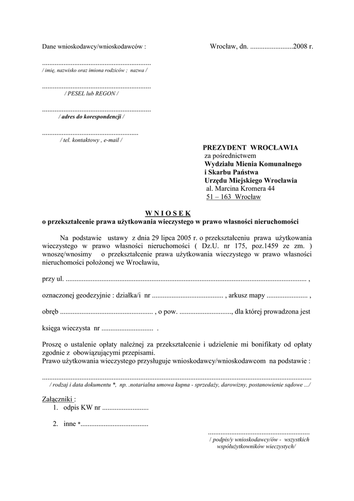 Dane wnioskodawcy/wnioskodawców : Wrocław, dn. ........................2008 r. ............................................................. / imię, nazwisko oraz imiona rodziców ; nazwa / ............................................................. / PESEL lub REGON / ............................................................. / adres do korespondencji / ...................................................... / tel. kontaktowy , e-mail / PREZYDENT WROCŁAWIA za pośrednictwem Wydziału Mienia Komunalnego i Skarbu Państwa Urzędu Miejskiego Wrocławia al. Marcina Kromera 44 51 – 163 Wrocław WNIOSEK o przekształcenie prawa uŜytkowania wieczystego w prawo własności nieruchomości Na podstawie ustawy z dnia 29 lipca 2005 r. o przekształceniu prawa uŜytkowania wieczystego w prawo własności nieruchomości ( Dz.U. nr 175, poz.1459 ze zm. ) wnoszę/wnosimy o przekształcenie prawa uŜytkowania wieczystego w prawo własności nieruchomości połoŜonej we Wrocławiu, przy ul. ....................................................................................................................................... , oznaczonej geodezyjnie : działka/i nr ........................................ , arkusz mapy ....................... , obręb .................................................... , o pow. ............................., dla której prowadzona jest księga wieczysta nr ............................. . Proszę o ustalenie opłaty naleŜnej za przekształcenie i udzielenie mi bonifikaty od opłaty zgodnie z obowiązującymi przepisami. Prawo uŜytkowania wieczystego przysługuje wnioskodawcy/wnioskodawcom na podstawie : ....................................................................................................................................................... / rodzaj i data dokumentu *, np. .notarialna umowa kupna - sprzedaŜy, darowizny, postanowienie sądowe .../ Załączniki : 1. odpis KW nr .......................... 2. inne *...................................... ......................................................... / podpis/y wnioskodawcy/ów - wszystkich współuŜytkowników wieczystych/ Uwaga : 1. Przekształcenie prawa uŜytkowania wieczystego w prawo własności następuje odpłatnie ( co do zasady ) : a) na warunkach określonych w art. 67 ust.1, art.68 ust.1, art.69 oraz art.70 ust. 2 – 4 ustawy z 21 sierpnia 1997 r. o gospodarce nieruchomościami ( Dz.U. z 2004 r. nr 261, poz. 2603 i nr 281, poz. 2782 oraz z 2005 r. nr 130, poz. 1087 i nr 169, poz. 1420 ) - z zastosowaniem bonifikaty określonej w r. uchwale XLV/2998/05 Rady Miejskiej Wrocławia z 29 grudnia 2005 w sprawie wyraŜenia zgody na udzielanie bonifikaty od opłaty za przekształcenie prawa uŜytkowania wieczystego w prawo własności nieruchomości, gdy postępowanie zostało wszczęte przed 13 października 2005 r.; b) na warunkach określonych w art. 67 ust.1, art.69 ustawy z 21 sierpnia 1997 r. o gospodarce nieruchomościami ( Dz.U. z 2004 r. nr 261, poz. 2603 i nr 281, poz. 2782 oraz z 2005 r. nr 130, poz. 1087 i nr 169, poz. 1420 ) - z zastosowaniem bonifikaty określonej w ustawie z 7 września 2007 r. o zmianie ustawy o przekształceniu prawa uŜytkowania wieczystego w prawo własności nieruchomości oraz niektórych innych ustaw (Dz. U. nr 191, poz. 1371) oraz w uchwale XX/567/08 Rady Miejskiej Wrocławia z 17 kwietnia 2008 r. w sprawie wyraŜenia zgody na udzielanie bonifikaty od opłaty za przekształcenie prawa uŜytkowania wieczystego w prawo własności nieruchomości w postępowaniach wszczętych na podstawie przepisów ustawy z dnia 29 lipca 2005 r. o przekształceniu prawa uŜytkowania wieczystego w prawo własności nieruchomości (Dziennik Urzędowy Województwa Dolnośląskiego nr 134, poz. 1581), tj. gdy postępowanie zostało wszczęte po 12 października 2005 r.; 2. Przekształcenie prawa następuje nieodpłatnie ( wyjątki od zasady ) na rzecz tych uŜytkowników wieczystych lub ich następców prawnych, którym przed dniem 5 grudnia 1990 r. oddano nieruchomość w uŜytkowanie wieczyste w zamian za wywłaszczenie lub przejęcie nieruchomości gruntowej na rzecz Skarbu Państwa na podstawie innych tytułów ; 3. Wnioskodawca ponosi koszty wyceny nieruchomości, niezbędne do ustalenia kwoty naleŜnej za przekształcenie prawa do gruntu ; 4. Za wydanie decyzji kończącej postępowanie wszczęte wnioskiem po dniu 31 grudnia 2006 r., organ pobierze opłatę skarbową w kwocie 10.00 zł. Decyzje umarzające postępowanie lub wydawane w postępowaniu odwoławczym albo w trybie szczególnym, zwolnione są od opłaty skarbowej;