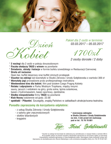 Dzień Kobiet Pakiet dla 2 osób w terminie: 03.03.2017 – 05.03.2017 1700zł 2 osoby dorosłe / 2 doby * 2 noclegi dla 2 osób w pokoju dwuosobowym * Paczka słodyczy TAGO z winem na powitanie * Śniadania, obiady i kolacje w formie bufetu szwedzkiego w Restauracji Czerwonej * Strefa all inclusive: Open bar, buffet deserowy oraz buffet zimnych przekąsek * Voucher na zabiegi lub kosmetyki w Studio Zdrowia i Urody Gołębiewska o wartości 300 zł * Warsztaty jogi prowadzone przez profesjonalnego instruktora * Weekendowe kino dla kobiet, film pod tytułem Czego Pragną Kobiety * Relaks i odprężenie w Parku Wodnym Tropikana, między innymi: sauny, jacuzzi z widokiem na góry, grota solna, tężnia solankowa, basen z hydromasażem, basen sportowy, zjeżdżalnie. * Słodka niespodzianka firmy TAGO na powitanie * Klub Nocny codziennie od godz. 22.00 * spektakl - Pikantni. Szczegóły, znajdą Państwo w zakładkach atrakcje/scena teatralna. Ponadto zapraszamy do korzystania odpłatnie: - z usług Studia Zdrowia i Urody Gołębiewska - z salonu gier zręcznościowych - stołów bilardowych - kręgielni * rezerwacja zabiegów w Studiu Zdrowia i Urody Gołębiewska na min. 5 dni przed ich realizacją pod nr tel. 75 76 70 861 *Voucher na zabiegi lub kosmetyki do odebrania przy zameldowaniu w recepcji Hotelu o wartości 300 zł. W przypadku zakupu na prezent wysyłamy okazjonalne zaproszenie po otrzymaniu opłaty za rezerwację. Potwierdzamy realizację zaproszenia w miarę dostępności pokoi. Zastrzegamy sobie możliwość zmiany cen. Zapraszamy do skontaktowania się z Biurem Marketingu w celu omówienia szczegółów oferty, tel. (75) 76 70 521-527.