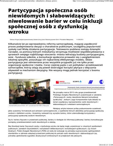 Portalsamorzadowy.pl - samorząd terytorialny - aktualności, dotacje, prawo 1z4 http://www.portalsamorzadowy.pl/drukuj/52405.html Partycypacja społeczna osób niewidomych i słabowidzących: niwelowanie barier w celu inkluzji społecznej osób z dysfunkcją wzroku Dariusz Krupa (artykuł sponsorowany dostarczony przez Stowarzyszenie Gmin i Powiatów Małopolski) 11-09-2013 Kilkanaście lat po wprowadzeniu reformy samorządowej, mającej uspołecznić proces podejmowania decyzji o charakterze publicznym, szczególną popularność zyskały nad Wisłą działania partycypacje. Testowaniu poddane zostają dziesiątki narzędzi, za pomocą których mieszkańcy otrzymują możliwość współdecydowania o sprawach swojego najbliższego otoczenia: miasta wdrażają budżety partycypacyjne, wsie - fundusze sołeckie, a konsultacje społeczne prowadzi się z uwzględnieniem lokalnej specyfiki, poszukując ich najbardziej efektywnego modelu. Słowo partycypacja jest odmieniane przez wszystkie przypadki już nie tylko przez organizacje społeczne i media. Coraz częściej pada z ust polityków i przedstawicieli samorządów, którzy zdają się powoli dostrzegać korzyści płynące z włączania obywateli w mechanizm decyzyjny. Nie wszyscy mogą jednak korzystać z boomu partycypacji. Szkoleniedla pracowników JST i przedstawicieli PZN w Muszynie Na początku marca 2013 roku grupa przedstawicieli Polskiego Związku Niewidomych uczestniczyła w szkoleniu „PartycypacJA: osoby niewidome liderami komunikacji społecznej". Jednym z jego komponentów była debata na temat współpracy reprezentantów osób niewidomych i słabowidzących z władzami samorządowymi. Niniejszy artykuł stanowi próbę podsumowania oczekiwań, jakie uczestnicy formułowali pod adresem samorządowców, a spełnienie których ułatwiłoby partycypację społeczną osobom z defektem wzroku. Uczestnicy wskazali trzy wyraźne bariery, które uniemożliwiają korzystanie z partycypacji społecznej osobom niewidomym. Są to: bariery fizyczne w przestrzeni publicznej, bariery w dostępie do informacji publicznej i bariery komunikacyjne pomiędzy przedstawicielami osób niewidomych a władzą. Bez likwidacji barier fizycznych osoby z dysfunkcją wzroku nie będą mogły uczestniczyć w otwartych spotkaniach publicznych, panelach obywatelskich, warsztatach deliberatywnych, konsultacjach społecznych, czy forach lokalnych. Polski Związek Niewidomych (PZN) od wielu lat wskazuje na potrzebę wypracowania ogólnopolskich standardów w zakresie adaptacji przestrzeni publicznej do potrzeb osób niewidomych i słabowidzących (np. potrzebę ujednolicenia sygnałów akustycznych emitowanych na przejściach dla pieszych). 2014-02-21 12:09 Portalsamorzadowy.pl - samorząd terytorialny - aktualności, dotacje, prawo 2z4 http://www.portalsamorzadowy.pl/drukuj/52405.html Standardy te powinny być oparte na zasadzie „pomagać (nam), nie przeszkadzać (innym)", co znaczy, że udogodnienia wprowadzane z myślą o osobach niewidomych nie powinny stwarzać problemów dla pozostałych użytkowników przestrzeni miejskiej (jakimi są na przykład zbyt głośno emitowane sygnały akustyczne). Dziś często zapomina się o tej zasadzie, czego emanacją jest obniżanie krawężników przy przejściach dla pieszych do poziomu jezdni. To duże udogodnienie dla osób poruszających się na wózkach inwalidzkich, ale równocześnie śmiertelne niebezpieczeństwo dla osób niewidomych. Z tego też powodu PZN w swoich rekomendacjach uwzględnia potrzeby nie tylko osób z dysfunkcją wzroku, ale także innych użytkowników przestrzeni miejskiej (np. osób starszych). Wiele szczegółowych rozwiązań, których celem jest dostosowanie przestrzeni fizycznej do potrzeb osób niepełnosprawnych, wprowadziło już polskie prawodawstwo. Praktyka wskazuje jednak, że na poziomie samorządowym, nie zawsze jest ono odpowiednio wykonywane. Pewne zmiany może przynieść implementowanie do polskiego porządku prawnego konwencji ONZ o prawach osób niepełnosprawnych. Konwencja ta, ratyfikowana przez Prezydenta Rzeczypospolitej Polskiej w 2012 roku, reguluje kwestie związane z dostępem osób niewidomych do środowiska fizycznego. Zobowiązuje ona do eliminacji przeszkód i barier w zakresie dostępności budynków, dróg transportu oraz innych urządzeń wewnętrznych i zewnętrznych, w tym szkół, mieszkań, instytucji zapewniających opiekę medyczną i miejsc pracy: Aby umożliwić osobom niepełnosprawnym niezależne życie i pełny udział we wszystkich sferach życia, Państwa Strony podejmą odpowiednie środki w celu zapewnienia im, na zasadzie równości z innymi osobami, dostępu do środowiska fizycznego, środków transportu, informacji i komunikacji, w tym technologii i systemów informacyjnokomunikacyjnych, a także do innych urządzeń i usług, powszechnie dostępnych lub powszechnie zapewnianych, zarówno na obszarach miejskich, jak i wiejskich. Artykuł 9 - Dostępność, punkt 1 W dalszej części artykułu 9 Konwencji czytamy: Państwa Strony podejmą również odpowiednie środki w celu: (a) opracowywania, ogłaszania i monitorowania wdrażania minimalnych standardów i wytycznych w sprawie dostępności urządzeń i usług ogólnie dostępnych lub powszechnie zapewnianych, (...) (c) zapewnienia wszystkim zainteresowanym osobom szkolenia na temat kwestii dostępności dla osób niepełnosprawnych, (...) (e) zapewnienia różnych form pomocy i pośrednictwa ze strony innych osób lub zwierząt, w tym przewodników, lektorów (...), w celu ułatwienia dostępu do ogólnodostępnych budynków i innych obiektów publicznych, (f) popierania innych odpowiednich form pomocy i wsparcia osób niepełnosprawnych, aby zapewnić im dostęp do informacji (...). Skutkiem wdrożenia omawianej konwencji może być profesjonalna, przeszkolona w zakresie obsługi osób niewidomych, kadra urzędnicza. Albo nowe pokolenia architektów, które - w toku obowiązko