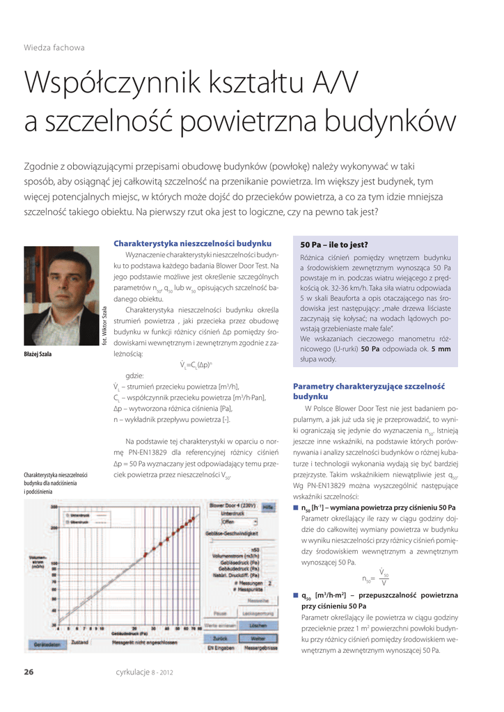 Wiedza fachowa Współczynnik kształtu A/V a szczelność powietrzna budynków Zgodnie z obowiązującymi przepisami obudowę budynków (powłokę) należy wykonywać w taki sposób, aby osiągnąć jej całkowitą szczelność na przenikanie powietrza. Im większy jest budynek, tym więcej potencjalnych miejsc, w których może dojść do przecieków powietrza, a co za tym idzie mniejsza fot. Wiktor Szala szczelność takiego obiektu. Na pierwszy rzut oka jest to logiczne, czy na pewno tak jest? Błażej Szala Charakterystyka nieszczelności budynku dla nadciśnienia i podciśnienia Charakterystyka nieszczelności budynku 50 Pa – ile to jest? Wyznaczenie charakterystyki nieszczelności budynku to podstawa każdego badania Blower Door Test. Na jego podstawie możliwe jest określenie szczególnych parametrów n50, q50 lub w50 opisujących szczelność badanego obiektu. Charakterystyka nieszczelności budynku określa strumień powietrza , jaki przecieka przez obudowę budynku w funkcji różnicy ciśnień Δp pomiędzy środowiskami wewnętrznym i zewnętrznym zgodnie z zależnością: ∙ V L=CL(∆p)n gdzie: ∙ V L – strumień przecieku powietrza [m3/h], CL – współczynnik przecieku powietrza [m3/h·Pan], ∆p – wytworzona różnica ciśnienia [Pa], n – wykładnik przepływu powietrza [-]. Różnica ciśnień pomiędzy wnętrzem budynku a środowiskiem zewnętrznym wynosząca 50 Pa powstaje m in. podczas wiatru wiejącego z prędkością ok. 32-36 km/h. Taka siła wiatru odpowiada 5 w skali Beauforta a opis otaczającego nas środowiska jest następujący: „małe drzewa liściaste zaczynają się kołysać; na wodach lądowych powstają grzebieniaste małe fale”. We wskazaniach cieczowego manometru różnicowego (U-rurki) 50 Pa odpowiada ok. 5 mm słupa wody. Na podstawie tej charakterystyki w oparciu o normę PN-EN13829 dla referencyjnej różnicy ciśnień ∆p = 50 Pa wyznaczany jest odpowiadający temu przeciek powietrza przez nieszczelności V50. Parametry charakteryzujące szczelność budynku W Polsce Blower Door Test nie jest badaniem popularnym, a jak już uda się je przeprowadzić, to wyniki ograniczają się jedynie do wyznaczenia n50. Istnieją jeszcze inne wskaźniki, na podstawie których porównywania i analizy szczelności budynków o różnej kubaturze i technologii wykonania wydają się być bardziej przejrzyste. Takim wskaźnikiem niewątpliwie jest q50. Wg PN-EN13829 można wyszczególnić następujące wskaźniki szczelności: ■ n50 [h-1] – wymiana powietrza przy ciśnieniu 50 Pa Parametr określający ile razy w ciągu godziny dojdzie do całkowitej wymiany powietrza w budynku w wyniku nieszczelności przy różnicy ciśnień pomiędzy środowiskiem wewnętrznym a zewnętrznym wynoszącej 50 Pa. ∙ V 50 n50= V ■ q50 [m3/h·m2] – przepuszczalność powietrzna przy ciśnieniu 50 Pa Parametr określający ile powietrza w ciągu godziny przecieknie przez 1 m2 powierzchni powłoki budynku przy różnicy ciśnień pomiędzy środowiskiem wewnętrznym a zewnętrznym wynoszącej 50 Pa. 26 cyrkulacje 8 - 2012 Wiedza fachowa BUDYNEK A BUDYNEK B Politechnika Poznańska – Centrum Mechatroniki, Biomechaniki i Nanoinżynierii n50=0,3 [1/h] A/V=0,2 [1/m] Vi=48964 [m3] 3 q50=1,5 [m /h·m ] q50= Pasywna hala sportowa w Słomnikach n50=0,12 [1/h] 2 BUDYNEK C A/V=0,39 [1/m] ∙ V 50 AE ■ w50 [m3/h·m2] – strumień jednostkowy przecieku powietrza przy ciśnieniu 50 Pa Parametr określający ile powietrza w odniesieniu do 1 m2 powierzchni podłogi netto przecieknie w ciągu godziny przy różnicy ciśnień pomiędzy środowiskiem wewnętrznym a zewnętrznym wynoszącej 50 Pa. ∙ V 50 w50= AF Dom pasywny jednorodzinny MULTICOMFORT w Boruszowicach Vi=12780 [m3] 3 2 q50=0,31 [m /h·m ] n50=0,5 [1/h] Vi=316 [m3] A/V=1,0 [1/m] q50=0,5 [m3/h·m2] szy. Wynika to z tego, że przyrost objętości budynku jest większy od przyrostu powierzchni jego powłoki. Z energetycznego punktu widzenia budynek o niskim A/V „zużywa” mniej energii niż wykonany w tej samej technologii budynek o wyższym A/V. Dlatego na potrzeby obliczeń Charakterystyk Energetycznych Budynków współczynnik A/V jest kryterium, względem którego określono wartości graniczne zużycia energii pierwotnej EP. REKLAMA gdzie: ∙ V50 – strumień przecieku powietrza przy ciśnieniu 50 Pa [m3/h], V – kubatura wewnętrzna [m3], AE – pole obudowy budynku [m2], AF – pole powierzchni podłogi [m2], Dokonując kilku przekształceń, można wykazać następującą zależność: ∙ V 50 n50 V = q50 V∙ 50 AF n50 AE = q50 V gdzie: AE V ( ) q50 = n50⋅ -1 AE – współczynnik kształtu budynku (zwartość buV dynku) liczony po wymiarach wewnętrznych [1/m]. Co to jest i na co wpływa współczynnik kształtu A/V Współczynnik kształtu A/V, inaczej zwartość bryły, jest to stosunek pola powierzchni budynku do jej objętości. Im większy budynek tym wskaźnik A/V mniej- www.cyrkulacje.pl 27 Wiedza fachowa A jak to się ma do szczelności? Odpowiedzi należy szukać we wskaźniku q50. Aby dokładniej zobrazować wyprowadzone wcześniej zależności, przeanalizujmy trzy różne budynki, które zostały poddane próbie szczelności i których wyniki n50 spełniają warunek budynku pasywnego (n50≤0,6 h-1) Na uzyskane wyniki pomiarów poszczególnych budynków składają się takie elementy jak rodzaj konstrukcji, technologia wykonania, rodzaj użytych materiałów, jakość i dokładność prac budowlanych itp. W każdym z tych budynków najbardziej charakterystycznym wskaźnikiem uwzględniającym wszystkie te elementy jest q50. Z dużym prawdopodobieństwem można powiedzieć, że gdyby wybudować budynek podobny do któregokolwiek z powyższych, ale o innych wymiarach Tabela 1. Zmiany wskaźnika n50 [1/h] dla różnych wartości AE/V q50 [m3/h·m2] AE/V [1/m] 0,2 0,39 1,0 BUDYNEK A 1,5 0,3 0,59 1,5 BUDYNEK B 0,31 0,06 0,12 0,31 BUDYNEK C 0,5 0,1 0,2 0,5 Wpływ zwartości bryły na ws