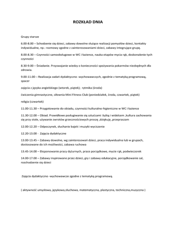 ROZKŁAD DNIA Grupy starsze 6.00-8.00 – Schodzenie się dzieci, zabawy dowolne służące realizacji pomysłów dzieci, kontakty indywidualne, np.: rozmowy zgodne z zainteresowaniami dzieci, zabawy integrujące grupę. 8.00-8.30 – Czynności samoobsługowe w WC i łazience, nauka etapów mycia rąk, doskonalenie tych czynności 8.30-9.00 – Śniadanie. Przyswajanie wiedzy o konieczności spożywania pokarmów niezbędnych dla zdrowia. 9.00-11.00 – Realizacja zadań dydaktyczno -wychowawczych, zgodnie z tematyką programową, spacer zajęcia z języka angielskiego (wtorek, piątek); rytmika (środa) ćwiczenia gimnastyczne, siłownia Mini Fitness Club (poniedziałek, środa, czwartek, piątek) religia (czwartek) 11.00-11.30 – Przygotowanie do obiadu, czynności kulturalno-higieniczne w WC i łazience 11.30-12.00 – Obiad. Prawidłowe posługiwanie się sztućcami :łyżką i widelcem ,kultura zachowania się przy stole, używanie zwrotów grzecznościowych proszę ,dziękuję ,przepraszam 12.00-12.20 – Odpoczynek, słuchanie bajek i muzyki-wyciszenie 12.20-13.00 - Zajęcia dydaktyczne 13.00-13.45 – Zabawy dowolne, wg zainteresowań dzieci, praca indywidualna lub w grupach, dostosowane do ich możliwości, zabawa ruchowa 13.45-14.00 – Eksponowanie pracy dyżurnych, prace porządkowe, mycie rąk, podwieczorek 14.00-17.00 – Zabawy inspirowane przez dzieci, gry i zabawy edukacyjne, porządkowanie sal, rozchodzenie się dzieci Zajęcia dydaktyczno -wychowawcze zgodne z tematyką programową. ( aktywność umysłowa, językowa,słuchowa, matematyczna, plastyczna, techniczna,muzyczna ) ROZKŁAD DNIA Grupy młodsze 6.00-8.00 – Schodzenie się dzieci, zabawy dowolne służące realizacji pomysłów dzieci, kontakty indywidualne, np.: rozmowy zgodne z zainteresowaniami dzieci, zabawy integrujące grupę 8.00-8.30 – Czynności samoobsługowe w WC i łazience, nauka etapów mycia rąk, doskonalenie tych czynności 8.30-9.00 – Śniadanie. Przyswajanie wiedzy o konieczności spożywania pokarmów niezbędnych dla zdrowia 9.00-11.00 – Realizacja zadań dydaktyczno -wychowawczych, zgodnie z tematyką programową, spacer zajęcia z języka angielskiego (wtorek, piątek); rytmika (środa) ćwiczenia gimnastyczne, siłownia Mini Fitness Club (worek) 11.00-11.30 – Przygotowanie do obiadu, czynności kulturalno-higieniczne w WC i łazience 11.30-12.00 – Obiad. Prawidłowe posługiwanie się sztućcami: łyżką i widelcem kultura zachowania się przy stole 12.00-13.30 – Przygotowanie do odpoczynku-leżakowanie 13.30-14.00 – Prace porządkowe, mycie rąk, podwieczorek 14.00-17.00 –zabawy inspirowane przez dzieci, gry i zabawy edukacyjne, porządkowanie sal, rozchodzenie się dzieci Zajęcia dydaktyczno -wychowawcze zgodne z tematyką programową. ( aktywność umysłowa, językowa,słuchowa, matematyczna, plastyczna, techniczna,muzyczna )