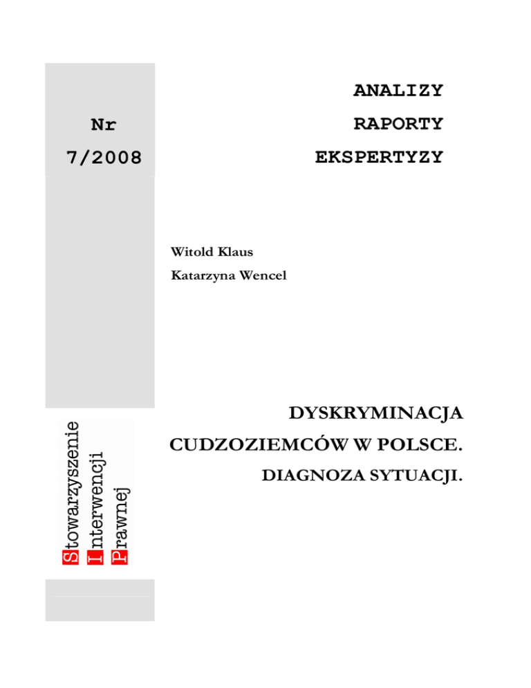 ANALIZY RAPORTY Nr EKSPERTYZY 7/2008 Witold Klaus Katarzyna Wencel DYSKRYMINACJA CUDZOZIEMCÓW W POLSCE. DIAGNOZA SYTUACJI. 2 Dyskryminacja cudzoziemców w Polsce. Diagnoza sytuacji. 1. Wstęp W ostatnich latach powstało w Polsce kilka opracowań dotyczących zagadnień dyskryminacji na tle rasowym, narodowościowym czy etnicznym. Dotyczyły one w duŜej mierze zagadnienia traktowania przez polskie społeczeństwo Romów, kwestii związanych z mową nienawiści i stosunkiem Polaków do śydów1 czy teŜ problematyki mniejszości narodowych w Polsce. Analizie poddawane były zarówno uregulowania prawne, jak równieŜ praktyka ich stosowania – poprzez wywiady z przedstawicielami danych grup, analizę akt sądowych czy doniesień medialnych. Powstały takŜe opracowania dotyczące cudzoziemców, jednak w niewielkim stopniu diagnozowały one zjawisko dyskryminacji w odniesieniu do tej grupy osób2. Badano postawy społeczeństwa polskiego wobec osób o innej narodowości czy rasie3. W niniejszym opracowaniu chcemy się skupić na pokazaniu pewnych cech dyskryminacji cudzoziemców w Polsce. W zasadzie brak jest danych statystycznych, spraw sądowych oraz badań empirycznych na ten temat. Prowadzone wcześniej badania skupiały się bowiem raczej na zjawisku integracji migrantów, zagadnienia dyskryminacyjne traktując jedynie pobocznie. Istnieją takŜe trudności natury metodologicznej przy badaniu tej problematyki, gdyŜ często osoby ankietowane albo nie rozumieją terminu, którym się posługujemy i w związku z tym nie potrafią zakwalifikować spotykających ich zdarzeń jako dyskryminacyjnych, albo teŜ uwaŜają za dyskryminujące wydarzenia, które za takie uznane być względem prawa nie mogą4. W związku z przedstawionymi powyŜej problemami, chcemy przedstawić zjawisko dyskryminacji w perspektywie róŜnych spraw, z którymi zgłaszają się cudzoziemcy do Stowarzyszenia Interwencji Prawnej. Podejście takie nie oddaje zatem całości problemu, ale naświetla najczęściej pojawiające się sytuacje, z jakimi mamy w naszym kraju do czynienia, i pokazuje pewne kierunki, w których naleŜy podejmować działania, by zmienić obecną sytuację. Po krótkim nakreśleniu podstawowych przepisów prawnych obowiązujących w naszym kraju w zakresie przeciwdziałania dyskryminacji z powodu rasy, narodowości i pochodzenia etnicznego prezentujemy kilka kazusów konkretnych spraw, z jakimi mieliśmy do czynienia w roku 2007 i 20085, by następnie poddać je analizie i spróbować opisać zjawisko dyskryminacji cudzoziemców. 2. Co to jest dyskryminacja i jak ją rozpoznać Jest wiele definicji dyskryminacji. Przedstawione są one takŜe w róŜnych aktach prawnych (o czym niŜej). Wydaje się, Ŝe ideę dyskryminacji oddaje definicja, która określa ten stan jako „mniejsze szanse dostępu do rozmaitych dóbr społecznych (wykształcenia, zawodu, majątku, praw politycznych itp.) tylko dlatego, iŜ ktoś jest członkiem 1 W tym zakresie patrz np. inicjatywy oraz publikacje Stowarzyszenia Otwarta Rzeczpospolita na stronie: www.or.org.pl oraz raport: Dla Tolerancji. Działania Otwartej Rzeczpospolitej 2007, Warszawa 2008. 2 por. np. M. Bieniecki, J. Frelak, Non-Poles on the Polish labour market. Problems and Challenges. An overview of the issue of racial/ethnic discrimination in the private sector in Poland, Gliwice 2005; K. Iglicka (red.), Integracja czy dyskryminacja? Polskie wyzwania i dylematy wielokulturowości, Warszawa 2003; Krajobraz dyskryminacji I, „Raporty Migracyjne” 2003, nr 1; Krajobraz dyskryminacji II, „Raporty Migracyjne” 2003, nr 4. 3 Ciekawy zbiór badań CBOS moŜna znaleźć na stronie: http://www.bezuprzedzen.org/dyskryminacja/index.php?dzial=UD_Badania%20op 4 Problem ten dotyczy takŜe zagadnienia udzielania porad z zakresu dyskryminacji. Więcej na ten temat patrz: Wytyczne na temat prowadzenia poradnictwa w sprawach dotyczących dyskryminacji z powodu pochodzenia etnicznego, rasy lub narodowości, będące załącznikiem do niniejszego raportu. 5 Opis spraw z zakresu dyskryminacji Romów moŜna znaleźć na stronie Towarzystwa Interwencji Kryzysowej z Krakowa: Przypadki dyskryminacji wobec Romów dostrzeŜone przez Towarzystwo Interwencji Kryzysowej w ramach projektu „To nasza sprawa” finansowanego ze środków Phare 2001 „Rozwój społeczeństwa obywatelskiego”: www.crisisintervention.free.ngo.pl, zakładka: biblioteczka/prawo Stowarzyszenie Interwencji Prawnej Analizy, Raporty, Ekspertyzy 7/2008 3 Dyskryminacja cudzoziemców w Polsce. Diagnoza sytuacji. jakiejś grupy będącej przedmiotem stereotypu (przesądów, stygmatyzacji), bez uwzględnienia jego indywidualnych kwalifikacji i zasług”6. Dyskryminacja moŜe przybrać postać bezpośredniej lub pośredniej. Z tą pierwszą mamy do czynienia, gdy ktoś traktowany jest mniej korzystnie, niŜ inna osoba w podobnej sytuacji. Jest to sytuacja łatwiejsza do identyfikacji. O dyskryminacji pośredniej mówimy natomiast wówczas, gdy dane zachowanie lub przepisy są pozornie neutralne i Ŝadnej osoby czy grupy nie traktują inaczej, jednak po ich bliŜszym i głębszym zbadaniu, okazuje się, Ŝe sposób ich sformułowania jest taki, iŜ negatywne skutki dotykają określonej grupy społecznej, bowiem w praktyce tylko ona się w takiej sytuacji moŜe znaleźć. Warto jeszcze dodać, Ŝe moŜemy mieć do czynienia z zachowaniami dyskryminującymi (werbalnymi czy niewerbalnymi), dyskryminującą praktyką (gdy podejmowane są zabronione prawem zachowania), ale takŜe z dyskryminującymi przepisami – nawet natury ustawowej (tzw. dyskryminacją systemową). Pisząc na temat dyskryminacji cudzoziemców naleŜy od razu zaznaczyć, Ŝe w pewnym zakresie moŜe mieć ona miejsce – dopuszczają ją regulacje prawno-międzynarodowe. KaŜde państwo moŜe bowiem w stosunkowo dowolny sposób określić, jakich cudzoziemców chciałoby mieć na swoim terenie. MoŜe w związku z tym wprowadzić róŜnego