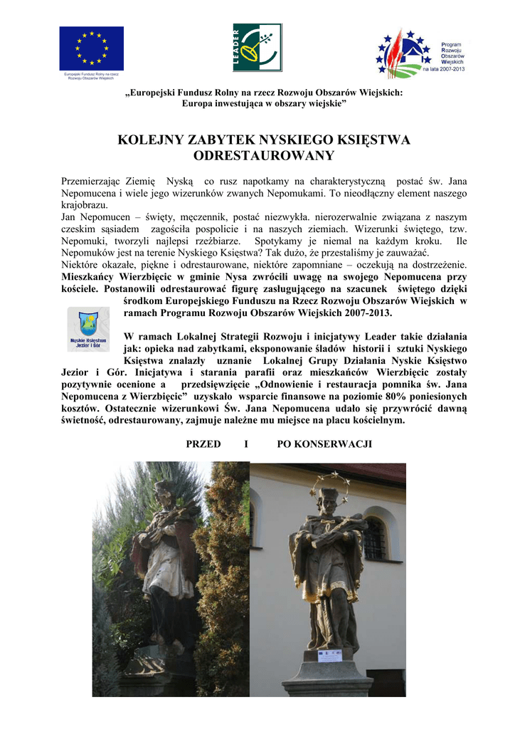 „Europejski Fundusz Rolny na rzecz Rozwoju Obszarów Wiejskich: Europa inwestująca w obszary wiejskie” KOLEJNY ZABYTEK NYSKIEGO KSIĘSTWA ODRESTAUROWANY Przemierzając Ziemię Nyską co rusz napotkamy na charakterystyczną postać św. Jana Nepomucena i wiele jego wizerunków zwanych Nepomukami. To nieodłączny element naszego krajobrazu. Jan Nepomucen – święty, męczennik, postać niezwykła. nierozerwalnie związana z naszym czeskim sąsiadem zagościła pospolicie i na naszych ziemiach. Wizerunki świętego, tzw. Nepomuki, tworzyli najlepsi rzeźbiarze. Spotykamy je niemal na każdym kroku. Ile Nepomuków jest na terenie Nyskiego Księstwa? Tak dużo, że przestaliśmy je zauważać. Niektóre okazałe, piękne i odrestaurowane, niektóre zapomniane – oczekują na dostrzeżenie. Mieszkańcy Wierzbięcic w gminie Nysa zwrócili uwagę na swojego Nepomucena przy kościele. Postanowili odrestaurować figurę zasługującego na szacunek świętego dzięki środkom Europejskiego Funduszu na Rzecz Rozwoju Obszarów Wiejskich w ramach Programu Rozwoju Obszarów Wiejskich 2007-2013. W ramach Lokalnej Strategii Rozwoju i inicjatywy Leader takie działania jak: opieka nad zabytkami, eksponowanie śladów historii i sztuki Nyskiego Księstwa znalazły uznanie Lokalnej Grupy Działania Nyskie Księstwo Jezior i Gór. Inicjatywa i starania parafii oraz mieszkańców Wierzbięcic zostały pozytywnie ocenione a przedsięwzięcie „Odnowienie i restauracja pomnika św. Jana Nepomucena z Wierzbięcic” uzyskało wsparcie finansowe na poziomie 80% poniesionych kosztów. Ostatecznie wizerunkowi Św. Jana Nepomucena udało się przywrócić dawną świetność, odrestaurowany, zajmuje należne mu miejsce na placu kościelnym. PRZED I PO KONSERWACJI