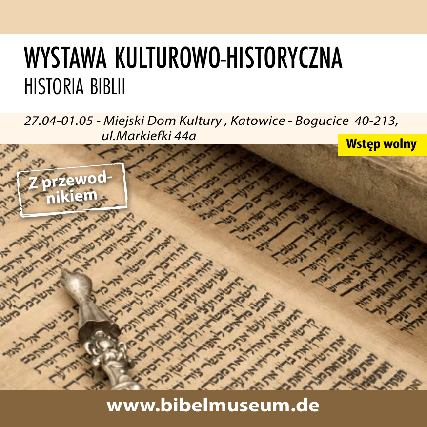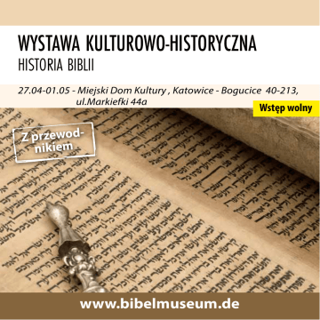 Wystawa kulturowo-historyczna Historia Biblii 27.04-01.05 - Miejski Dom Kultury , Katowice - Bogucice 40-213, ul.Markiefki 44a Wstęp wolny Z przewodnikiem www.bibelmuseum.de Wystawa kulturowo-historyczna z przewodnikiem Zagadnienia kluczowe: • rozwój sztuki pisania w starożytności • najstarsze teksty Biblii • przesłanie Biblii • prasa Gutenberga (replika) Oryginały: • tabliczka z pismem klinowym • hieroglificzne inskrypcje • fragmenty papirusów • rękopisy Biblii z XII wieku • drukowana Biblia z XV wieku • zwój Tory (z początku XVIII wieku) Kopie: • Kodeks Watykański, Kodeks Synajski • średniowieczne rękopisy • niemiecki przekład Biblii Lutra Czasy współczesne: • badania i wydania naukowe Biblii • Biblia dla niewidomych napisana alfabetem Braille‘a • tłumaczenia Biblii w różnych językach • Biblia w wersji elektronicznej Rzut oka na wystawę kulturowo-historyczną Gdzie? Kiedy? Godziny otwarcia: Oprowadzanie: Co? Organizator: MDK Bogucice, 40-213 Katowice, ul.Markiefki 44a 27 kwietnia (poniedziałek) do 1 maja (piątek)2015r. Poniedziałek 11:00 – 19:00 Wtorek-Czwartek 9:00-19:00 Piątek 9:00-14:00 odbywa się przez cały dzień – rezerwacji grup prosimy dokonywać telefonicznie lub pocztą elektroniczną przedstawiamy świat Biblii, pokaz slajdów Museum für Bibelgeschichte e.V. Bendahler Str. 58 • 42285 Wuppertal Kontakt regionalny i partnerzy wystawy: MDK Katowice-Bogucice Biskup Diecezji Katowickiej Kościoła Ewangelicko Augsburskiego - ks. dr Marian Niemiec REZERWACJA TELEFONICZNA- Grabowski Józef tel. 0 660 456 041 Sekretariat MDK - tel.: (32) 203-05-17 e-mail: [email protected] www.bibelmuseum.de