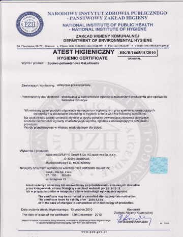 lxl -,PZH; NARODOWY INSTYTUT ZDROWIA PUBLICZNEGO - PANsTwowY ZAKŁAD HIGIENY NATIONALINSTITUTEOF PUBLIC HEALTH - NATIONALINSTITUTEOF HYGIENE / ______:__i:"-' (rs . r.) ZAKŁAD H|GIENYKoMUNALNEJ HYGIENE OF ENVIRONMENTAL DEPARTMENT - ] . łc h U c i ń s k ! 0 0 . 7 9 l $ a r ! ! $ . Phone (22) 5.l2l35:l:(22) 542'319 . Ea\ (22) 512|287 . € ' mail: sek.7hk.4pfh.goY.pl ATEST HIGIENICZNY tumneasntnorc HYGIENICCERTIFICATE oRYGINAŁ Wyrób/ productI spoiwo poIiuletanoweGaLaKreativ poIiizocyjaniany zaw|erający / containjng:aIifatyczne jakc spoiwodo PŻefnaczonydo / destined:stosowaniaw budownictwie zgodnieŻ zaleceniamiproducenta kamieniai kfuszylv Wvmieniony w}żejp.oduktodpowiadawymaganiom higienicznyriplzy spełnieniu następującyoh warunków/ is acceptab|e accoding to hygieniccriteriawithihe fo||owing conditions: Na opakowaniu na|eżyumieścić etykietęwjęzykupo|skim'zawierającązaiecenia dotyczące pzepjsamj ślodkówoshożnościwg kańy charakterystyki wyrobu'zgodniez obowiązująćymi Wyrób przechowywać W miejscuniedostępnym d|adzieci' WytWÓlca / producer: quick-mix GRUPPE GmbH& Co.KG,quickmixSp.z.o.o. D'49090Osnabruck, lvluhleneschweg 6 D, 49090Niemcy NiniejszydokumentWydanona wniosek / this ceńificate issued for: ouick- mixSo. r o.o. 57 - 100 Slzelin u|.BŻegowa73 po pęedstawleniustosownychdowodów Atest możebyć fmieniony Iub uniewaźniony p.zez którąkolwiek stronę' Niniejszyatest traciważnośópo 20,l5.12.13 |ubł'rpEypadku zmian w recepturzea|bow techno|ogiiwytważanialvyrobu. The ceńificate may be cor.ectedo. cance|l€ d afterappropriatemofivation. The ceńificate loses its va|idityafter 2015.12.13 or in the case of changes in compositioncr jn technclcgy of production, Datalvydaniaatestuhigienicznegor 13 grudnia2010 The dateof issueofthe ceńiflcate: 13thDecember 2010 Reproduk.wan e' koplowanie fologEIowan e, skanMńie d qitaizacjaA1estuH qienieńelo r celdcrTader'goq(5 berrAonvNITPPTH "s /rbro-o.e $rvw.pzh.gov.pl