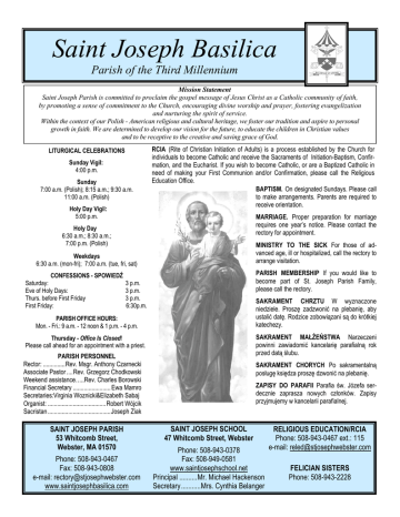 Saint Joseph Basilica Parish of the Third Millennium Mission Statement Saint Joseph Parish is committed to proclaim the gospel message of Jesus Christ as a Catholic community of faith, by promoting a sense of commitment to the Church, encouraging divine worship and prayer, fostering evangelization and nurturing the spirit of service. Within the context of our Polish - American religious and cultural heritage, we foster our tradition and aspire to personal growth in faith. We are determined to develop our vision for the future, to educate the children in Christian values and to be receptive to the creative and saving grace of God. LITURGICAL CELEBRATIONS Sunday Vigil: 4:00 p.m. Sunday 7:00 a.m. (Polish); 8:15 a.m.; 9:30 a.m. 11:00 a.m. (Polish) Holy Day Vigil: 5:00 p.m. RCIA (Rite of Christian Initiation of Adults) is a process established by the Church for individuals to become Catholic and receive the Sacraments of Initiation-Baptism, Confirmation, and the Eucharist. If you wish to become Catholic, or are a Baptized Catholic in need of making your First Communion and/or Confirmation, please call the Religious Education Office. BAPTISM. On designated Sundays. Please call to make arrangements. Parents are required to receive orientation. MARRIAGE. Proper preparation for marriage requires one year’s notice. Please contact the rectory for appointment. Holy Day 6:30 a.m.; 8:30 a.m.; 7:00 p.m. (Polish) MINISTRY TO THE SICK For those of advanced age, ill or hospitalized, call the rectory to arrange visitation. Weekdays 6:30 a.m. (mon-fri); 7:00 a.m. (tue, fri, sat) PARISH MEMBERSHIP If you would like to become part of St. Joseph Parish Family, please call the rectory. CONFESSIONS - SPOWIEDŹ Saturday: Eve of Holy Days: Thurs. before First Friday First Friday: 3 p.m. 3 p.m. 3 p.m. 6:30p.m. SAKRAMENT CHRZTU W wyznaczone niedziele. Proszę zadzwonić na plebanię, aby ustalić datę. Rodzice zobowiązani są do krótkiej katechezy. PARISH OFFICE HOURS: Mon. - Fri.: 9 a.m. - 12 noon & 1 p.m. - 4 p.m. SAKRAMENT MAŁŻEŃSTWA Narzeczeni powinni zawiadomić kancelarię parafialną rok przed datą ślubu. Thursday - Office Is Closed! Please call ahead for an appointment with a priest. PARISH PERSONNEL Rector: .............. Rev. Msgr. Anthony Czarnecki Associate Pastor .... Rev. Grzegorz Chodkowski Weekend assistance…..Rev. Charles Borowski Financial Secretary ........................ Ewa Mamro Secretaries:Virginia Woznicki&Elizabeth Sabaj Organist: ..................................... Robert Wójcik Sacristan ........................................ Joseph Ziak SAINT JOSEPH PARISH 53 Whitcomb Street, Webster, MA 01570 Phone: 508-943-0467 Fax: 508-943-0808 e-mail: [email protected] www.saintjosephbasilica.com SAKRAMENT CHORYCH Po sakramentalną posługę księdza proszę dzwonić na plebanię. ZAPISY DO PARAFII Parafia św. Józefa serdecznie zaprasza nowych członków. Zapisy przyjmujemy w kancelarii parafialnej. SAINT JOSEPH SCHOOL 47 Whitcomb Street, Webster Phone: 508-943-0378 Fax: 508-949-0581 www.saintjosephschool.net Principal ..........Mr. Michael Hackenson Secretary ...........Mrs. Cynthia Belanger RELIGIOUS EDUCATION/RCIA Phone: 508-943-0467 ext.: 115 e-mail: [email protected] FELICIAN SISTERS Phone: 508-943-2228 Page 2 July 3, 2016 Masses for the week—Msze Św. w Tygodniu Sunday Vigil 4:00pm r.s. Cecilia and Stanley Majka - int. Jane, Linden, Katie and Tyler O’Leary Sunday - July 3 7:00 Za wypominki 8:15 For the parishioners of St. Joseph Basilica 9:30 r.s. Celia and Joseph Bukowski - int. A friend 11:00 ś.p. Maria i Franciszek Kurpiel (16 r. Śm.) i Stanisław Kurpiel - int. Anna i Edward Kudron Monday - July 4 - Independence Day 6:30 r.s. Joseph, Stasia, Bernard, James, Charles, Carl Gogolinski and grandson, Joseph - int. Family Tuesday– July 5 6:30 r.s. Connie Czechowski - int. Holy Rosary Sodality Wednesday - July 6 6:30 Prosząc św. Józefa o błogosławienstwo Boże dla rodziny Mysiorskich - int. Elżbieta Mysiorska 7:00pm O zdrowie i Boże błogosławienstwo dla rodziny Gaszek i Warzyńskich - int. Andrzej Warzyński Thursday - July 7 6:30 ś.p. Kazimiera, Marianna i Mieczysław Fijołek - int. Zofia Kaźmierczak Friday - July 8 6:30 ś.p. Jan Nagiel (2 r. śm.) - int. żona z dziećmi Saturday - July 9 7:00 r.s. Joseph and Edith Lazarowski - int. Niece, Jane Sunday Vigil 4:00 r.s. Helen Mrzyglod - int. Husband, Edward Sunday - July 10 7:00 Za wypominki 8:15 For the parishioners of St. Joseph Basilica 9:30 r.s. Lynn Marszalkowski - int. Joseph Mikołajczak 11:00 ś.p. Anna i Franciszek Tomkiewicz - int. syn Maciej 3 lipca 2016 r. Stewardship Note: “He said to them, ‘The harvest is abundant, but the laborers are few. . . .’” As Catholics we are all called to serve in ministry. However, many of us are unsure how to use our talents and gifts to build God’s Church. Talk to God and ask Him what He wants you to do. The next time one of your fellow parishioners asks you to help or join a committee, it may be the answer to your prayer. FOURTEENTH SUNDAY IN ORDINARY TIME July 3, 2016 May I never boast except in the cross of our Lord Jesus Christ. - Galatians 6:14 PEACE The greeting of peace at Mass adds substance to a message of today’s readings: peace is relational. When we greet in peace the person near us at Mass, we share the touch of a handshake or embrace, sincere eye contact, and friendly words. The scriptures speak of a similar peace. The first reading from Isaiah describes the peace of the holy city, Jerusalem, a place of prosperity and comfort where the “LORD’s power shall be known to his servants”. The Christian understanding of peace changes slightly. Paul writes of the “peace and mercy” on all who are created anew. Jesus describes a feeling of peace that will rest on those who accept his disciples and their message. Peace is both an absence of strife and a personal blessing. May we always and sincerely bring peace to our own lives as we share it