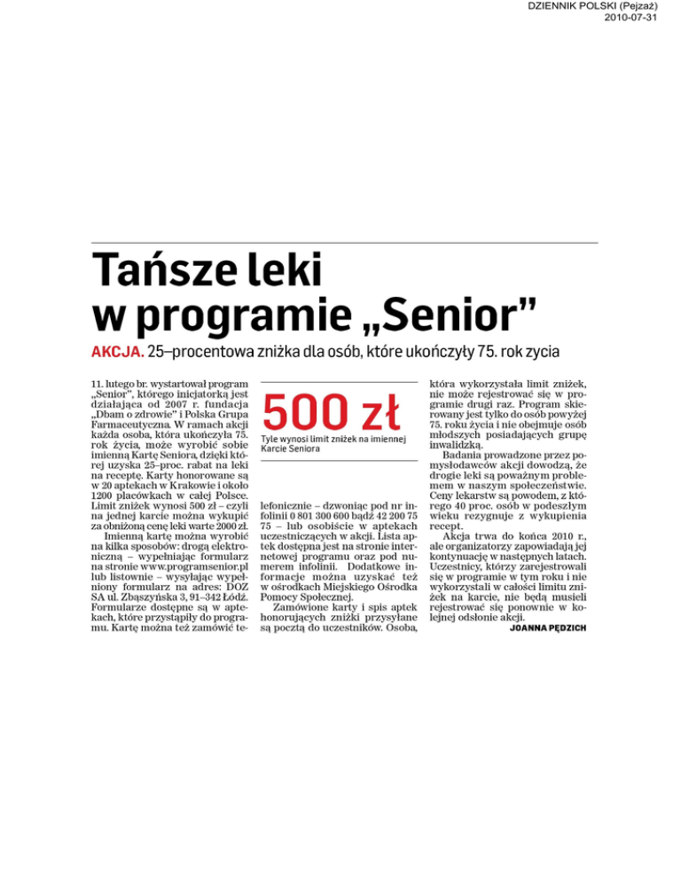 DZIENNIK POLSKI (Pejza¿) 2010-07-31 Tańsze leki w programie „Senior" AKCJA. 25-procentowa zniżka dla osób, które ukończyły 75. rok życia 11. lutego br. wystartował program „Senior", którego inicjatorką jest działająca od 2007 r. fundacja „Dbam o zdrowie" i Polska Grupa Farmaceutyczna W ramach akcji każda osoba, która ukończyła 75. rok życia, może wyrobić sobie imienną Kartę Seniora dzięki któ rej uzyska 25-proc. rabat na leki na receptę. Karty honorowane są w 20 aptekach w Krakowie i około 1200 placówkach w całej Polsce. Limit zniżek wynosi 500 zł - czyli na jednej karcie można wykupić za obniżoną cenę leki warte 2000 zł. Imienną kartę można wyrobić na kilka sposobów: drogą elektro niczną - wypełniając formularz na stronie www.programsenior.pl lub listownie - wysyłając wypeł niony formularz na adres: DOZ SA ul. Zbąszyńska 3,91-342 Łódź. Formularze dostępne są w apte kach, które przystąpiły do progra mu. Kartę można też zamówić te- która wykorzystała limit zniżek, nie może rejestrować się w pro gramie drugi raz. Program skie rowany jest tylko do osób powyżej 75. roku życia i nie obejmuje osób młodszych posiadających grupę Tyle wynosi limit zniżek na imiennej inwalidzką. Karcie Seniora Badania prowadzone przez po mysłodawców akcji dowodzą, że drogie leki są poważnym proble mem w naszym społeczeństwie. Ceny lekarstw są powodem, z któ lefonicznie - dzwoniąc pod nr in rego 40 proc. osób w podeszłym folinii 0 801 300 600 bądź 42 200 75 wieku rezygnuje z wykupienia 75 - lub osobiście w aptekach recept. uczestniczących w akcji. Lista ap Akcja trwa do końca 2010 r., tek dostępna jest na stronie inter ale organizatorzy zapowiadają jej netowej programu oraz pod nu kontynuację w następnych latach. merem infolinii. Dodatkowe in Uczestnicy, którzy zarejestrowali formacje można uzyskać też się w programie w tym roku i nie w ośrodkach Miejskiego Ośrodka wykorzystali w całości limitu zni Pomocy Społecznej. żek na karcie, nie będą musieli Zamówione karty i spis aptek rejestrować się ponownie w ko honorujących zniżki przysyłane lejnej odsłonie akcji. są pocztą do uczestników. Osoba, JOANNA PĘDZICH 500 zł