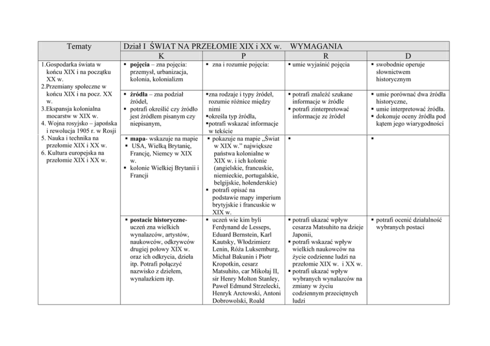 Tematy Dział I ŚWIAT NA PRZEŁOMIE XIX i XX w. K P 1.Gospodarka świata w pojęcia – zna pojęcia: końcu XIX i na początku przemysł, urbanizacja, XX w. kolonia, kolonializm 2.Przemiany społeczne w końcu XIX i na pocz. XX źródła – zna podział w. źródeł, 3.Ekspansja kolonialna potrafi określić czy źródło mocarstw w XIX w. jest źródłem pisanym czy 4. Wojna rosyjsko – japońska niepisanym, i rewolucja 1905 r. w Rosji 5. Nauka i technika na mapa- wskazuje na mapie przełomie XIX i XX w. USA, Wielką Brytanię, 6. Kultura europejska na Francję, Niemcy w XIX przełomie XIX i XX w. w. kolonie Wielkiej Brytanii i Francji postacie historyczneuczeń zna wielkich wynalazców, artystów, naukowców, odkrywców drugiej połowy XIX w. oraz ich odkrycia, dzieła itp. Potrafi połączyć nazwisko z dziełem, wynalazkiem itp. WYMAGANIA R D zna i rozumie pojęcia: umie wyjaśnić pojęcia swobodnie operuje słownictwem historycznym zna rodzaje i typy źródeł, rozumie różnice między nimi określa typ źródła, potrafi wskazać informacje w tekście pokazuje na mapie „Świat w XIX w.” największe państwa kolonialne w XIX w. i ich kolonie (angielskie, francuskie, niemieckie, portugalskie, belgijskie, holenderskie) potrafi opisać na podstawie mapy imperium brytyjskie i francuskie w XIX w. uczeń wie kim byli Ferdynand de Lesseps, Eduard Bernstein, Karl Kautsky, Włodzimierz Lenin, Róża Luksemburg, Michał Bakunin i Piotr Kropotkin, cesarz Matsuhito, car Mikołaj II, sir Henry Molton Stanley, Paweł Edmund Strzelecki, Henryk Arctowski, Antoni Dobrowolski, Roald potrafi znaleźć szukane informacje w źródle potrafi zinterpretować informacje ze źródeł umie porównać dwa źródła historyczne, umie interpretować źródła. dokonuje oceny źródła pod kątem jego wiarygodności potrafi ukazać wpływ cesarza Matsuhito na dzieje Japonii, potrafi wskazać wpływ wielkich naukowców na życie codzienne ludzi na przełomie XIX w. i XX w. potrafi ukazać wpływ wybranych wynalazców na zmiany w życiu codziennym przeciętnych ludzi potrafi ocenić działalność wybranych postaci wydarzenia – zna najważniejsze wydarzenia, potrafi je wymienić, nanieść na oś chronologiczną. Amundsen, Robert Peary, Wilhelm Roentgen, Maria Skłodowska – Curie, Albert Einstein, Ludwik Pasteur, Kazimierz Funk, Alfred Nobel, Gottlieb Daimler, Karl Benz, Rudolf Diesel, Henry Ford, bracia orville, Wilbur Wright, Tmasz Edison, Alexander Graham Bell, Gugliemo Marconii, August Comte, Fryderyk Nietzche, Emil Zola Gustaw Flaubert, Honoriusz Balzak, Stendahl, Charles Dickens, Iwan Turgieniew, Lew Tołstoj, Fiodor Dostojewski, Eliza Orzeszkowa, Bolesław Prus, marek Twain, Charles Baudelaire, Charles Monet, Paul Cezanne, Vincent van Goch, Paul Gauguin, Pablo Picasso potrafi napisać notkę biograficzną wybranych postaci opisuje zmiany w gospodarce, kulturze i technice w XIX w. opisuje jak zmieniło się życie ludzi w XIX w. potrafi ukazać wpływ wybranych postaci na przemiany społeczne, gospodarcze, polityczne i kulturalne umie omówić zmiany w gospodarce, nauce, kulturze, technice itp., jakie dokonały się na przełomie XIX i XX w. i potrafi uczeń potrafi wyjaśnić dlaczego powstał ruch robotniczy i jakie były jego cele uczeń potrafi porównać sporządzić plan wydarzeń zna najważniejsze zmiany do jakich doszło w XIX w. w technice, gospodarce i kulturze, architekturze wymienia najważniejsze osiągnięcia z powyższych dziedzin zna datę wojny rosyjsko – japońskiej potrafi opisać warunki życia robotników w XIX w. wymienia przyczyny kolonializmu i jego skutki wymienia przyczyny i skutki kolonializmu i je omawia omawia rozwój kolonializmu wymienia przyczyny i skutki wojny japońsko rosyjskiej zna postanowienia i datę pokoju w Portsmouth kończącego wojnę japońsko – rosyjską i je omawia wymienia reformy do jakich doszło w Rosji po wojnie rosyjsko japońskiej wymienia kierunki w ruchu robotniczym wymienia i opisuje kierunki w sztuce XIX w. wyjaśnić jaki wpływ miały one na życie ludzi dostrzega uwarunkowania polit., gosp., społ. i kulturalne wojny japońsko – rosyjskiej i rewolucji 1905 r. wyjaśnia znaczenie reform jakie dokonały się w Japonii w XIX w. uczeń omawia przemiany jakie dokonały się w życiu ludzi pod koniec XIX i XX w. uczeń przedstawia poglądy wielkich przedstawicieli ruchu robotniczego w drugiej połowie XIX w. uczeń przedstawia poglądy sufrażystek uczeń określa cele polityki mocarstw kolonialnych poglądy wielkich przedstawicieli ruchu robotniczego potrafi określić pozytywne i negatywne skutki rozwoju technicznego i naukowego, który dokonał się w na przełomie XIX i XX w. uczeń wyjaśnia przyczyny i uwarunkowania wojny japońsko – rosyjskiej uczeń wyjaśnia przyczyny i uwarunkowania rewolucji 1905 r. potrafi ukazać jaki wpływ na wybuch rewolucji 1905 r. miał wynik wojny rosyjsko - japońskiej uczeń potrafi wykazać związek pomiędzy rozwojem gospodarczym, który dokonał się w drugiej połowie XIX w., a kolonializmem
