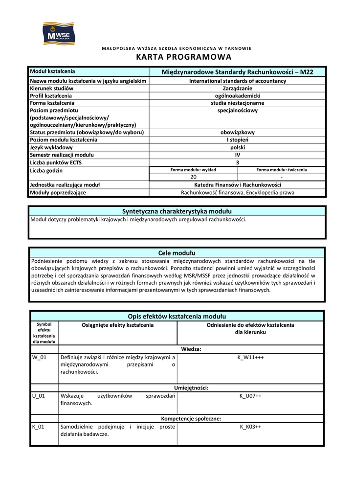 MAŁOP OLSKA WYŻSZ A SZ KOŁA E KONOMICZNA W TARN OW IE KARTA PROGRAMOWA Moduł kształcenia Międzynarodowe Standardy Rachunkowości – M22 Nazwa modułu kształcenia w języku angielskim Kierunek studiów Profil kształcenia Forma kształcenia Poziom przedmiotu (podstawowy/specjalnościowy/ ogólnouczelniany/kierunkowy/praktyczny) Status przedmiotu (obowiązkowy/do wyboru) Poziom modułu kształcenia Język wykładowy Semestr realizacji modułu Liczba punktów ECTS Liczba godzin International standards of accountancy Zarządzanie ogólnoakademicki studia niestacjonarne specjalnościowy obowiązkowy I stopień polski IV 3 Forma modułu: wykład Forma modułu: ćwiczenia 20 Katedra Finansów i Rachunkowości Rachunkowość finansowa, Encyklopedia prawa Jednostka realizująca moduł Moduły poprzedzające Syntetyczna charakterystyka modułu Moduł dotyczy problematyki krajowych i międzynarodowych uregulowań rachunkowości. Cele modułu Podniesienie poziomu wiedzy z zakresu stosowania międzynarodowych standardów rachunkowości na tle obowiązujących krajowych przepisów o rachunkowości. Ponadto studenci powinni umieć wyjaśnić w szczególności potrzebę i cel sporządzania sprawozdań finansowych według MSR/MSSF przez jednostki prowadzące działalność w różnych obszarach działalności i w różnych formach prawnych jak również wskazać użytkowników tych sprawozdań i uzasadnić ich zainteresowanie informacjami prezentowanymi w tych sprawozdaniach finansowych. Opis efektów kształcenia modułu Symbol efektu kształcenia dla modułu Osiągnięte efekty kształcenia Odniesienie do efektów kształcenia dla kierunku Wiedza: W_01 U_01 K_01 Definiuje związki i różnice między krajowymi a międzynarodowymi przepisami o rachunkowości. Wskazuje użytkowników finansowych. Umiejętności: sprawozdań Kompetencje społeczne: Samodzielnie podejmuje i inicjuje proste działania badawcze. K_W11+++ K_U07++ K_K03++ Treści kształcenia modułu Forma modułu: wykład 1. Zasady stosowania prawa wspólnotowego w Polsce ( prawo pierwotne i prawo wtórne UE). Forma modułu: ćwiczenia 2. Publikacja MSR/MSSF w dziennikach urzędowych Unii Europejskiej serii L w języku polskim – zasady korzystania z tych publikacji. 3. Podstawy prawne wprowadzania i stosowania MSR/MSSF – procedura ich przyjmowania w UE. 4. Konsekwencje wdrożenia MSR/MSSF do polskiego prawa gospodarczego. 5. Wpływ MSR/MSSF na rachunkowość w jednostkach gospodarczych. 6. Podstawowe (nadrzędne) zasady rachunkowości stosowane w MSR/MSSF. 7. Zagadnienia rachunkowości nie uregulowane w MSR/MSSF wynikające z polskich przepisów o rachunkowości. 8. Wewnętrzna struktura (budowa) poszczególnych MSR/MSSF – punkty wspólne dla wszystkich standardów. 9. Pojęcie wartości godziwej w poszczególnych MSR/MSSF – przykłady jej ustalania. 10. Podstawowe różnice między rozwiązaniami MSR/MSSF a polskimi przepisami o rachunkowości. 11. Rachunkowość międzynarodowa – czy możliwy jest jeden globalny system rachunkowości na świecie (możliwości zbliżenia US GAAP, UK GAAP, MSR/MSSF, krajowych standardów rachunkowości). 12. Omówienie projektu Międzynarodowego Standardu Sprawozdawczości Finansowej dla Małych i Średnich Przedsiębiorstw - podstawowe różnice między MSR/MSSF a projektem standardu dla MSP. Literatura podstawowa 1. 2. 3. 4. Literatura uzupełniająca 1. 2. Molenda – Zaleska B., Międzynarodowe standardy rachunkowości i międzynarodowe standardy sprawozdawczości finansowej: zadania z rozwiązaniami. Stowarzyszenie Księgowych w Polsce. Zarząd Główny. Centralny Ośrodek Szkolenia Zawodowego, Warszawa 2010, Winiarska, K. (red.), Rachunkowość międzynarodowa: praca zbiorowa. Ośrodek Doradztwa i Doskonalenia Kadr, Gdańsk 2009, Seredyński R., Międzynarodowe Standardy Rachunkowości. "Poltext", Warszawa 2009, Jaruga A., Międzynarodowe Standardy Sprawozdawczości Finansowej MSSF/MSR. Stowarzyszenie Księgowych w Polsce. Zarząd Główny. Centralny Ośrodek Szkolenia Zawodowego, Warszawa 2009, Molenda W., Wartość godziwa – zastosowanie i procedury ustalania. Stowarzyszenie Księgowych w Polsce, Warszawa 2008, Jaruga A. (red.), Jednostkowe sprawozdanie finansowe sporządzone według międzynarodowych standardów rachunkowości MSR/MSSF. Stowarzyszenie Księgowych w Polsce, Warszawa 2005, Metody dydaktyczne Wykłady ilustrowane przykładami z praktyki z zakresu rachunkowości, audytu wewnętrznego ,audytu zewnętrznego i podatków. Pomoce dydaktyczne w postaci tekstów MSR/MSSF pobranych ze strony internetowej Ministerstwa Finansów ( zakładka: rachunkowość).