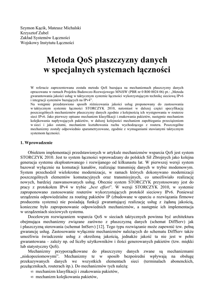 Szymon Kącik, Mateusz Michalski Krzysztof Zubel Zakład Systemów Łączności Wojskowy Instytutu Łączności Metoda QoS płaszczyzny danych w specjalnych systemach łączności W referacie zaprezentowana została metoda QoS bazująca na mechanizmach płaszczyzny danych opracowana w ramach Projektu Badawczo-Rozwojowego MNiSW (PBR nr 0 R00 0024 06) pt.: „Metoda gwarantowania jakości usług w taktycznym systemie łączności wykorzystującym technikę sieciową IPv6 i integracji systemów bazujących na IPv4”. Na wstępnie przedstawiono sposób różnicowania jakości usług proponowany do zastosowania w taktycznym systemie łączności STORCZYK 2010, natomiast w dalszej części specyfikację poszczególnych mechanizmów płaszczyzny danych zgodnie z kolejnością ich występowania w routerze sieci IPv6. Jako pierwszy opisano mechanizm klasyfikacji i znakowania pakietów, następnie mechanizm kolejkowania napływających pakietów, w dalszej kolejności mechanizm zapobiegania przeciążeniom w sieci i jako ostatni, mechanizm kształtowania ruchu wychodzącego z routera. Poszczególne mechanizmy zostały odpowiednio sparametryzowane, zgodnie z wymaganiami stawianymi taktycznym systemom łączności. 1. Wprowadzenie Obiektem implementacji przedstawionych w artykule mechanizmów wsparcia QoS jest system STORCZYK 2010. Jest to system łączności wprowadzany do polskich Sił Zbrojnych jako kolejna generacja systemu eksploatowanego i rozwijanego od kilkunastu lat. W pierwszej wersji system bazował wyłącznie na komutacji kanałów, realizując transmisję danych w trybie modemowym. System przechodził wielokrotne modernizacje, w ramach których dokonywano modernizacji poszczególnych elementów komutacyjnych oraz transmisyjnych, co umożliwiało realizację nowych, bardziej zaawansowanych usług. Obecnie system STORCZYK przystosowany jest do pracy z protokołem IPv4 w trybie „best effort”. W wersji STORCZYK 2010, w systemie zaproponowano zastosowanie routerów wykorzystujących protokół sieciowy IPv6. Ponieważ urządzenia odpowiedzialne za routing pakietów IP (zbudowane w oparciu o rozwiązania firmowe producenta systemu) nie posiadają funkcji gwarantującej realizację usług z żądaną jakością, konieczne było zaproponowanie odpowiednich mechanizmów, a następnie ich implementacja w urządzeniach sieciowych systemu. Docelowym rozwiązaniem wsparcia QoS w sieciach taktycznych powinna być architektura obejmująca mechanizmy związane zarówno z płaszczyzną danych (schemat DiffServ) jak i płaszczyzną sterowania (schemat IntServ) [12]. Tego typu rozwiązanie może zapewnić tzw. pełną gwarancję usług. Zastosowanie wyłącznie mechanizmów należących do schematu DiffServ także umożliwia świadczenie usług z określoną jakością, jednakże jakość ta nie jest w pełni gwarantowana – zależy np. od liczby użytkowników i ilości generowanych pakietów (tzw. miękki lub statystyczny QoS). Mechanizmy przyporządkowane do płaszczyzny danych zwane są mechanizmami „niskopoziomowymi”. Mechanizmy te w sposób bezpośredni wpływają na obsługę przekazywanych danych we wszystkich elementach sieci (terminalach abonenckich, przełącznikach, routerach itp.). Do mechanizmów tych należą: • mechanizm klasyfikacji i znakowania pakietów, • mechanizm kolejkowania pakietów, • mechanizm przeciwdziałania przeciążeniom, • mechanizm kształtowania ruchu. W architekturze DiffServ zapewnienie jakości usług nie odbywa się na poziomie pojedynczego strumienia danych, lecz na poziomie grupy strumieni danych przydzielonych do pewnej klasy usług sieciowych, tzw. CoS (ang. Class of Service), którym są przypisane odpowiednie parametry QoS. Napływające od użytkownika pakiety danych są klasyfikowane oraz znakowane na wejściu do sieci przy wykorzystaniu unikalnego kodu DS (ang. Differentiated Services). Każda wartość kodu DS przyporządkowana jest do pewnej klasy usług CoS. Poszczególne klasy usług CoS mają przypisane określone wartości parametrów QoS. Na potrzeby realizacji Projektu Badawczo-Rozwojowego (PBR nr 0 R00 0024 06) pt.: „Metoda gwarantowania jakości usług w taktycznym systemie łączności wykorzystującym technikę sieciową IPv6 i integracji systemów bazujących na IPv4” zostały przyjęte cztery podstawowe klasy usług sieciowych CoS opisane podstawowymi parametrami QoS [1]. Specyfikacja przyjętych klas usług CoS została przedstawiona w tabeli nr 1. Tabela 1. Wymagania jakościowe dla różnych klas usług sieciowych Klasy usług sieciowych CoS Real Time (RT) Non Real TimeTime Critical (NRT-TC) Non Real Time (NRT) Best Effort (BE) Wymagania QoS /wartości dopuszczalne/ Poziom strat pakietów Wielkość opóźnienia Zmienność opóźnienia 10-3 100 msek 50 msek 10-3 400 msek - 10-3 1 sek - - - - Rodzaje usług użytkownika Przekaz mowy, przekaz wideo Przekaz informacji sterujących, komunikatów głosowych, danych pilnych Przekaz obrazów i grafiki, www. e-mail Pierwsza klasa usług sieciowych (RT) jest przeznaczona dla obsługi ruchu strumieniowego (o stałej i zmiennej szybkości bitowej) z rygorystycznymi wymaganiami dotyczącymi zapewnienia małego opóźnienia przekazu pakietów, małego jittera oraz małego poziomu utraty pakietów. Ruch o takim profilu i takich wymaganiach QoS jest właściwy dla aplikacji realizujących usługi konwersacyjne (telefon, wideotelefon) oraz usługi strumieniowe (audio i wideo). Ruch kierowany do sieci przez użytkownika jest w tym przypadku charakteryzowany określoną wartością szczytowej szybkości bitowej PBR (Peak Bit Rate). Wartość ta wynika z zastosowanych kodeków głosu, audio i wideo. Dwie kolejne usługi (NRT-TC, NRT) są przeznaczone dla obsługi ruchu elastycznego, tj. wykorzystującego protokół TCP (Transmission Control Protocol). Usługa NRT-TC jest przeznaczona do przesyłania ruchu generowanego przez krótkotrwałe połączenia TCP. Usługa NRT jest przeznaczona