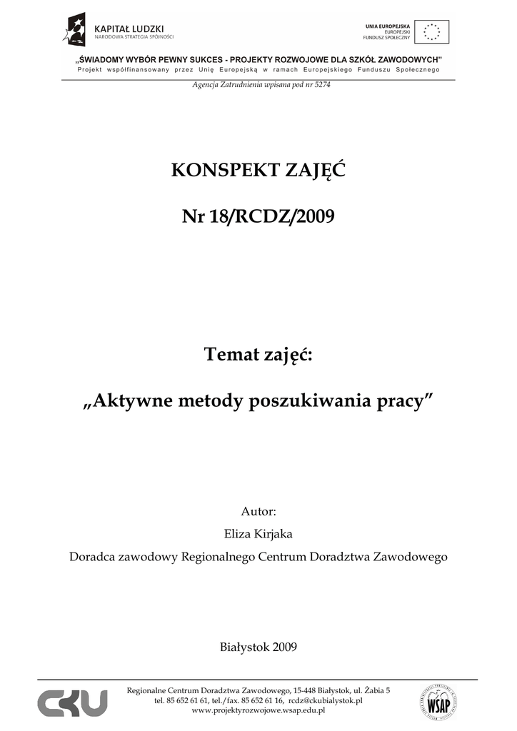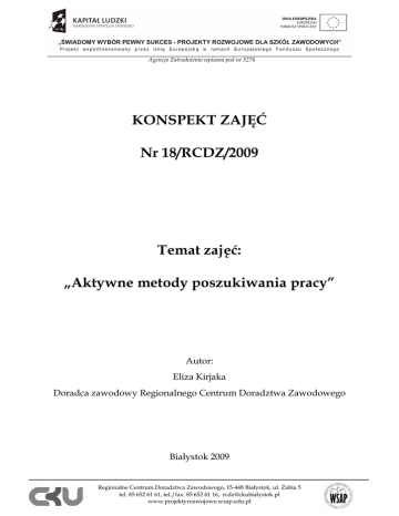 Agencja Zatrudnienia wpisana pod nr 5274 KONSPEKT ZAJĘĆ Nr 18/RCDZ/2009 Temat zajęć: „Aktywne metody poszukiwania pracy” Autor: Eliza Kirjaka Doradca zawodowy Regionalnego Centrum Doradztwa Zawodowego Białystok 2009 Regionalne Centrum Doradztwa Zawodowego, 15-448 Białystok, ul. śabia 5 tel. 85 652 61 61, tel./fax. 85 652 61 16, [email protected] www.projektyrozwojowe.wsap.edu.pl Agencja Zatrudnienia wpisana pod nr 5274 Cele zajęć: 1. Przedstawienie podstawowych informacji dotyczących rynku pracy w Polsce. 2. Ukazanie tendencji zmian na rynku pracy. 3. Dokonanie analizy sytuacji wyjściowej – aktualnego połoŜenia uczestników zajęć. 4. Wskazanie na źródła informacji o wolnych miejscach pracy. 5. Zapoznanie z technikami/metodami efektywnego poszukiwania pracy. 6. Poznanie wymagań i oczekiwań pracodawców. 7. Kształtowanie postawy aktywnej w poszukiwaniu pracy. 8. Nabycie umiejętności wykorzystania w praktyce róŜnych metod poszukiwania pracy. 9. Nabycie umiejętności zredagowania własnej oferty o poszukiwaniu określonej pracy. 10. Planowanie działań w poszukiwaniu pracy. 11. Przełamywanie obaw związanych z wejściem na rynek pracy Korzyści (efekty zajęć): W wyniku zajęć uczestnicy: − mają wiedzę ogólną dotyczącą rynku pracy w Polsce oraz tendencji i zmian na nim zachodzących, − znają swoje aktualne połoŜenie uwzględniające posiadane zasoby (kwalifikacje, umiejętności, zdolności), − potrafią określić w jakich zawodach i w jakich specjalnościach mogą znaleźć pracę, po ukończeniu szkoły zawodowej, − znają źródła informacji o pracy, − znają techniki poszukiwania pracy, − potrafią odnaleźć oferty pracy przy wykorzystaniu Internetu, − potrafią zredagować własną ofertę pracy, − odpowiedzieć na ofertę pracy zamieszczoną przez pracodawcę, − tworzą własną strategię poszukiwania pracy. Metody pracy: Zajęcia prowadzone będą metodami aktywizującymi uczestników, z wykorzystaniem róŜnorodnych form i metod. W większości zajęcia składać się będą z pracy w grupach, pracy Regionalne Centrum Doradztwa Zawodowego, 15-448 Białystok, ul. śabia 5 tel. 85 652 61 61, tel./fax. 85 652 61 16, [email protected] www.projektyrozwojowe.wsap.edu.pl Agencja Zatrudnienia wpisana pod nr 5274 indywidualnej, dyskusji kierowanej, burzy mózgów z nastawieniem na aktywność uczestników podczas ćwiczeń. Ponadto kaŜdy z uczestników będzie miał szansę zaprezentować swoje zdanie na forum grupy. Sposób prowadzenia zajęć zakłada maksymalny i aktywny udział wszystkich uczestników, przy zminimalizowaniu tradycyjnych sposobów przekazywania wiedzy. Materiały: Podczas zajęć wykorzystuje się karty pracy oraz autorskie scenariusze przygotowane przez doradców zawodowych na podstawie podręczników dla doradców zawodowych. Ponadto cześć zajęć odbywać się będzie w sali informatycznej, gdzie młodzieŜ będzie miała moŜliwość skorzystać z informacji zawartych w Internecie. W trakcie zajęć z młodzieŜą w dyspozycji będą takŜe inne pomoce typu: tablica lub flipchart, papier do flipchartu lub duŜe arkusze papieru, przypory do pisania i inne. Czas trwania zajęć: 90 minut Zagadnienia: 1. Rynek pracy w Polsce. 2. Tendencje zmian na rynku pracy. 3. Analiza sytuacji wyjściowej – aktualnego połoŜenia uczestników. 4. Źródła informacji o pracy. 5. Metody poszukiwania pracy. 6. Planowanie działań w poszukiwaniu pracy. Literatura: 1. Informator o zawodach: testy predyspozycji, moŜliwości zatrudnienia, ścieŜki edukacyjne, zawody poszukiwane, Wyd. III poszerzone i uzupełnione, Perspektywy Press, Warszawa 2005 2. Grądziel E. (red.), Jak skutecznie szukać pracy?, Wyd. POLIHYMNIA Sp. z o. o., Rzeszów 2007 3. Hardy D., Taylor J., Kardaszewski J. (tłum.), Jak efektywnie poszukiwać pracy. Wykorzystanie metody firmy MONSTER, Wolters Kluwer Polska – Oficyna, Kraków 2007 Regionalne Centrum Doradztwa Zawodowego, 15-448 Białystok, ul. śabia 5 tel. 85 652 61 61, tel./fax. 85 652 61 16, [email protected] www.projektyrozwojowe.wsap.edu.pl Agencja Zatrudnienia wpisana pod nr 5274 4. Hebda P., Madejski J., Zawód z pasją: praktyczny przewodnik po rynku pracy, Wydawnictwo Park Sp. z o.o., Bielsko Biała 2004 5. Iwanowska-Maćkowiak M., Programy edukacyjne i zawodowe w Unii Europejskiej. Wydawnictwo C.H. Beck, Warszawa 2006 6. Paszkowska-Rogacz A., Warsztat pracy europejskiego doradcy kariery, Krajowy Ośrodek Wspierania Edukacji Zawodowej i Ustawicznej, Warszawa 2002 7. Sołtysińska G., śywiec-Dąbrowska E., Moja przyszła praca. Materiały metodyczne do pracy z uczniami szkół zawodowych, Krajowy Ośrodek Wspierania Edukacji Zawodowej i Ustawicznej, Warszawa 2003 8. Tullier L. M., Networking, Wolters Kluwer, Kraków 2006 9. Vademecum Dobrych Praktyk. Scenariusze i programy warsztatów aktywizacji zawodowej młodzieŜy, Centrum Informacji i Planowania Kariery Zawodowej Wojewódzkiego Urzędu Pracy w Łodzi, Filia w Piotrkowie Trybunalskim, MGPiPS, Warszawa 2003 Regionalne Centrum Doradztwa Zawodowego, 15-448 Białystok, ul. śabia 5 tel. 85 652 61 61, tel./fax. 85 652 61 16, [email protected] www.projektyrozwojowe.wsap.edu.pl