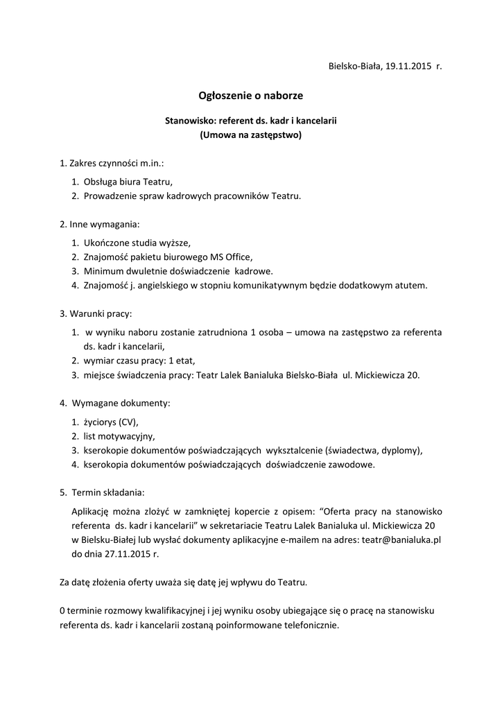 Bielsko-Biała, 19.11.2015 r. Ogłoszenie o naborze Stanowisko: referent ds. kadr i kancelarii (Umowa na zastępstwo) 1. Zakres czynności m.in.: 1. Obsługa biura Teatru, 2. Prowadzenie spraw kadrowych pracowników Teatru. 2. Inne wymagania: 1. 2. 3. 4. Ukończone studia wyższe, Znajomość pakietu biurowego MS Office, Minimum dwuletnie doświadczenie kadrowe. Znajomość j. angielskiego w stopniu komunikatywnym będzie dodatkowym atutem. 3. Warunki pracy: 1. w wyniku naboru zostanie zatrudniona 1 osoba – umowa na zastępstwo za referenta ds. kadr i kancelarii, 2. wymiar czasu pracy: 1 etat, 3. miejsce świadczenia pracy: Teatr Lalek Banialuka Bielsko-Biała ul. Mickiewicza 20. 4. Wymagane dokumenty: 1. 2. 3. 4. życiorys (CV), list motywacyjny, kserokopie dokumentów poświadczających wyksztalcenie (świadectwa, dyplomy), kserokopia dokumentów poświadczających doświadczenie zawodowe. 5. Termin składania: Aplikację można zlożyć w zamkniętej kopercie z opisem: “Oferta pracy na stanowisko referenta ds. kadr i kancelarii” w sekretariacie Teatru Lalek Banialuka ul. Mickiewicza 20 w Bielsku-Białej lub wysłać dokumenty aplikacyjne e-mailem na adres: [email protected] do dnia 27.11.2015 r. Za datę złożenia oferty uważa się datę jej wpływu do Teatru. 0 terminie rozmowy kwalifikacyjnej i jej wyniku osoby ubiegające się o pracę na stanowisku referenta ds. kadr i kancelarii zostaną poinformowane telefonicznie.