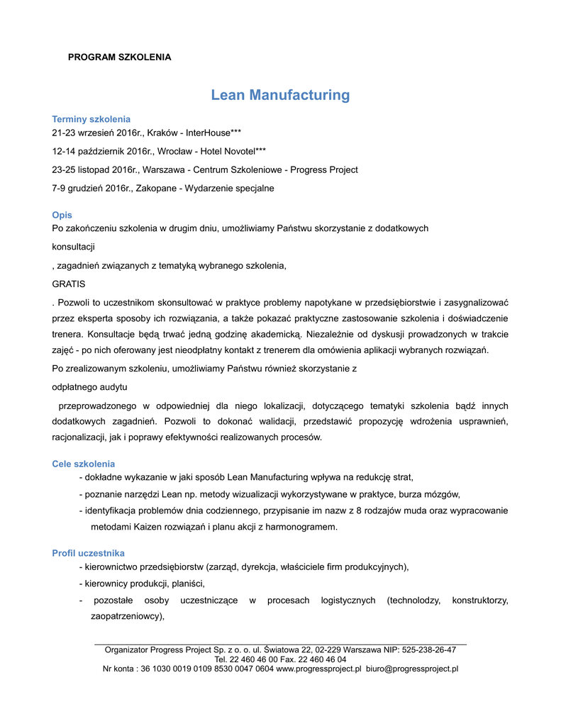 PROGRAM SZKOLENIA Lean Manufacturing Terminy szkolenia 21-23 wrzesień 2016r., Kraków - InterHouse*** 12-14 październik 2016r., Wrocław - Hotel Novotel*** 23-25 listopad 2016r., Warszawa - Centrum Szkoleniowe - Progress Project 7-9 grudzień 2016r., Zakopane - Wydarzenie specjalne Opis Po zakończeniu szkolenia w drugim dniu, umożliwiamy Państwu skorzystanie z dodatkowych konsultacji , zagadnień związanych z tematyką wybranego szkolenia, GRATIS . Pozwoli to uczestnikom skonsultować w praktyce problemy napotykane w przedsiębiorstwie i zasygnalizować przez eksperta sposoby ich rozwiązania, a także pokazać praktyczne zastosowanie szkolenia i doświadczenie trenera. Konsultacje będą trwać jedną godzinę akademicką. Niezależnie od dyskusji prowadzonych w trakcie zajęć - po nich oferowany jest nieodpłatny kontakt z trenerem dla omówienia aplikacji wybranych rozwiązań. Po zrealizowanym szkoleniu, umożliwiamy Państwu również skorzystanie z odpłatnego audytu przeprowadzonego w odpowiedniej dla niego lokalizacji, dotyczącego tematyki szkolenia bądź innych dodatkowych zagadnień. Pozwoli to dokonać walidacji, przedstawić propozycję wdrożenia usprawnień, racjonalizacji, jak i poprawy efektywności realizowanych procesów. Cele szkolenia - dokładne wykazanie w jaki sposób Lean Manufacturing wpływa na redukcję strat, - poznanie narzędzi Lean np. metody wizualizacji wykorzystywane w praktyce, burza mózgów, - identyfikacja problemów dnia codziennego, przypisanie im nazw z 8 rodzajów muda oraz wypracowanie metodami Kaizen rozwiązań i planu akcji z harmonogramem. Profil uczestnika - kierownictwo przedsiębiorstw (zarząd, dyrekcja, właściciele firm produkcyjnych), - kierownicy produkcji, planiści, - pozostałe osoby uczestniczące w procesach logistycznych (technolodzy, konstruktorzy, zaopatrzeniowcy), _________________________________________________________________________________ Organizator Progress Project Sp. z o. o. ul. Światowa 22, 02-229 Warszawa NIP: 525-238-26-47 Tel. 22 460 46 00 Fax. 22 460 46 04 Nr konta : 36 1030 0019 0109 8530 0047 0604 www.progressproject.pl [email protected] PROGRAM SZKOLENIA - liderzy zmian. Korzyści dla uczestników - poznanie narzędzi Lean np. 5S, KANBAN transportowy i produkcyjny, SMED, Poka-Yoke (metody wizualizacji wykorzystywane w praktyce), "one-piece flow", Yamazumi (równoważenie obciążeń), Heijunka (zrównoważone planowanie), - przedstawienie zasad przejścia od Push do Pull, - jak obniżać koszty poprzez wykorzystanie SPC (statystycznej kontroli procesów) w modelu Six-Sigma, - nabycie umiejętności usprawniania i optymalizacji procesów produkcyjnych - Focused Improvement (identyfikacja, analiza i mapowanie strumienia wartości - VSM), - zapoznanie się z możliwościami nowoczesnych narzędzi zarządzania produkcją, - poznanie metod TOC (np. Drum Buffer Rope, OPT), - poznanie możliwości najnowszych technologii logistycznych wykorzystywanych do skracania LT (czasu realizacji operacji logistycznych), jak np. RFID, - zrozumienie jakie funkcje można pełnić w trakcie transformacji do "Lean przedsiębiorstwa", - otrzymanie do użytku Mapy Lean, - dokładne wykazanie w jaki sposób Lean wpływa na redukcję strat, - praktyczne przedstawienie, jak "technicznie" mapować "strumień wartości". Metody szkolenia - wykorzystywanie do obliczeń dedykowanego oprogramowania, - większość rysunków dydaktycznych wykonywanych jest nie na flipcharcie, a na ekranie komputera (użyty tablet) co poprzez rzutnik daje wielokrotnie większe i czytelniejsze obrazy, które każdy uczestnik może zabrać po szkoleniu ze sobą w postaci plików graficznych, - przedstawienie złożonych tematów krok po kroku dostosowując tempo zajęć do możliwości uczestników, - w ponad 90% przypadków stosowanie "nieksiążkowych", przykładów opartych o doświadczenia autora zebrane na terenie Polski i Niemiec, - oparcie szkolenia o naprzemiennie wprowadzające wykłady, ćwiczenia indywidualne i warsztaty. Czas trwania 24 godziny dydaktyczne - 3 dni Program szkolenia Dzień I 1. Strategie produkcyjne i podstawy funkcjonowania efektywnego łańcucha dostaw: - różnice między Push a Pull, _________________________________________________________________________________ Organizator Progress Project Sp. z o. o. ul. Światowa 22, 02-229 Warszawa NIP: 525-238-26-47 Tel. 22 460 46 00 Fax. 22 460 46 04 Nr konta : 36 1030 0019 0109 8530 0047 0604 www.progressproject.pl [email protected] PROGRAM SZKOLENIA - wskaźnik P/D, - trzy główne strategie produkcyjne, - analiza "trzech wymiarów" - dla poszukiwania obszarów usprawnień, - "wyniesienie ponad perspektywę mojego działu" i zrozumienie na przykładach przyczyn powstawania wewnątrz firmy sprzecznych celów. - warunki i przeszkody ustalania spójnych wewnętrznie działań firmy. 2. Teoria ograniczeń - TOC i technika optymalnej produkcji - OPT, Goldratt: Praktyczne zastosowania teorii ograniczeń w identyfikacji "wąskich gardeł" produkcyjnych. Metody podporządkowania organizacji firmy "wąskiemu gardłu". - wpływ wąskiego gardła na kierunek harmonogramowania zleceń, - przykład wykorzystanie TOC i OPT w praktyce bezpośredniej sprzedaży zdolności produkcyjnych klientom, - metoda Drum Buffer Rope. 3. Gra - RUNDA 1: - zaprezentowanie tradycyjnego systemu wytwarzania. 4. Wprowadzenie do Lean Manufacturing: Historia rozwoju koncepcji Lean w oparciu o Toyota Production System. - twórcy i charakterystyka koncepcji produkcyjnych: Eli Whitney, Frederick W. Taylor, Henry Ford, Alfred P. Sloan aż do TPS, - przyczyny powstania TPS, - siedem źródeł strat w spojrzeniu Lean, - identyfikacja strat, - Focused Improvement, - prezentacja Mapy Lean (innowacyjne wsparcie zrozumienia koncepcji Lean - graficznie zaprezentowane powiązania między narzędziami i metodami). 5. Mapowanie strumienia wartości (VSM): Zasady analizy i budowy strumienia wartości. Modelowanie procesu cele